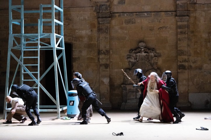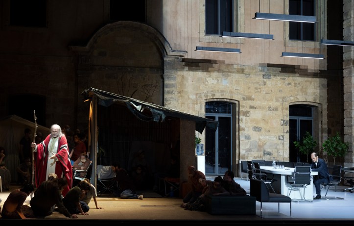 Kratzer sets the action in a courtyard that could be a part of any converted building in an ancient city such as this. On the one hand, one sees a corporate office, the world of the Pharaon occupied by people in suits; on the other, a refugee camp occupied by the Israelites. While virtually all the cast is dressed in modern dress, Moïse is dressed in typically biblical attire, as if Charlton Heston revived. This raises issues of faith and agency that I don’t think Kratzer fully engages with, given how prominent Moïse is to the story. Are we watching something allegorical here, or are we instead watching a literal interpretation of a cult led by a leader who inspires them through performing miracles dressed in biblical costume? My own interpretation of Kratzer’s view on this is that he sees the miracles – the plagues, the parting of the waves – as figments of the imaginations of people who desire better, but again, I’m not convinced he makes this explicitly clear to his audience.