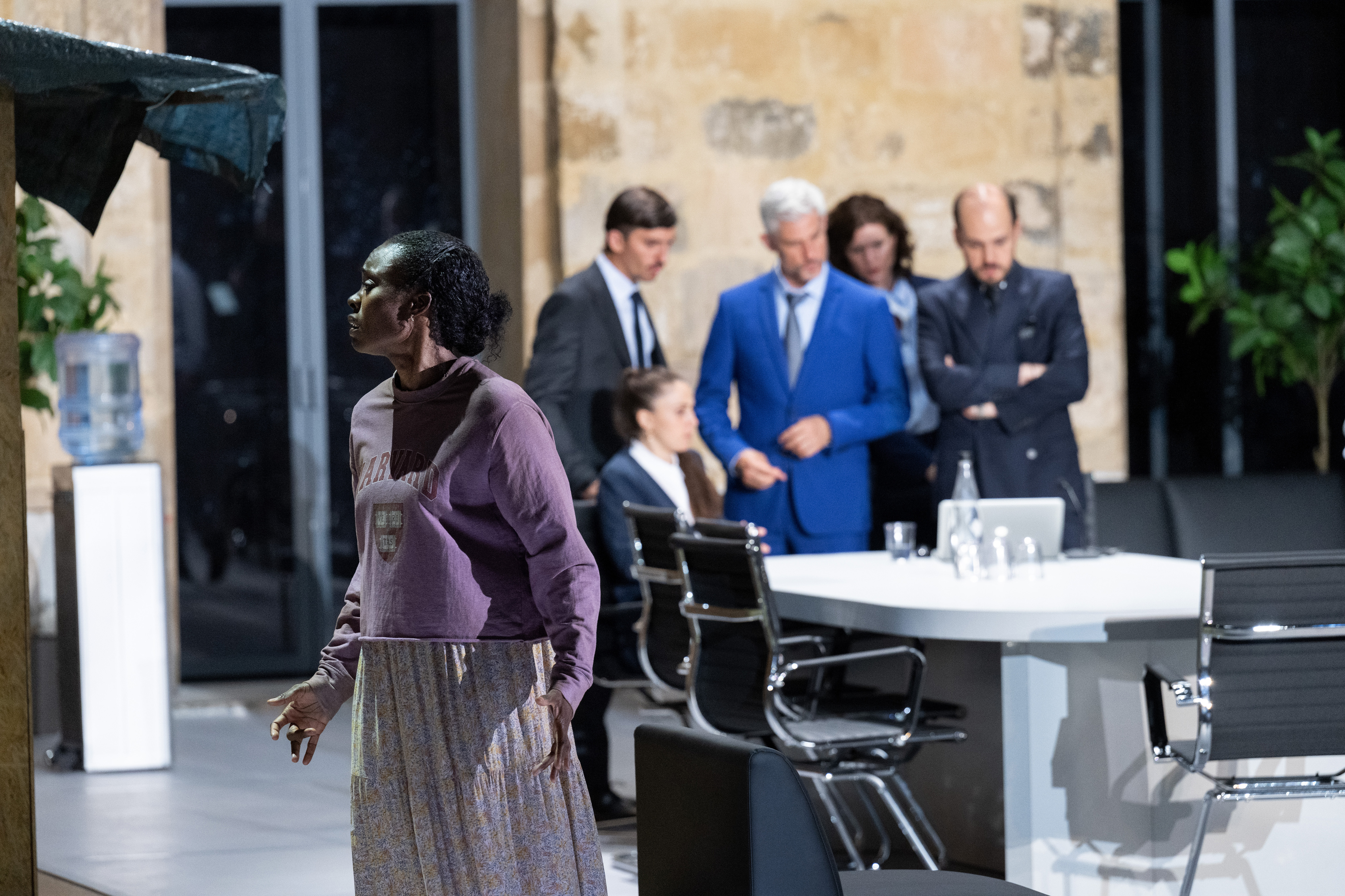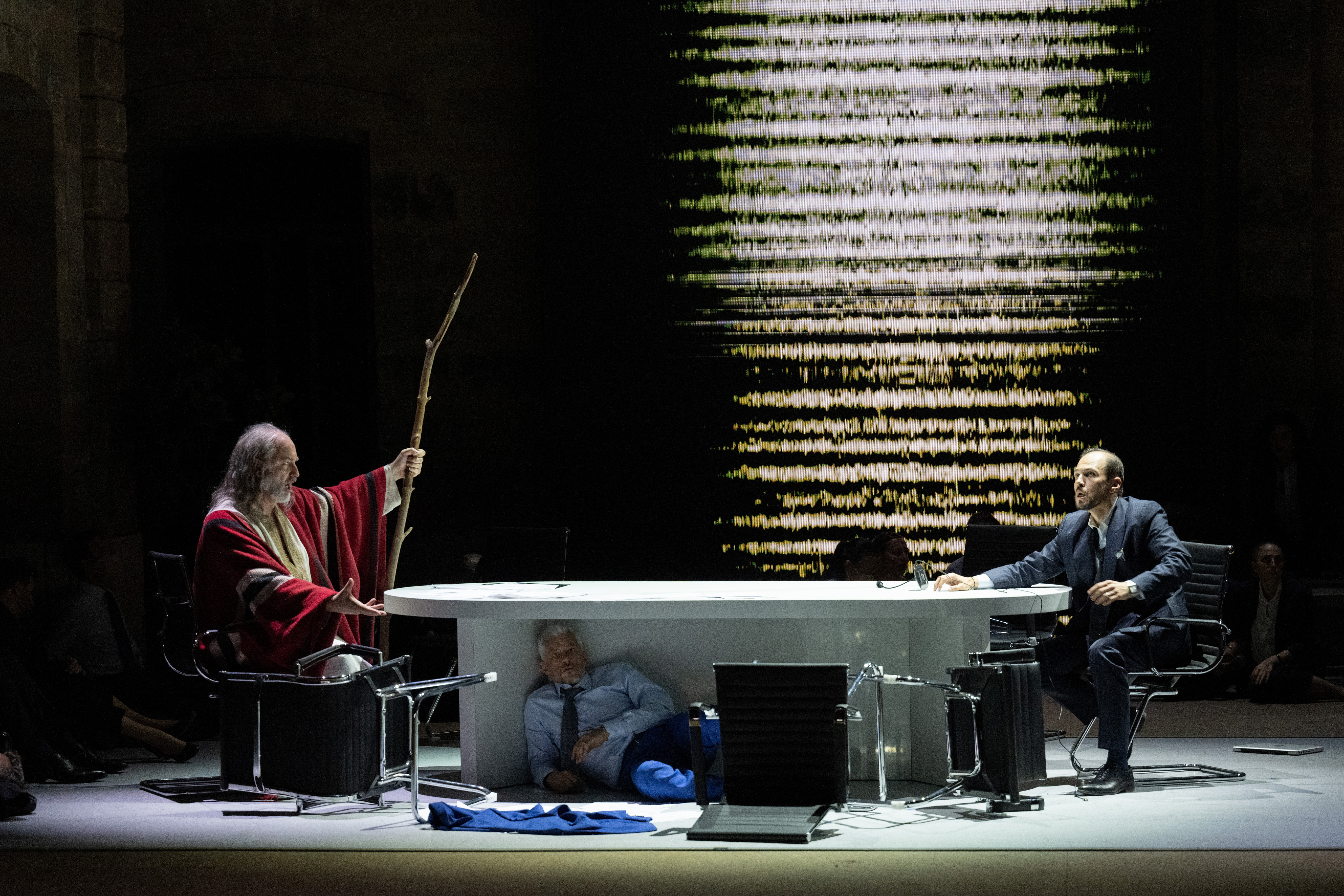 Kratzer sets the action in a courtyard that could be a part of any converted building in an ancient city such as this. On the one hand, one sees a corporate office, the world of the Pharaon occupied by people in suits; on the other, a refugee camp occupied by the Israelites. While virtually all the cast is dressed in modern dress, Moïse is dressed in typically biblical attire, as if Charlton Heston revived. This raises issues of faith and agency that I don’t think Kratzer fully engages with, given how prominent Moïse is to the story. Are we watching something allegorical here, or are we instead watching a literal interpretation of a cult led by a leader who inspires them through performing miracles dressed in biblical costume? My own interpretation of Kratzer’s view on this is that he sees the miracles – the plagues, the parting of the waves – as figments of the imaginations of people who desire better, but again, I’m not convinced he makes this explicitly clear to his audience.