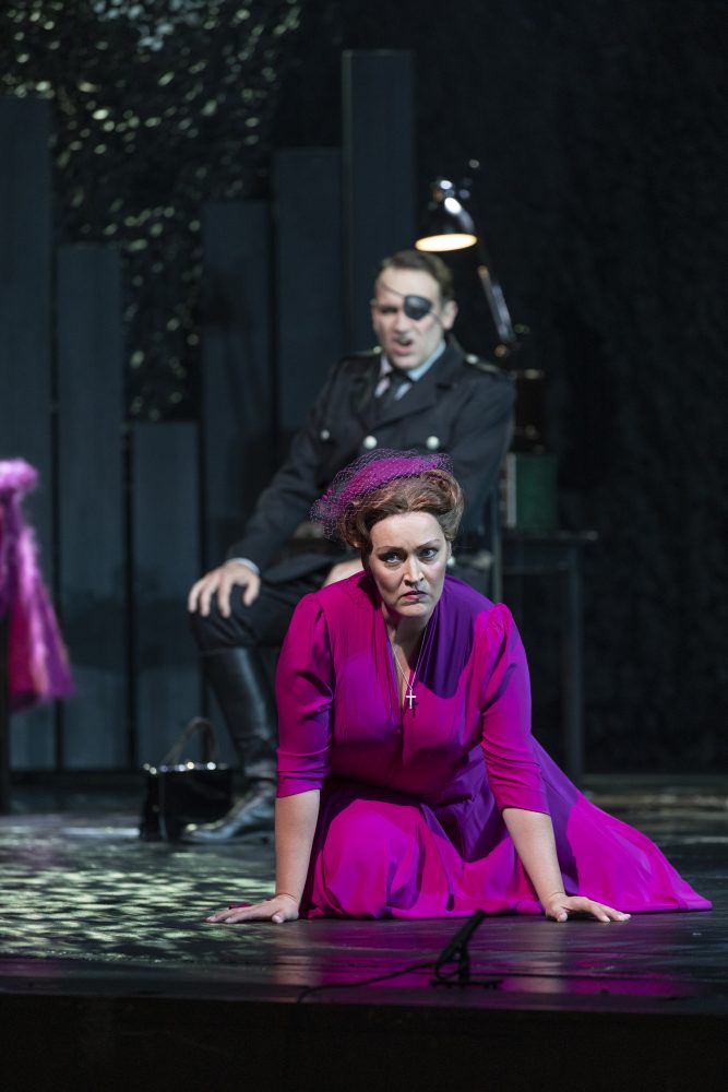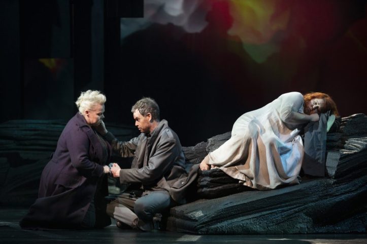 Kelo sets the action in what appears to be the early twentieth century.  In addition to the aforementioned religious house for Hunding, Wotan is dressed in miliary uniform and operates from what appears to be a bunker.  Mikki Kunttu’s sets can look rather flimsy – the shaking house as soon as someone moved, and the seemingly plastic rocks and ash tree feel a bit economically challenged, but clearly the budget had been blown on a proscenium-high ring of fire that provided a very impressive vista for the final scene.  That said, Kunttu produced some really impressive tableaux through his light designs, particularly at the end of Act 2 and in Act 3, which led me to wish that he and Kelo had instead used the power of the light design to create and maintain atmosphere more, particularly as the use of video here, providing additional perspectives to the stage and enhancing the music, made more of a potent impression than the plastic rocks.  That said, I left the theatre tonight with a much more positive impression of the direction and design than I did in Rheingold.  It really felt that Kelo had managed to bring out the depth of the relationships within.