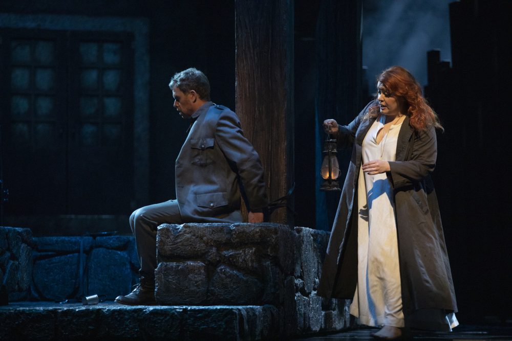 Kelo sets the action in what appears to be the early twentieth century.  In addition to the aforementioned religious house for Hunding, Wotan is dressed in miliary uniform and operates from what appears to be a bunker.  Mikki Kunttu’s sets can look rather flimsy – the shaking house as soon as someone moved, and the seemingly plastic rocks and ash tree feel a bit economically challenged, but clearly the budget had been blown on a proscenium-high ring of fire that provided a very impressive vista for the final scene.  That said, Kunttu produced some really impressive tableaux through his light designs, particularly at the end of Act 2 and in Act 3, which led me to wish that he and Kelo had instead used the power of the light design to create and maintain atmosphere more, particularly as the use of video here, providing additional perspectives to the stage and enhancing the music, made more of a potent impression than the plastic rocks.  That said, I left the theatre tonight with a much more positive impression of the direction and design than I did in Rheingold.  It really felt that Kelo had managed to bring out the depth of the relationships within.
