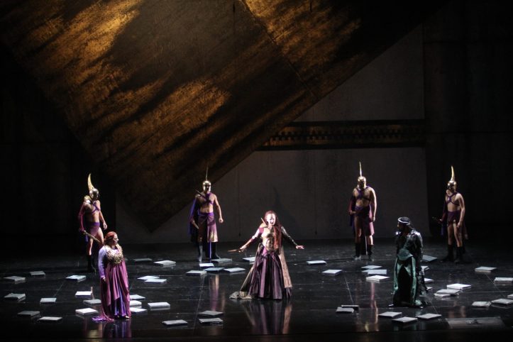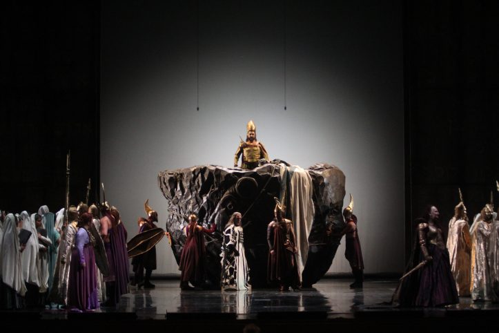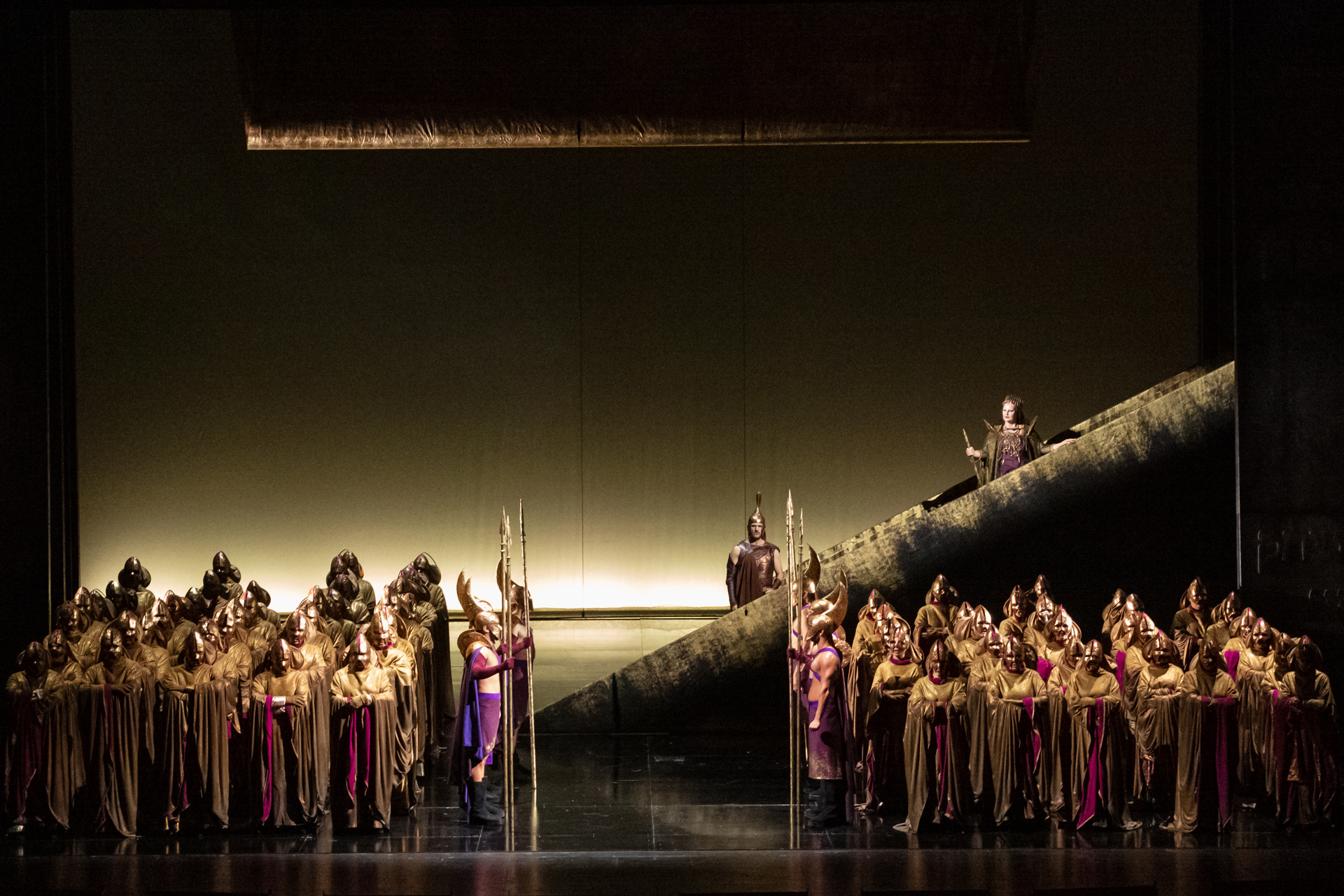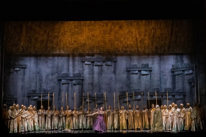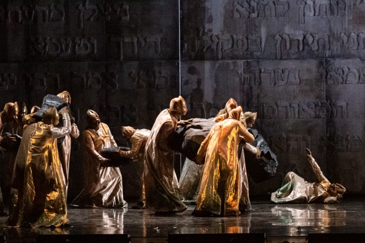 Andrea Cigni’s staging is of course familiar from Turin.  He takes a very conventional biblical epic view of the drama.  Clearly, a number of stage pictures were popular with audience members who couldn’t resist taking photographs of them.  The costumes still give us Cecil B DeMille epic meets sci-fi, though the bare-chested soldiers wearing harnesses, loincloths, and boots look like they got lost on the way to Babylonian night at the local gentlemen’s establishment.  The personenregie consisted of a considerable amount of standing and delivering to the front.  There were also some unintentionally risible moments, such as when the chorus members got into a brawl with the soldiers who were invading the temple.  The chorus was mostly parked on stage, or moved around as a block.  Although, I’m not sure that having them sway in formation during ‘va, pensiero’ added much to the proceedings.  Unlike in Turin, the impact of the chorus’s big entry was enhanced by having them sing at the front of the stage, filling the auditorium in a burst of sound.  Still, it’s an engaging enough framework for the action, particularly since the musical side of the evening gave much satisfaction.
