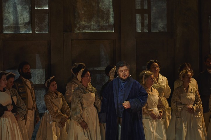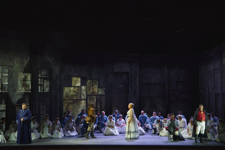 That said, Leo Muscato and his team have given us an extremely vivid and technically proficient staging, which provided us with an evening that had clearly been conceived as a coherent whole, from start to finish. The sets, by Federica Parolini, consist of a series of wood panel walls that can be pushed around into a number of flexible formations, in order to provide us with differing views on the action. They also contain a number of doors, through which the chorus was able to emerge in simultaneous formation. Throughout the evening, shadowy hooded figures were present. They provided both the ability to manipulate the walls by pushing and pulling them into formation, but also gave us a clue of what was to happen. Indeed, the significance of these figures became apparent as Silva reappeared at the end, Commendatore-like, surrounded by these figures of fate. This was a significant strength of Muscato’s staging in that he gave us a coherent theatrical argument from start to finish.