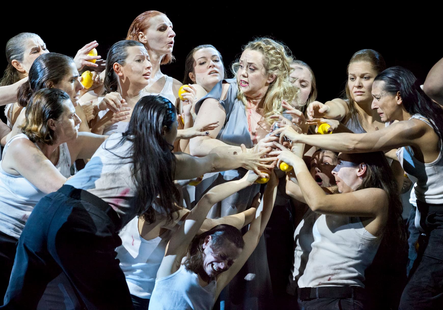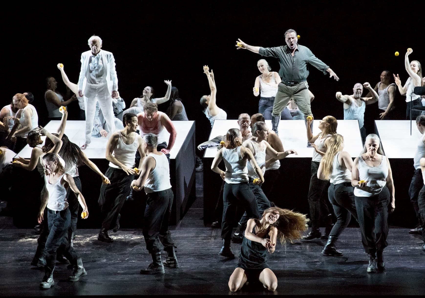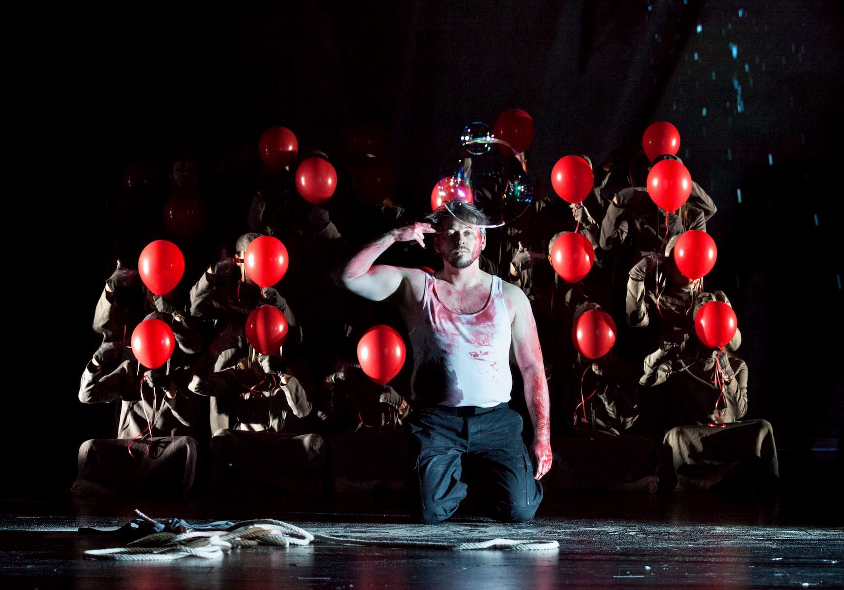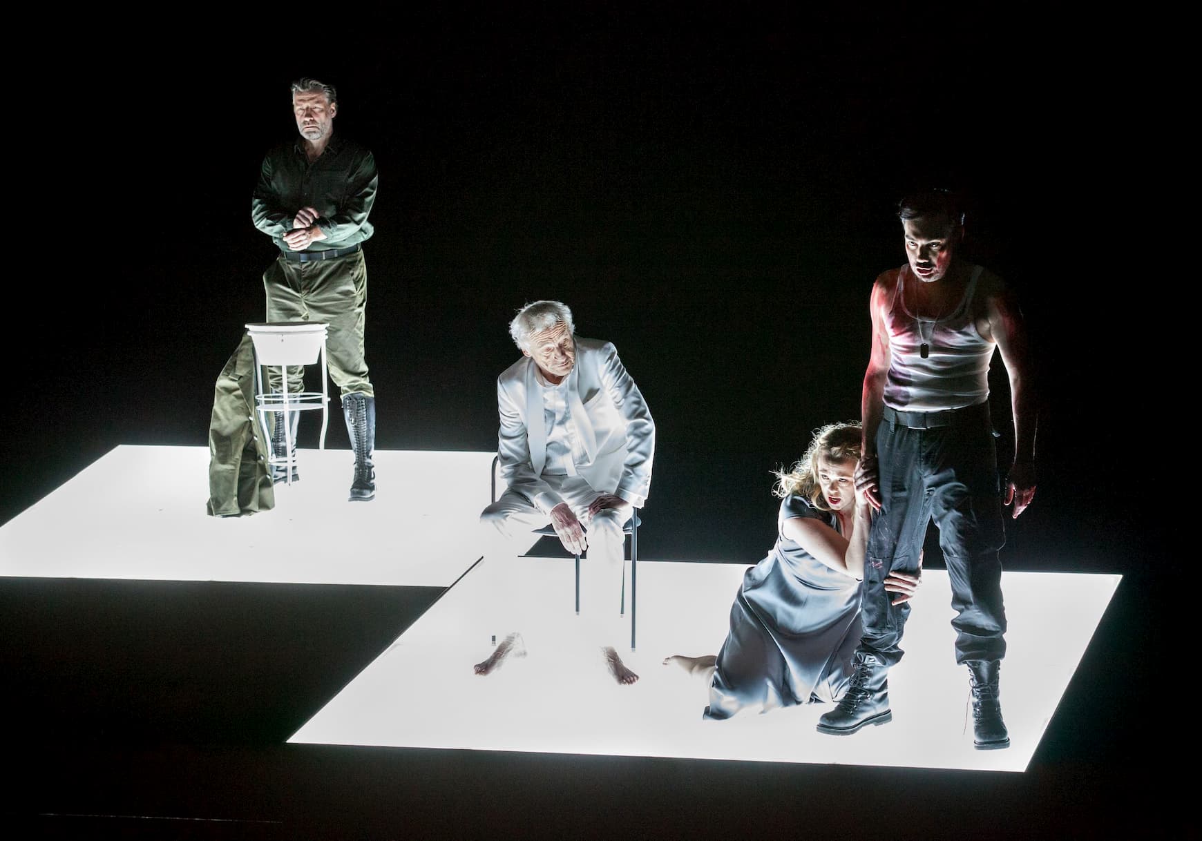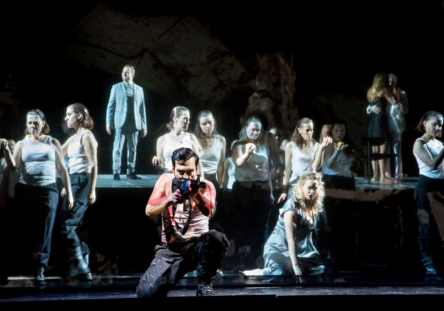 Certainly, Horáková Joly’s staging is as far from Leo Muscato’s Florentine one as it’s possible to get. In a note in the program book, Horáková Joly mentions finding this a work that was very difficult to get into, particularly as she found the titular character so unsympathetic. Her answer to this, was to interject dialogue, spoken in the Netherlandic tongue, written by Peter Verhelst and intoned by actor Johan Leysen, ostensibly to give the work a helping hand.