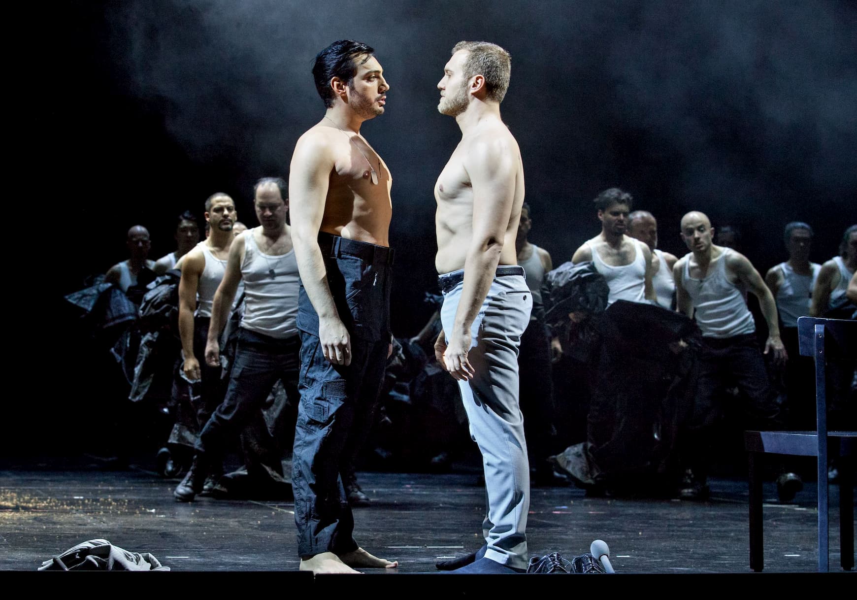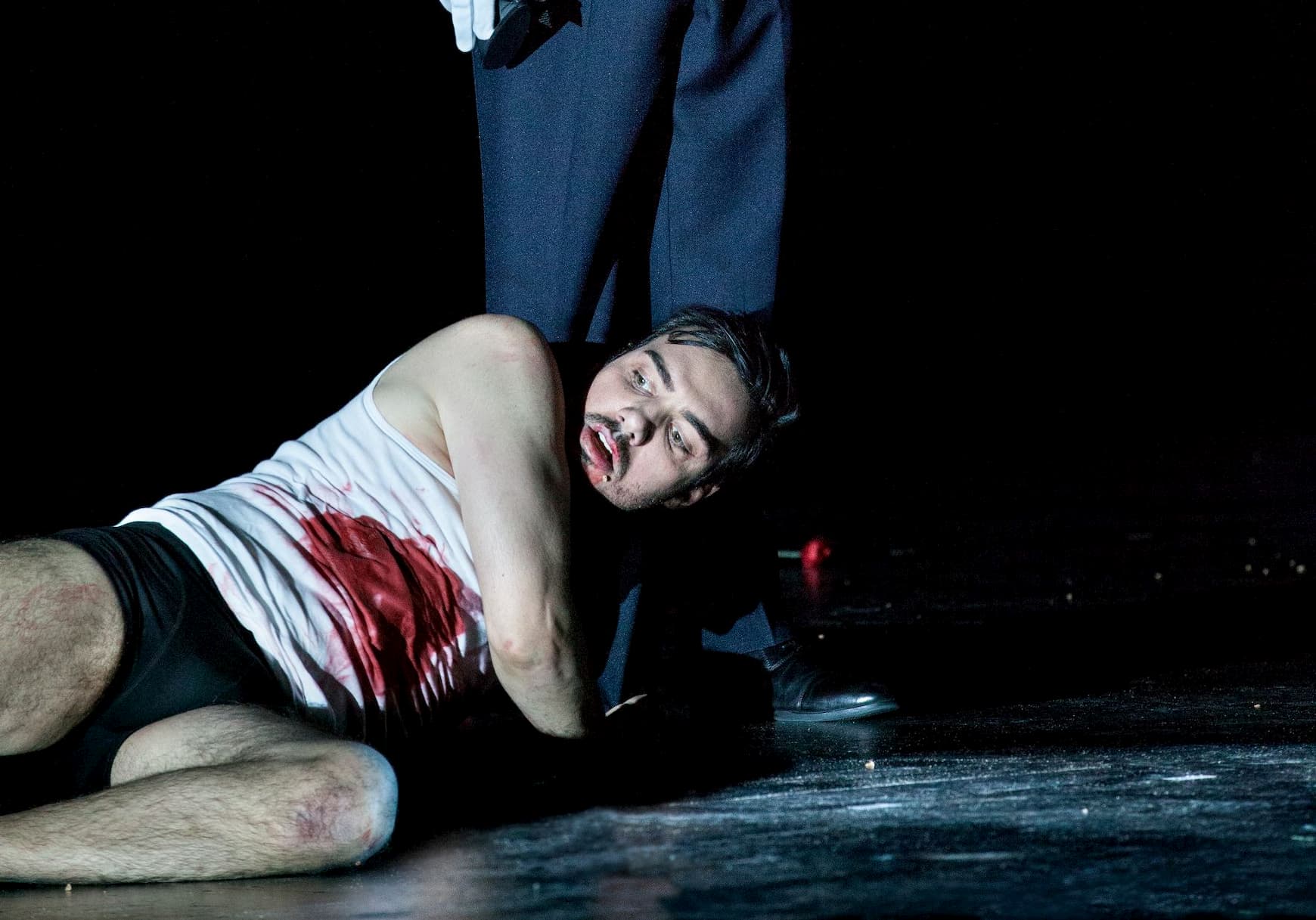 Horáková Joly gives us an insight into a man suffering from PTSD, carrying the weight of his life around with him. She makes this very much Ernani’s story, with the non-principal characters unnamed in the program book and described only by voice type, and focuses her drama on the three men and their love interest. It’s true that Horáková Joly’s staging is highly visual and the work of a vivid theatrical imagination. Leah Gordon’s Elvira made her entrance by being hoisted down from the flies, and later was compartmentalized outfitted in a red shift, gyrating within a box filled with flowers – presumably making a point of how she was in turn compartmentalized by Ernani in his mental world. War is ever-present in Horáková Joly’s staging, with video (Tabea Rothfuchs) sharing images of soldiers projected onto the front of the stage and on the backdrop. Many congratulations are due to the props team at OBV for managing to create a very life-like beating heart that was a present aspect of the final scene. Similarly, the shadowy figures incarnated by the chorus in the opening scene, made the drinking song a lot more threatening than suggested by the music, as if figures from Ernani’s mind coming into focus for him and for us. Certainly for me, the most striking image of the evening was Vincenzo Costanzo’s Ernani and Ernesto Petti’s Don Carlos, squaring off against each other just before the chorus sang ‘si ridesti il leon di Castiglia’, the two men staring into each other’s eyes while bare-chested, unsure if we were going to see them make out or fight each other, the latter which they then did as the chorus sang that celebrated number. The homoeroticism of that moment was absolutely tangible.