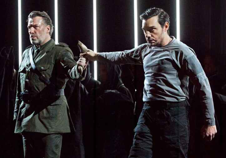 It’s true that the principals, and indeed Julia Jones in the pit, were absolutely on board with the production and it had clearly been fully and fluently rehearsed. Jones kept the musical side of things together, with playing and singing from the house forces of striking unanimity and precision of approach – impressively so for a first night. It did feel, however, that attack was rather soft-grained. Jones’ reading felt more of velvet than the blistering and utterly uplifting steel that James Conlon gave us in Florence. Her tempi felt earthbound, despite the rhythmic precision she obtained from the orchestra, and in the later acts, they had a tendency to sag, losing forward momentum and not helped by the insertion of the spoken texts. The quality of the orchestral playing was outstanding – string intonation was true, we got some characterful and eloquent wind playing, and the brass was solid all night. The chorus, prepared by Jef Smits, sang with wonderful unanimity of tone, finding a beauty in Verdi’s writing that could only be obtained with singing of such impeccable intonation and blend.
