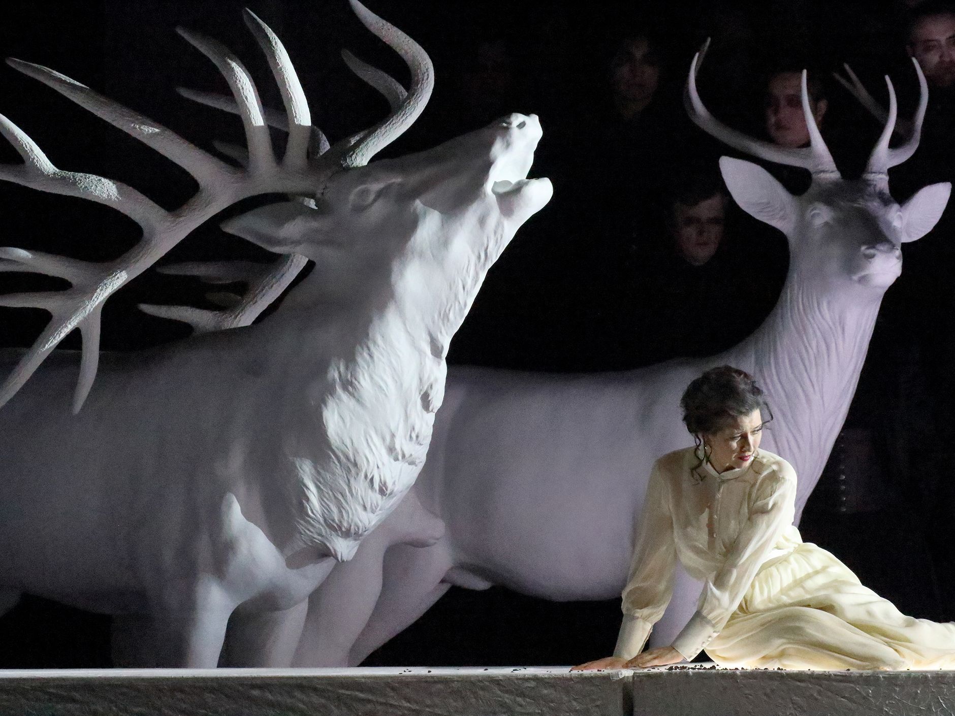 I masnadieri is one of the more rarely seen of the Verdi operas. It contains some magnificent music, but the relative lack of ensembles and choruses does make it rather dramaturgically challenging. The story is the usual tenor who takes up a life of crime, is in love with the soprano, but the evil baritone brother gets in the way. Perhaps in an attempt to over-compensate for the lengthy solo numbers, Johannes Erath opted to keep the stage constantly full of action. Similarly, perhaps in an attempt to illustrate the backstory, Erath showed characters sitting around a table when they were being sung about, or a coffin to remind us that Carlo had been declared dead by his evil brother. We saw the chorus being dragged along the stage on a moving platform, or models of stags populating the stage, or conifer trees. There was indeed a lot to look at. And yet, far too often direction of the principals consisted simply of them having to stand and sing arms outstretched to the front. While the additional detail had clearly been carefully choreographed, often it felt the principals were left to their own devices.