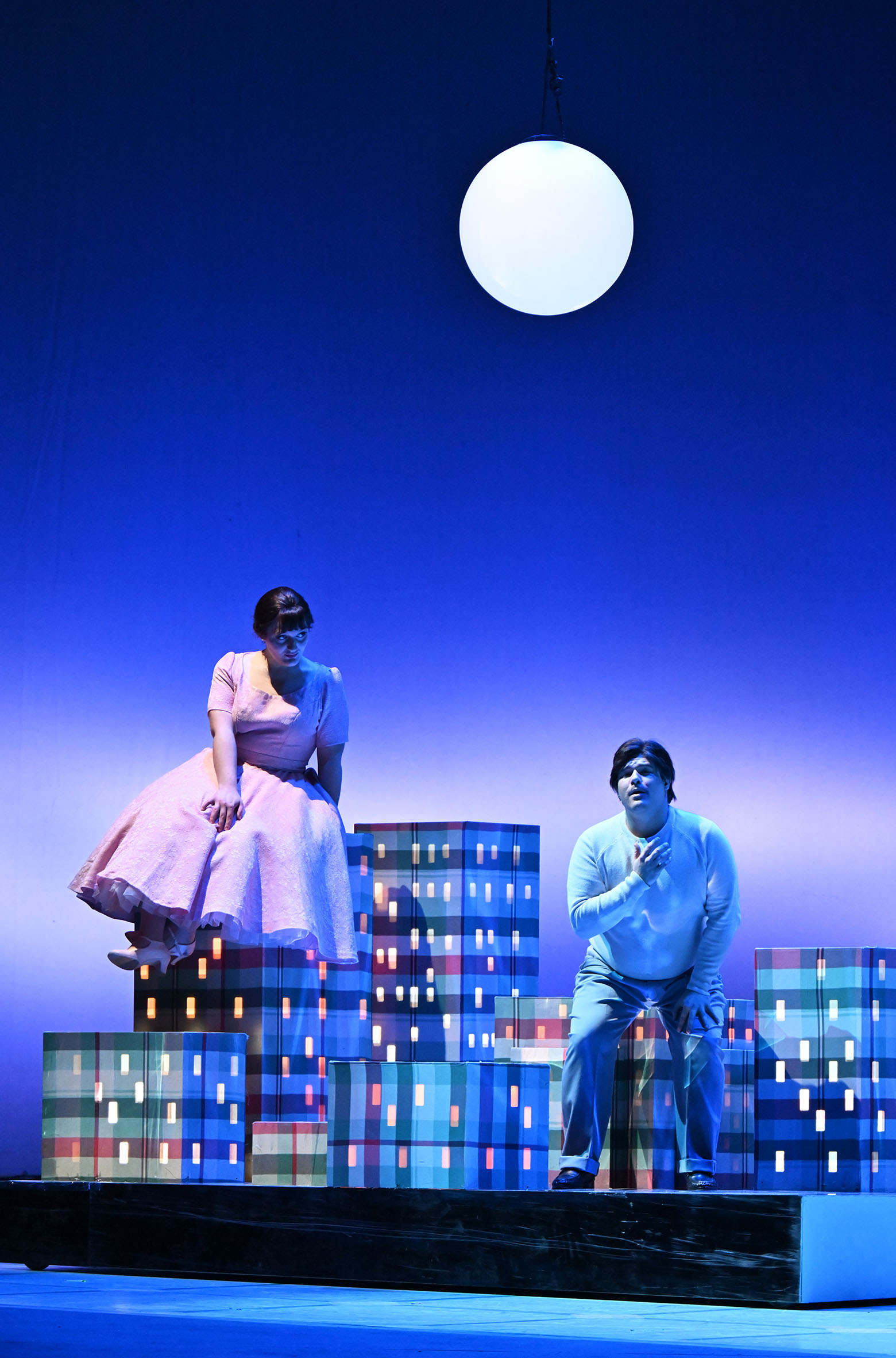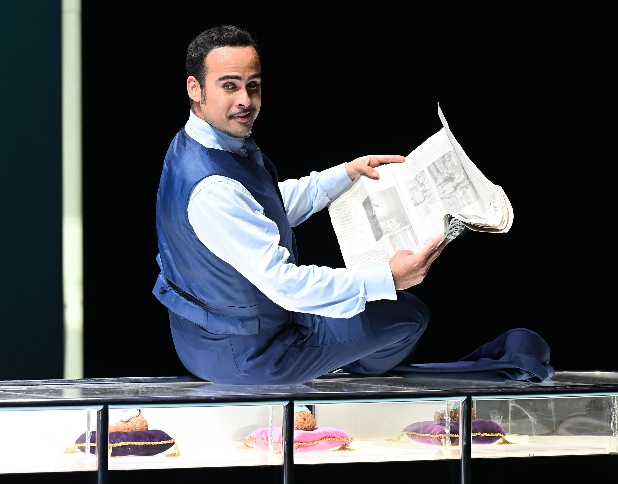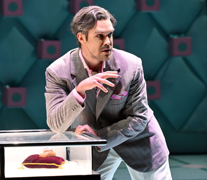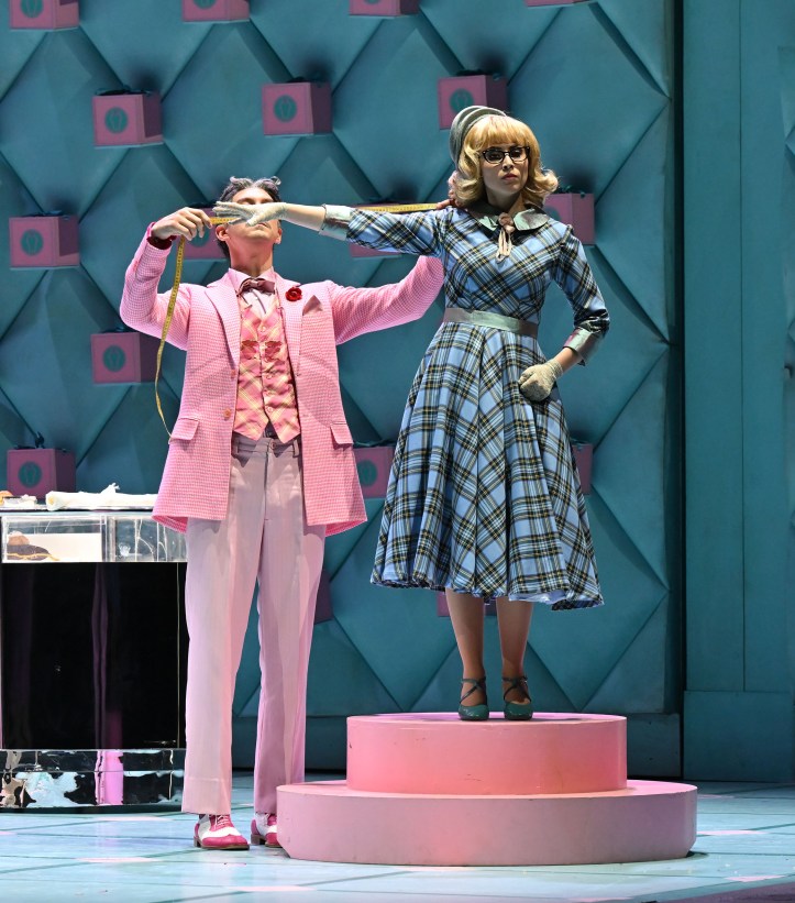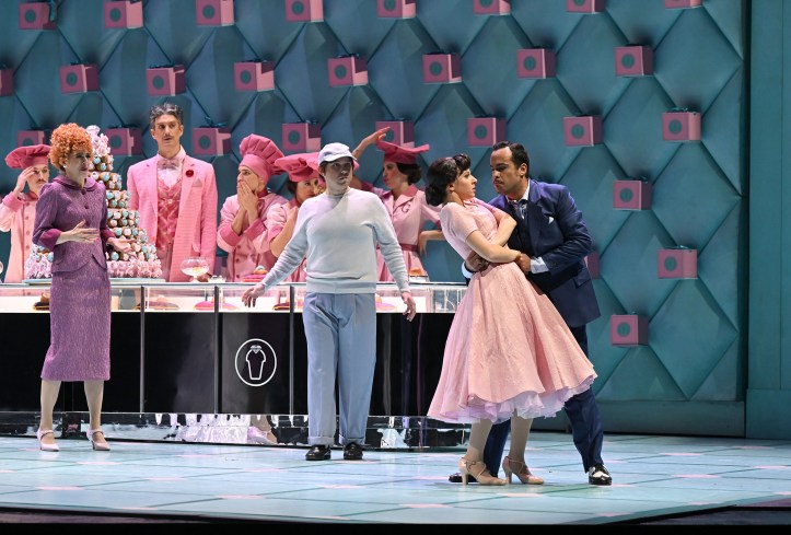 The first performance of ll matrimonio segreto in Parma took place in the carnival season of 1796, and it was quite apposite to see it at that same time of the year, two hundred and twenty-seven years later. Catalano has given us a bright and vibrant piece of theatre, one that has clearly been fluently rehearsed – impressively so since, due to indisposition, the cast today was composed of half the scheduled singers, with the remainder from the other half of this double cast run. Catalano’s staging is ideal Sunday afternoon escapism. He sets the action in New York City, in what appears to be either an upmarket pâtisserie, or a diamond store – or indeed possibly both. The sets and costumes, by Emanuele Sinsi and Ilaria Ariemme respectively, consist of bright pink and baby blue. For Act 1, Catalano populates the stage with constant action – a group of actors incorporate pastry chefs or customers, and an elderly lady with a prop dog is a constant presence. Said lady is revealed at the end to be a Fred Astaire figure in disguise – I’m not sure why, but it did make the closing ensemble lively. In Act 2, Catalano uses lighting (Fiammetta Baldiserri) quite sensitively to crate an optimistic dream world, where Carolina and Paolino imagine their escape together, where Catalano brings skyscrapers made of cake/diamond boxes into the middle of the stage, reminding us of the magical draw of big cities and of the Big Apple in particular.