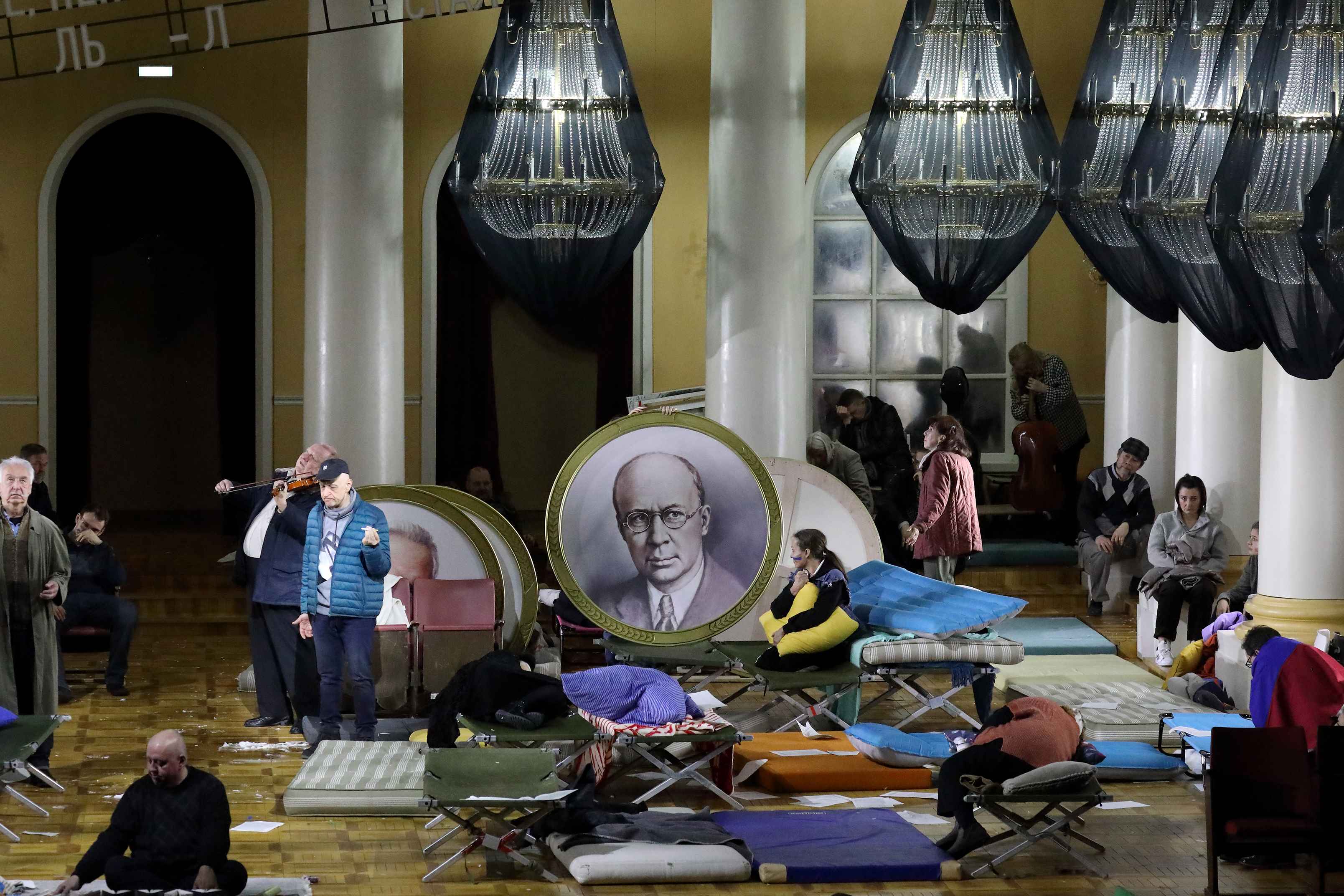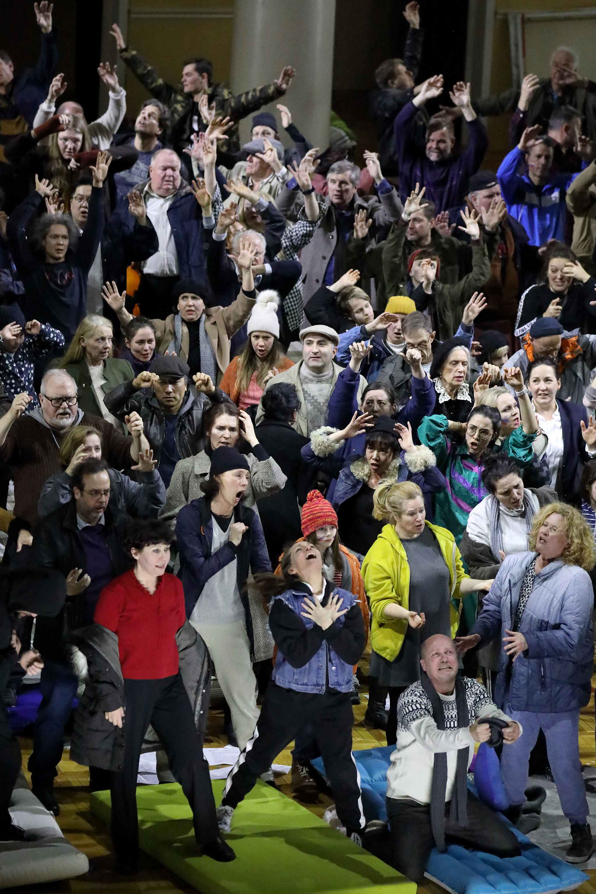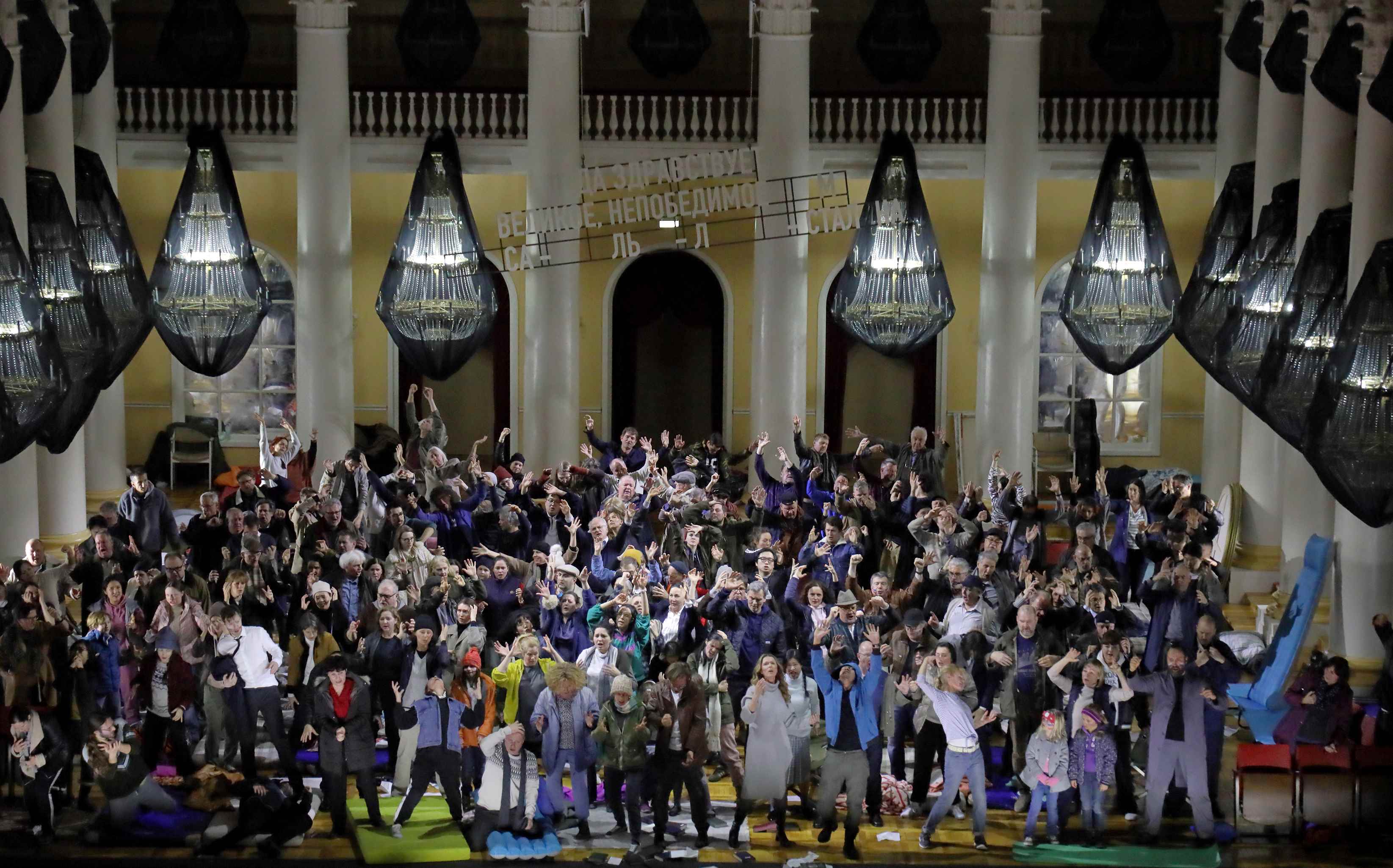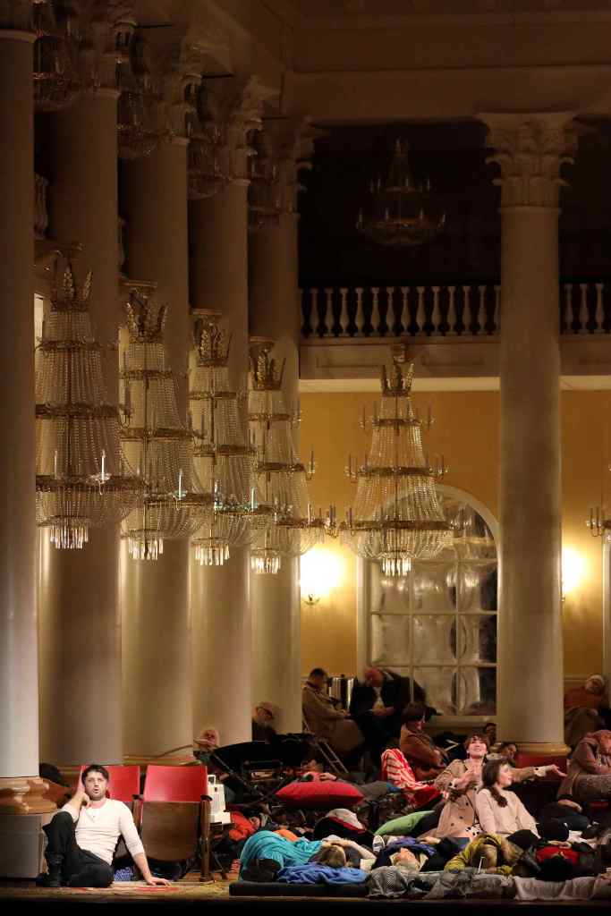 Tcherniakov sets the action within a single set, which looks like the grand lobby of a theatre, in which a populace shelters, repurposing some of the rows of chairs, or sleeping on makeshift matrasses on the floor. This is a place with no privacy and nowhere to hide. It also reminds us that war is a great societal leveller – people from all backgrounds are gathered within this space. Yet within this environment, Tcherniakov makes us question if what we’re seeing is real or imagined. There’s a bunker mentality here, that has war as something that happens outside, but is also rehearsed for inside – with athletes practising hand to hand combat in front of us. I found it intriguing how Tcherniakov compares Andrei’s initial thoughts of wanting better days, with the way that the people seemed to force themselves into a frenzy at the start of the War section. It was incredibly striking, the house was plunged into darkness, the curtain opened, and from nowhere a massed chorus of what seemed like hundreds yelled at us, all of them seemingly possessed with madness, extolling the aggression of war. It struck me that Tcherniakov was saying that war is something that is psychological, something that people can be whipped up into a frenzy over, but that is also highly illogical.
