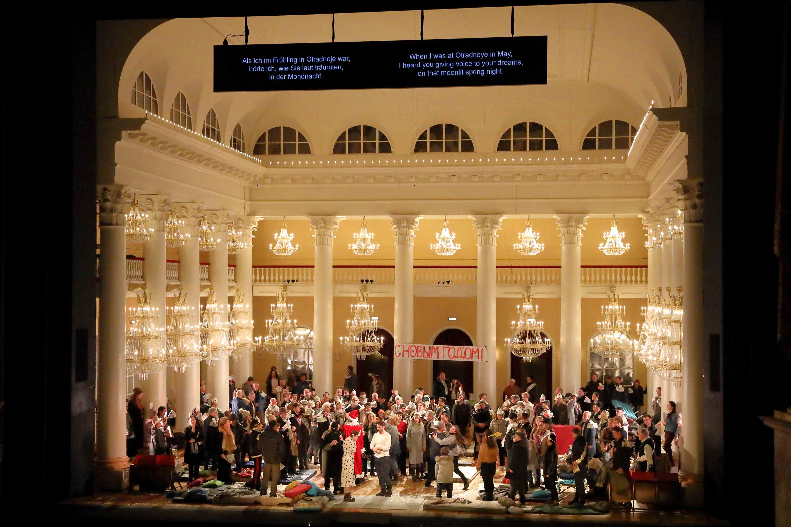 Mounting a new production of War and Peace at the current time raises significant issues and challenges. This is a work that consists of big patriotic scenes that call for the destruction of the enemy and the supremacy of the Russian people. Clearly, it would be problematic at a time when Russia is mounting a war against a sovereign nation to have the massed forces of the Bayerische Staatsoper unquestioningly intone these texts. At the same time, this is a work that allows a house like this to showcase the considerable talents of its ensemble, as well as the strengths of its superb chorus and orchestra. There was a need, then, to reconsider the work and to give us a meditation on the nature of war and its effects on people. Tonight’s director and conductor, Dmitri Tcherniakov and Vladimir Jurowski, took the decision to cut some of the more patriotic sections, either by having them played by the orchestra rather than sung by the chorus, and removed Scene 10 completely.