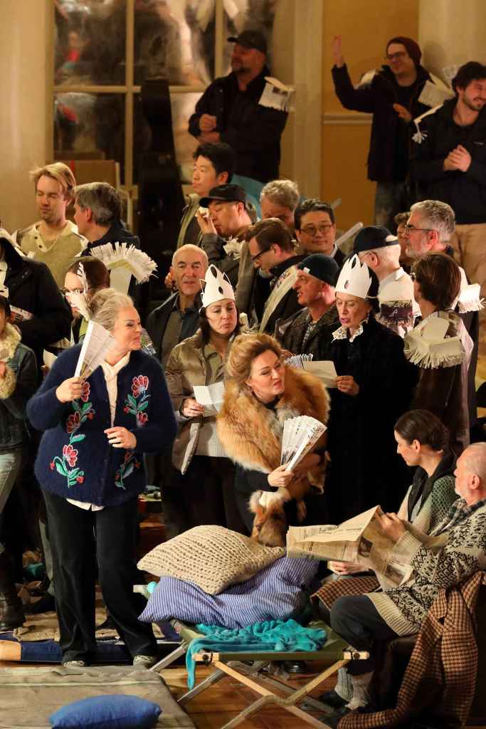 This was exemplified in the figure of General Kutuzov. Rather than a strong military general, he’s incarnated as a wandering man in a dirty vest, the reality behind his stirring words much more prosaic. It was interesting how he imposed himself on a floral memorial, putting himself above the people as an object to be honoured and worshipped – the reality of a war leader being a lot less glamourous than the folklore suggests. Tcherniakov’s staging is most certainly ambitious – the cast is enormous and every single person on that stage is a real, flesh and blood personality. The ambition is there and he rises to it, the intricacy of the personenregie with such an extensive group of people is seriously impressive. Yet, I left the theatre tonight in great admiration of the work of the production, but feeling rather cold. There’s an ambivalence to Tcherniakov’s vision. He gives us a people, imprisoned, who long for peace, yet are unable to stop the tide of war inflicted on them by others. In a way, he makes us aware of how susceptible we are to being manipulated and how war is something both psychological, yet also very tangible – not least in the cold-hearted killings on stage, but also in the death of Andrei, the dreamer who was lost to war.