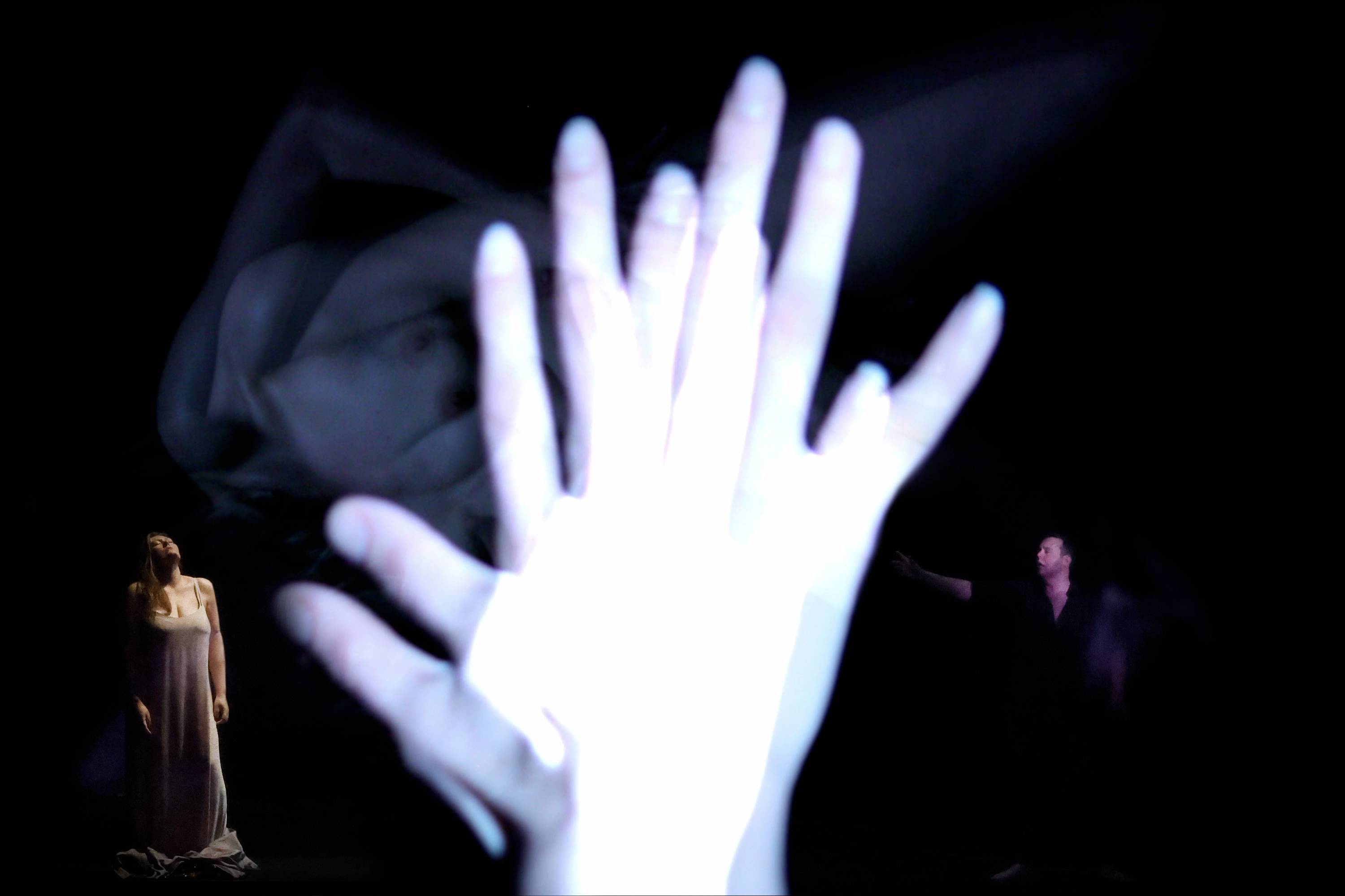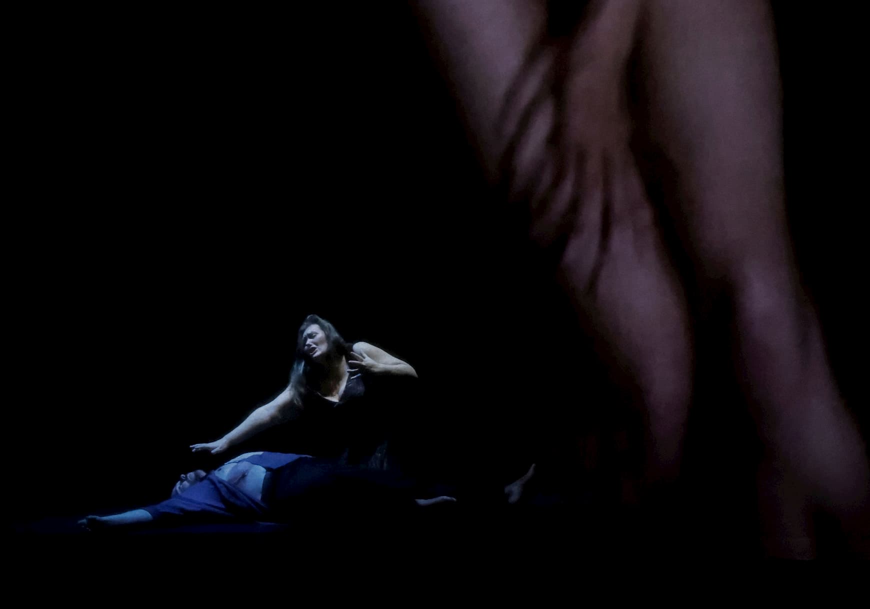 Indeed, a focus on the visual aspect is perhaps inevitable for a director with a background in filmmaking. The problem is that opera isn’t solely a visual medium – it’s the ultimate artform precisely because it combines text, music and physicality, in addition to the visuals. If one of these elements is lacking, the remainder has to work even harder. Grandrieux fills the proscenium with a video that takes us through the evening up until Tristan’s death. Behind it, the singers perambulate, barely lit, living in a shadowy world, where we can scarcely perceive their faces. Grandrieux shows us images of naked women. As Act 1 progresses, we see her breasts exposed on stage with the climax of the act coinciding with the big reveal of her lady garden. The video in Act 2 starts with images of an actual garden, while the love duet is accompanied by visions of a woman seemingly experiencing an epileptic fit. Throughout, it’s unclear if she’s in pain or ecstasy – though the sight of a hand over her vulva at the start of Act 2 suggests she may be digitally pleasuring herself to achieve the latter. I asked myself frequently whether these images did actually magnify and amplify this revolutionary score, or whether they simply distracted. In the case of Act 3, having the proscenium filled with the sight of a surging sea, with Tristan emerging from it, did indeed create an impression. On the other hand, the calmness of ‘o sink’ hernieder’ accompanied with the aforementioned images of a woman having an epileptic fit was less convincing. Yet, I can’t escape a feeling of déjà vu, given that Peter Sellars and Bill Viola did something very similar – and arguably more effective – twenty years ago.