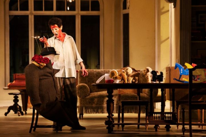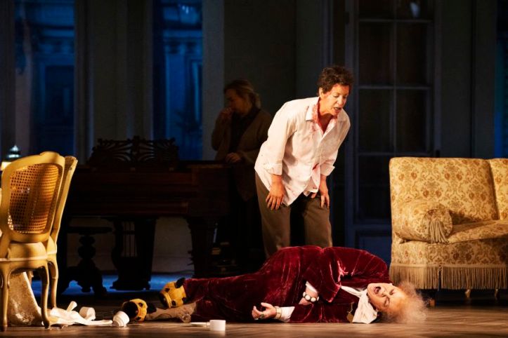 Tcherniakov sets the action in what appears to be a bourgeois apartment setting in the modern day. Both Elektra and Klytämnestra are obsessed and dysfunctional – the daughter completely obsessed with an apparent murder of her father, the mother drugged and unable to sleep. Yet I was left questioning whether Elektra was mourning an actual person, or whether she instead was full of delirium from the start. Seeing the opening scene with the maids discussing around the table with Klytämnestra, with even the fifth maid joining in taunting Elektra, suggested that her suffering was actually self-inflicted and the result of delirium. An impression that was enhanced by Elektra singing her big opening set piece as a gruesome ritual, assembling a mannequin, sitting him at the table, smearing herself with blood, and negotiating the approach to her first high C by lighting sparklers on said mannequin’s hat.