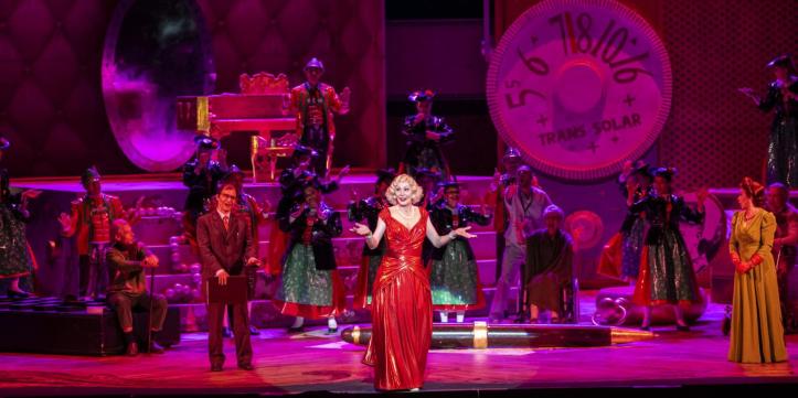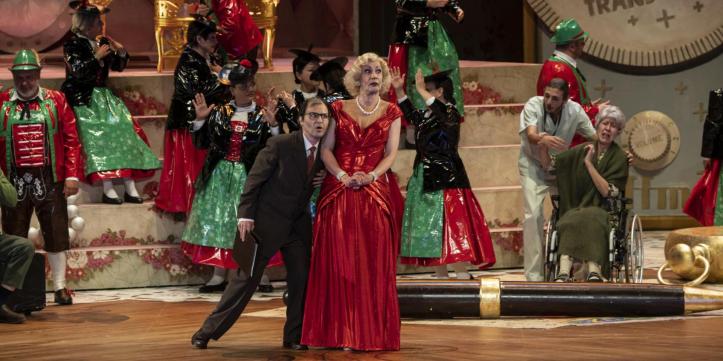 Simone Alberghini sang Sulpice in a warm and resonant baritone, the words always clear. The registers have parted company in Manuela Custer’s mezzo, who sang her music with a generous chestiness. I can’t say I understood much of what she sang, but surprisingly her delivery of the spoken dialogue was very clear. Guillaume Andrieux was an energetic Hortensius, throwing himself (literally) into the stage business and singing his music in a compact and firm baritone. The role of the Duchesse de Crakentorp was taken by renowned Torinese quick-change artist Arturo Brachetti, who impressed with three instantaneous – and very glamorous – costume changes. Brachetti also provided a musical number. It did feel that, combined with Pidò’s tempi, that his intervention went on slightly too long, but the audience absolutely loved it. The remaining roles reflected the excellent quality of the house, while Andrea Secchi’s chorus sang with commitment and unity of approach.