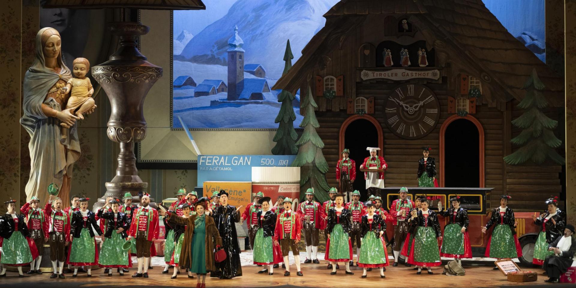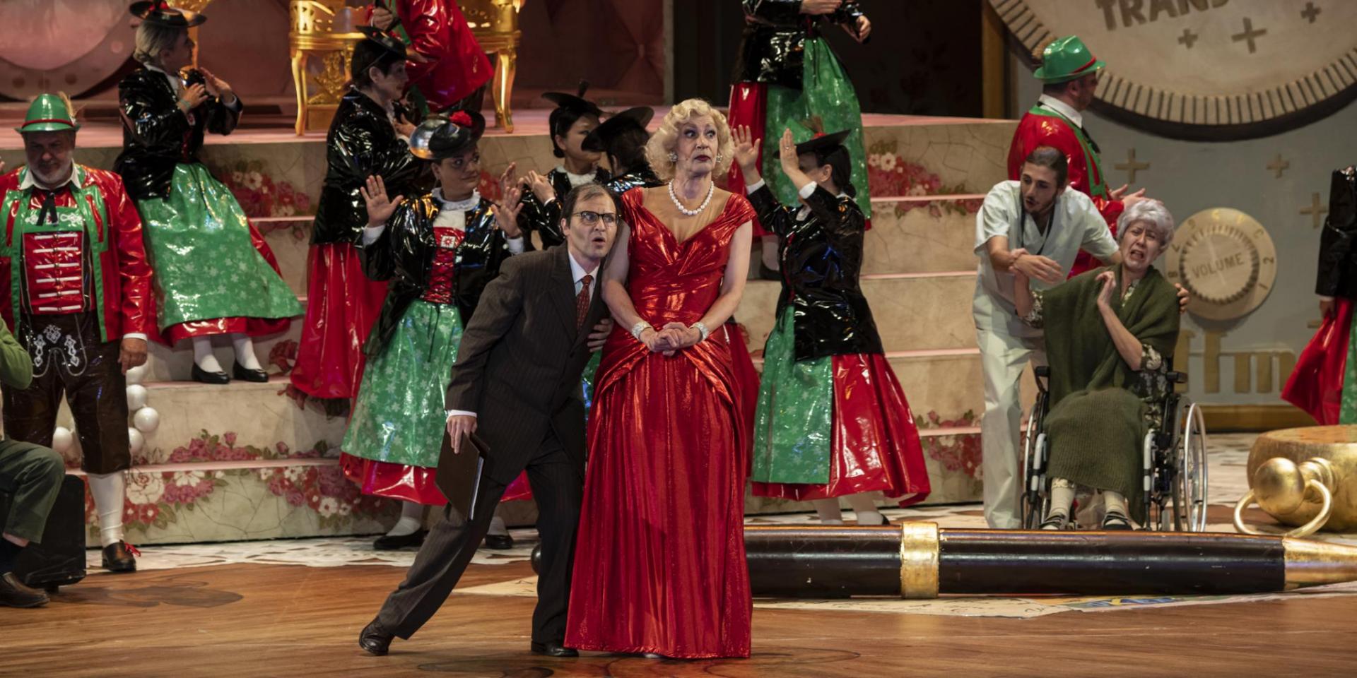 Barbe and Doucet’s staging opens with a movie that accompanies the overture. This shows an elderly lady, visited by what seem to be her children and grandchildren. As the camera pans around her room, we see memorabilia from her life on the mantelpiece – a medal, a photo, some pearls, as well as some drugs. The curtain rises to show a set with the contents of the mantelpiece increased in size to the height of the proscenium, while the PVC costumes of the chorus make them look like porcelain figurines that have come to life. It seems that Barbe and Doucet were intending us to see an aged Marie looking back on her life. Yet other than the opening movie, and a shot of the elderly lady at the closing curtain with some of the nursing home residents joining the wedding party, this theme of reflections on life feels underexplored. Instead, it feels like an idea explored briefly and then discarded, not to be explored further. That isn’t to say that the setting isn’t evocative, it just felt a bit half-baked.