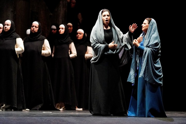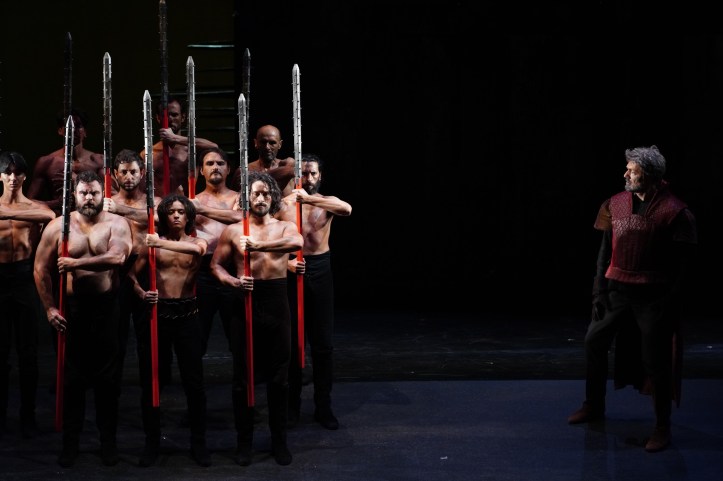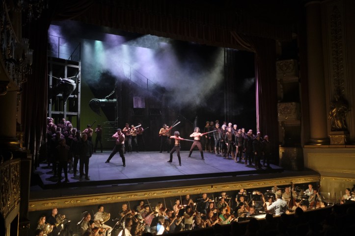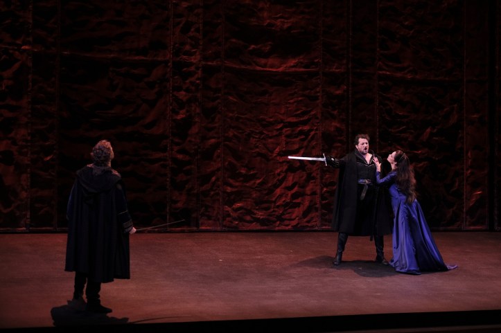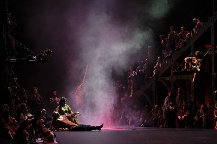 The personenregie was perfunctory. There was lots of emoting to the front and staring into the middle distance. That said, the stage energy increased exponentially in the initial Leonora, Manrico, Luna trio, with Ivan Gynzagov’s Manrico and Alessandro Luongo’s Luna indulging in some terrifically energetic sword fighting and, with the singers placed stage front, the impact of their singing was heightened – and indeed it raised the spirits tremendously. Vizioli makes considerable use of a corps of dancers to add visual interest, including some sword fighting ladies in the anvil chorus. In the soldiers’ chorus, Vizioli placed the chorus on each side of the stage, while shirtless men waved erect, skywards facing poles at each other. It wasn’t unpleasant to look at, but I can’t say I could understand why it was necessary.