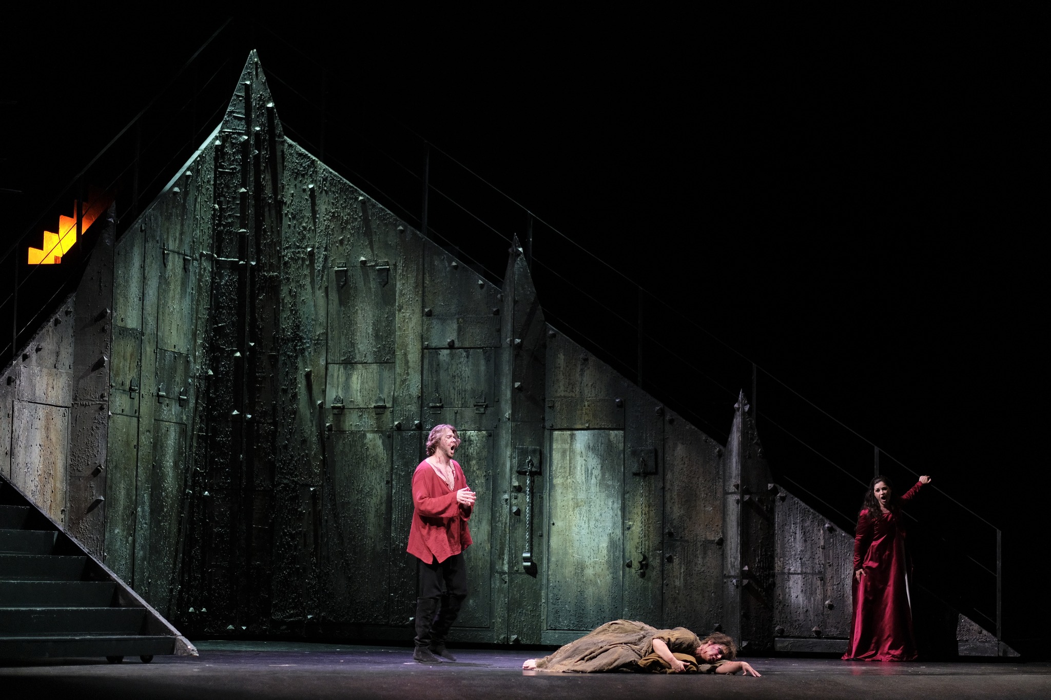 Vizioli’s staging certainly gives something to look at. The costumes, by Alessandro Ciammarughi, are full of long flowing dresses for the ladies and medieval looking garb for the gentlemen. There’s a symmetry to the sets, also by Ciammarughi, that makes for interesting stage pictures. The set is composed mainly of two structures that are set to the sides of the stage for the most part, with stairs for characters to climb, while they are brought together to provide an enclosed space for the prison of the final scene. What this means, however, is that for much of the evening, the singers don’t have much in the way of acoustic support. The effect was heightened because Vizioli puts so much of the action in the middle of the stage, which meant that the impact of the singing wasn’t always optimal – Cristiana Oliveira’s Leonora suffered from this in her opening scene, while the chorus lost impact in the anvil chorus due to being placed so far back, combined with an enthusiastic anvil player at the front side who made an deliciously rowdy noise.