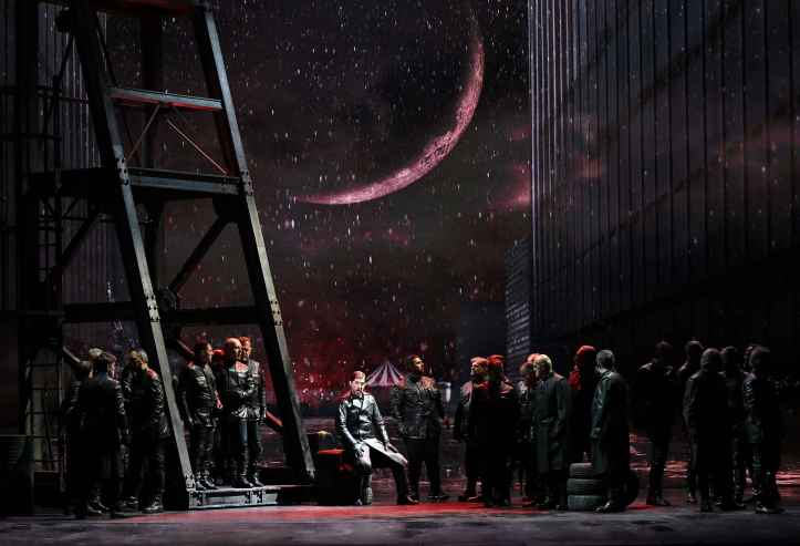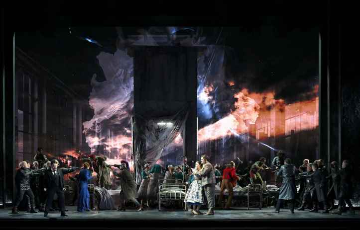 Tonight’s staging was confided to Davide Livermore. It offered many of his usual trademarks, as well as the strengths and weaknesses one has come to expect of his work. He sets the action in what appears to be an urban dystopia. Rather than significant sets, he uses video, by D-WOK, with visuals accompanying the music and establishing atmosphere, while a few items of stage furniture add additional visual interest. Luna apparently lives in a skyscraper, while the gypsies live in a circus hut. Leonora sings her Miserere outside what looks like a university library. On top of these images of locations, Livermore shows these settings, whether buildings or city vistas, going up in flames or being consumed by water. Is this his way of showing us how passions can be all-consuming? Or does he view the work as an allegory of global warming? I can’t say I know the answer. The video was, however, extremely fluently executed.
