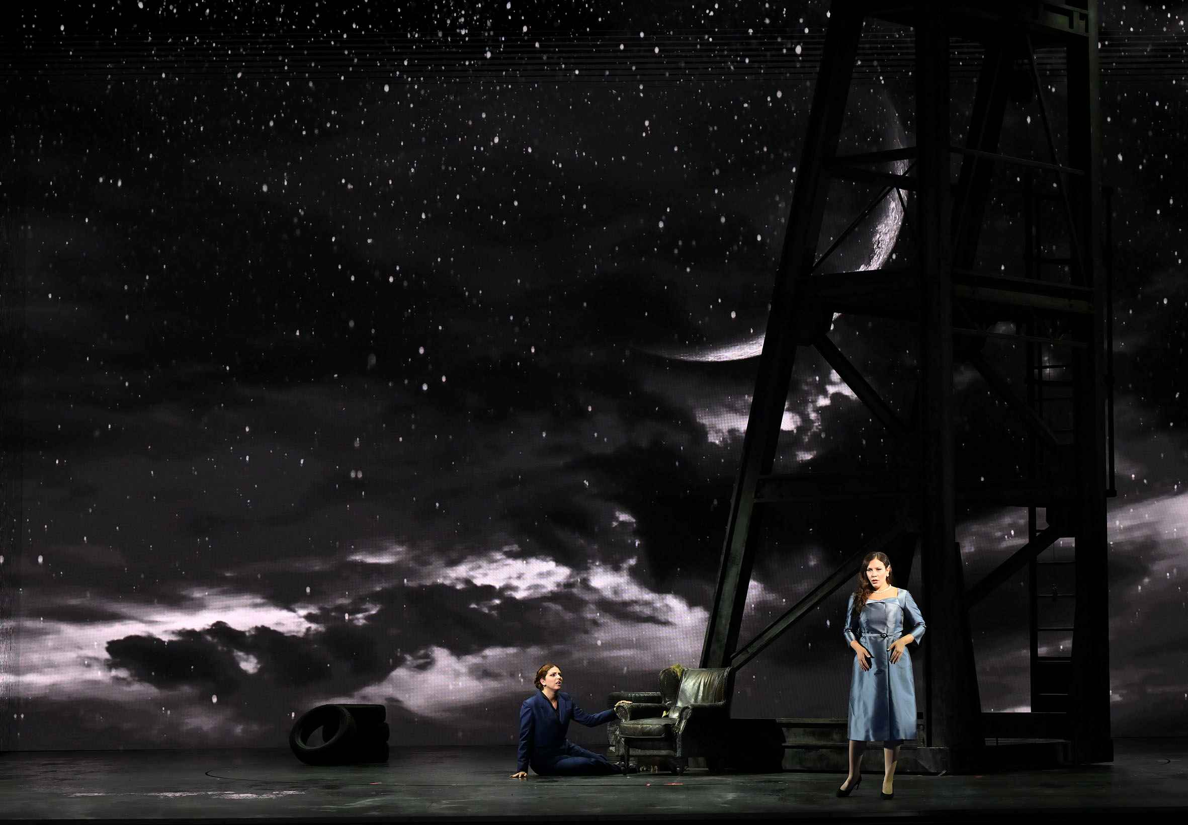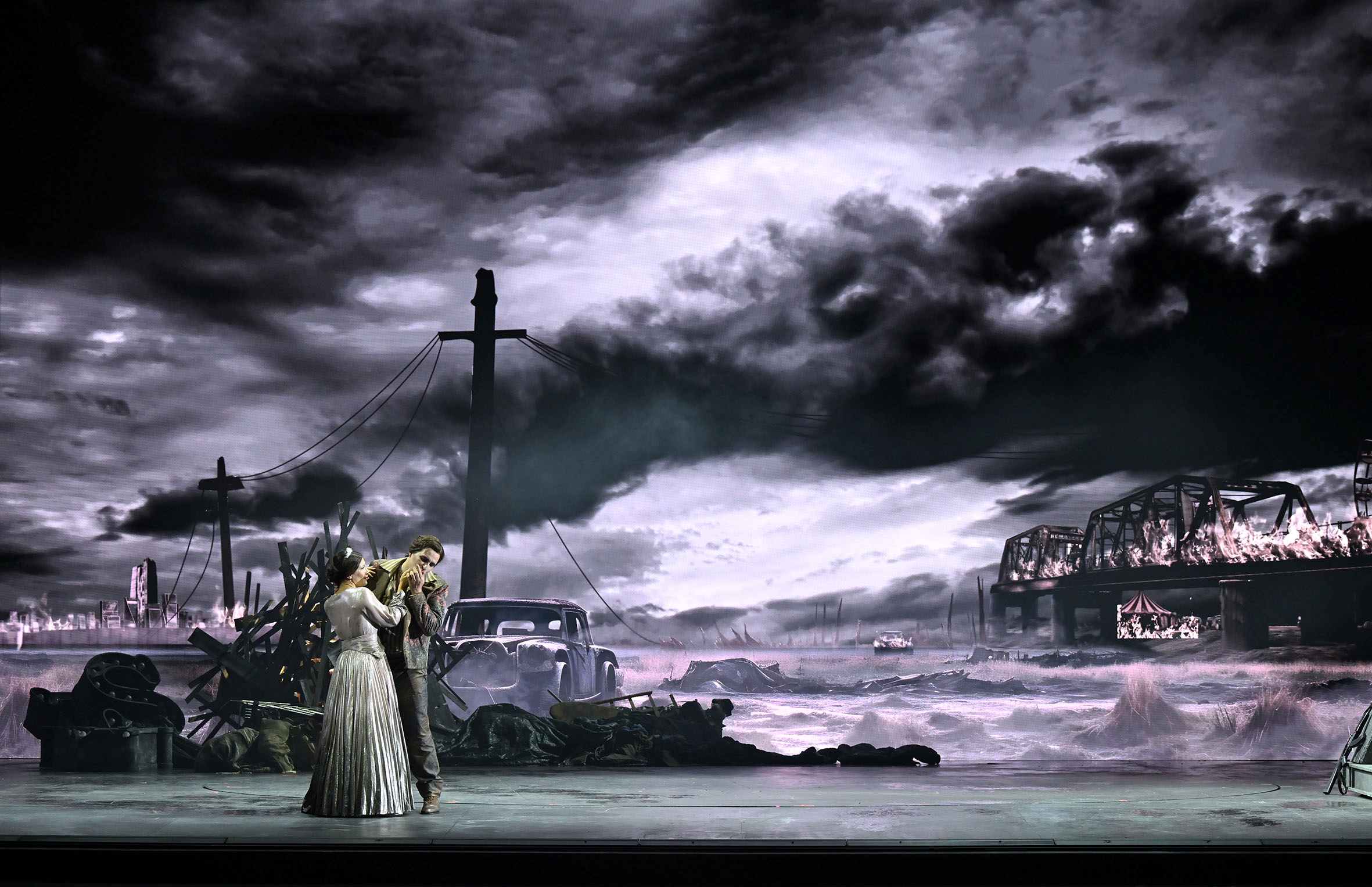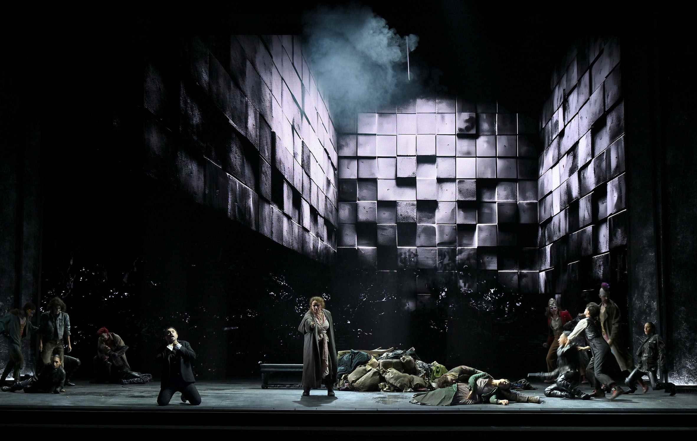 Tonight’s staging was confided to Davide Livermore. It offered many of his usual trademarks, as well as the strengths and weaknesses one has come to expect of his work. He sets the action in what appears to be an urban dystopia. Rather than significant sets, he uses video, by D-WOK, with visuals accompanying the music and establishing atmosphere, while a few items of stage furniture add additional visual interest. Luna apparently lives in a skyscraper, while the gypsies live in a circus hut. Leonora sings her Miserere outside what looks like a university library. On top of these images of locations, Livermore shows these settings, whether buildings or city vistas, going up in flames or being consumed by water. Is this his way of showing us how passions can be all-consuming? Or does he view the work as an allegory of global warming? I can’t say I know the answer. The video was, however, extremely fluently executed.