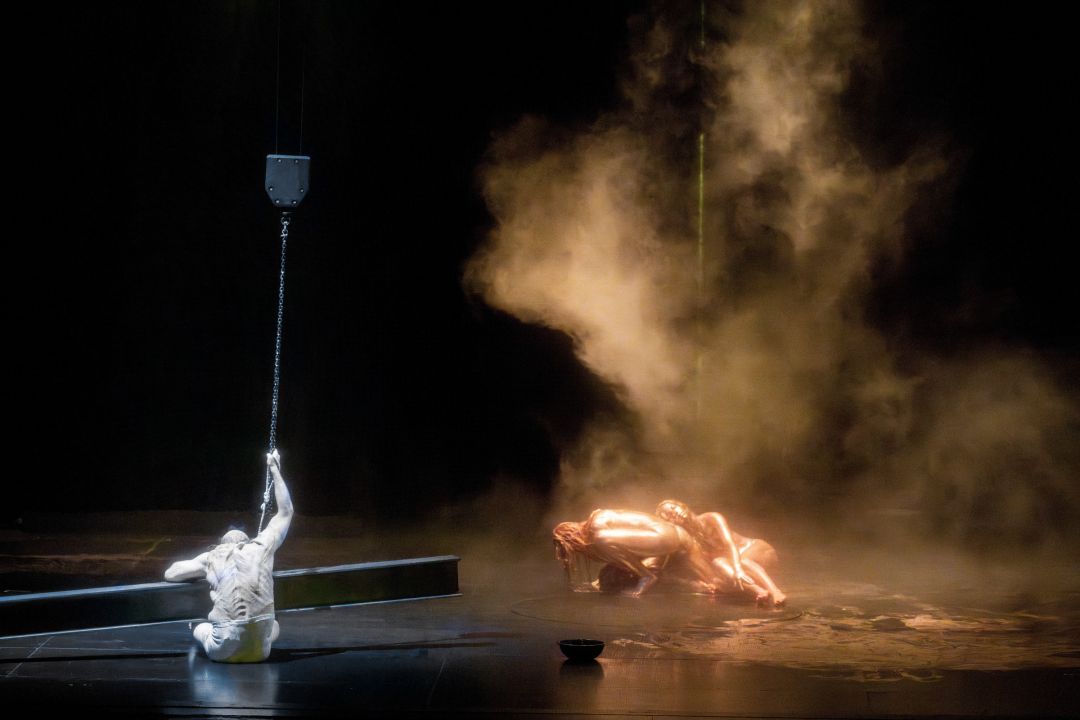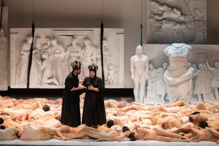 And yet, I can’t help but feel that beyond the visual audaciousness, Castellucci keeps us somewhat at arm’s length from the characters and their motivations.  He asks so much of his singers physically and it’s a real credit to them that their vocalism is so secure throughout.  Scott Hendricks’ Alberich is suspended in the air by his wrists during his confrontation with Wotan and Loge, completely naked other than some black paint to preserve his modesty.  Indeed, I found how he tarred Wotan with the black paint to be particularly striking, as if passing on the curse.  Similarly, there was no rainbow bridge here.  Rather, the gods fell backwards one by one into a pit in the ground.  For a spectator it was terrifying to watch – even if it made for a highly persuasive image of following Wotan’s lead into a place of unseen darkness.  The extras, crawling around the floor, dragging one of the marble sculptures on top of them, was also rather harrowing to watch.  One can only imagine the sheer number of health and safety discussions the creative team would have had with the stage technicians.  That said, what is immediately apparent is that Castellucci not only has that rich theatrical imagination and the technical means to realize it, but he’s also able to bring his cast onboard to push themselves above and beyond to give such physically uninhibited performances.