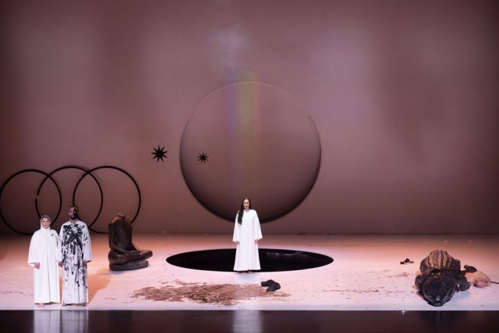 Castellucci’s visual world here is timeless, seemingly combining ancient Greece with sci-fi futurism.  In a way, it feels that Castellucci is universalizing the narrative, as if to say that this is a story that has been repeated through history and will continue to be repeated long after we’ve gone.  Our first glimpse of Wotan, is hearing the Valhalla motif with him standing in a pristine white room, surrounded by Grecian sculptures, the floor full of naked extras over whom the gods walk.  Castellucci seems to be making a deeper point here about the corruption of resources – how power is obtained by those at the top literally stepping over those at the bottom.  I found how he illustrated the Rheingold itself as a kind of ephemeral dust, that the Rhinemaidens caught in a bowl yet then morphed into water, was also highly compelling.