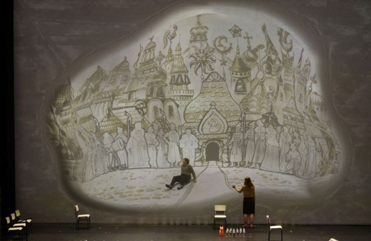 As the evening evolves, we then see the son take over the role of Gvidon. What Tcherniakov, together with Volkov, achieves is nothing short of miraculous. They somehow manage to take us into Gvidon/the son’s mind, showing us the wonder of how he communicates, thereby bringing to life the reality of those among us who are neurodivergent to varying different degrees. Volkov is tireless on stage, constantly moving, bringing to life these incredible images. This is achieved through the use of animation, by Gleb Filshtinsky, with black and white images becoming bright colour, or the image of the Swan transforming seamlessly from animation into reality in the person of Olga Kulchynska. I found it so unbearably moving to watch Gvidon’s conception of the world come to life – it had me in floods of tears. There are a few moments in particular that stand out. At the end of Act 2, as the city of Ledenets came into life, we saw Gvidon draw the city with his hands, manipulating the animation to bring the city to life. While he did this, we saw his mother joining in. She may not have been able to see what he was seeing, but she encouraged him nonetheless, and the love between the mother and son – of someone who doesn’t quite understand her son but loves and supports him deeply – was just such a profoundly beautiful image. Moreover, these visuals amplified Rimsky’s score magnificently at that moment, with the chorus singing from the auditorium, bathing us in sound, and bells pealing – it was glorious. Similarly, in Act 4, where Tsar Saltan met Gvidon, the entire ensemble returned to stage in modern dress, watching Gvidon/the son reacting to his first meeting with his father. Some mocked him, yet the way that Saltan tried to show some love and understanding to Gvidon, to communicate with him through fairy tales was again, deeply moving.