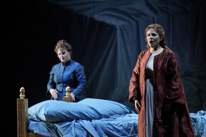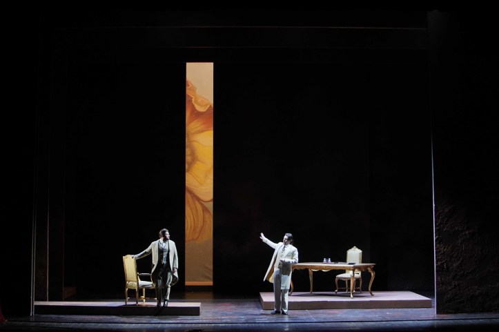 This new production of Otello, confided to Italo Nunziata, is a coproduction with the theatres of Modena, Reggio Emilia, Novara, and Rovigo.  Nunziata gives us a staging that tells the story in a very straightforward way.  The costumes, by Artemio Cabassi, represent the Victorian era, perhaps in an attempt to reflect the time of the work’s composition.  The set, by Domenico Franchi, consists of some various bits of furniture – a few benches, a bed, a desk, and a staircase down which Otello descends to sing his ‘esultate!’ – while large panels frame the action in various formations, occasionally giving us a view of related imagery behind.  These include a painting of a bed in Act 4, blowing drapes in Act 1, or flowers in Act 2.  Direction of the chorus consists of a lot of boddice clutching for the ladies, while direction of the principals consists of a considerable amount of declaiming into the auditorium with arms outstretched.