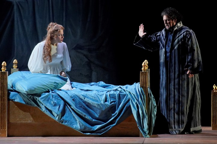 Yet despite the rather perfunctory personenregie, Nunziata proves his ability to tell a story clearly, showing us a view of Otello seeing Desdemona engage with Cassio in Act 2, for instance, setting in train his obsessive jealousy.  I also found it telling in how the crowd did nothing in Act 3, while Otello abused Desdemona, preferring to clutch the aforementioned boddices rather than intervene.  The strength of Nunziata’s staging, then, is that he lays out the events clearly and logically for us.  Yes, the direction of the chorus and principals was perfunctory, but his staging does produce an efficient framework for the action to take place in.