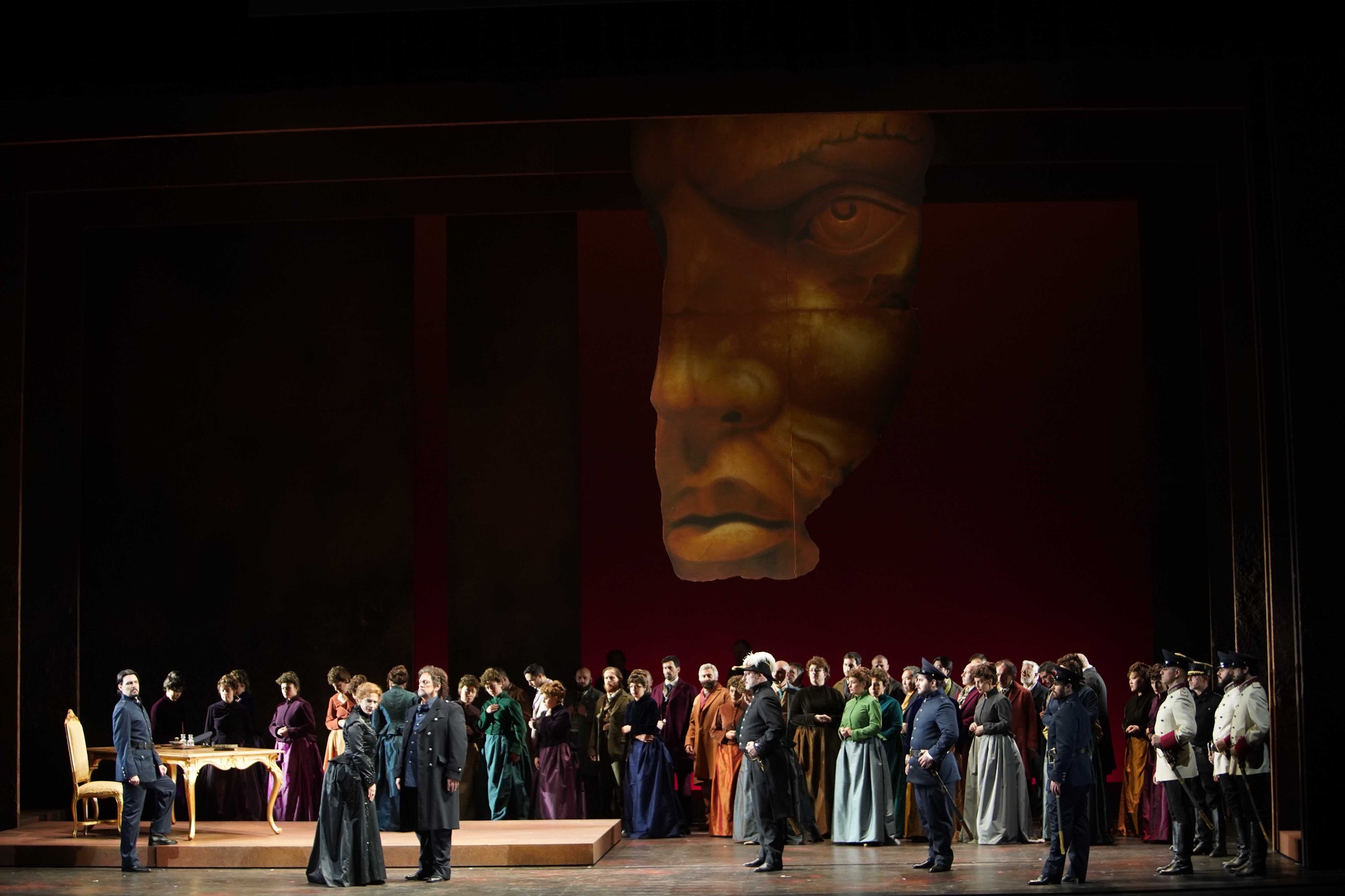 This new production of Otello, confided to Italo Nunziata, is a coproduction with the theatres of Modena, Reggio Emilia, Novara, and Rovigo.  Nunziata gives us a staging that tells the story in a very straightforward way.  The costumes, by Artemio Cabassi, represent the Victorian era, perhaps in an attempt to reflect the time of the work’s composition.  The set, by Domenico Franchi, consists of some various bits of furniture – a few benches, a bed, a desk, and a staircase down which Otello descends to sing his ‘esultate!’ – while large panels frame the action in various formations, occasionally giving us a view of related imagery behind.  These include a painting of a bed in Act 4, blowing drapes in Act 1, or flowers in Act 2.  Direction of the chorus consists of a lot of boddice clutching for the ladies, while direction of the principals consists of a considerable amount of declaiming into the auditorium with arms outstretched.