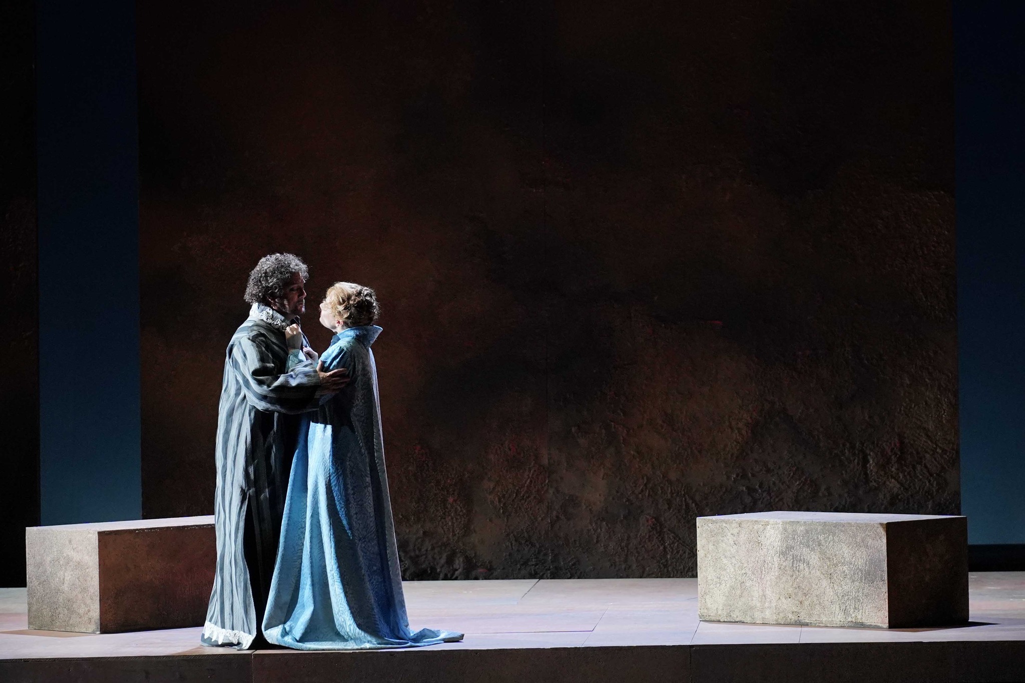 Yet despite the rather perfunctory personenregie, Nunziata proves his ability to tell a story clearly, showing us a view of Otello seeing Desdemona engage with Cassio in Act 2, for instance, setting in train his obsessive jealousy.  I also found it telling in how the crowd did nothing in Act 3, while Otello abused Desdemona, preferring to clutch the aforementioned boddices rather than intervene.  The strength of Nunziata’s staging, then, is that he lays out the events clearly and logically for us.  Yes, the direction of the chorus and principals was perfunctory, but his staging does produce an efficient framework for the action to take place in.