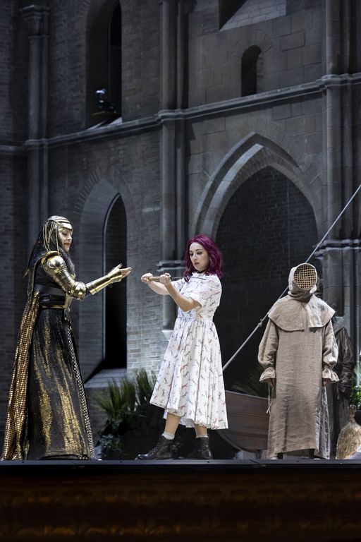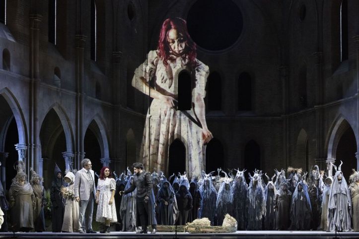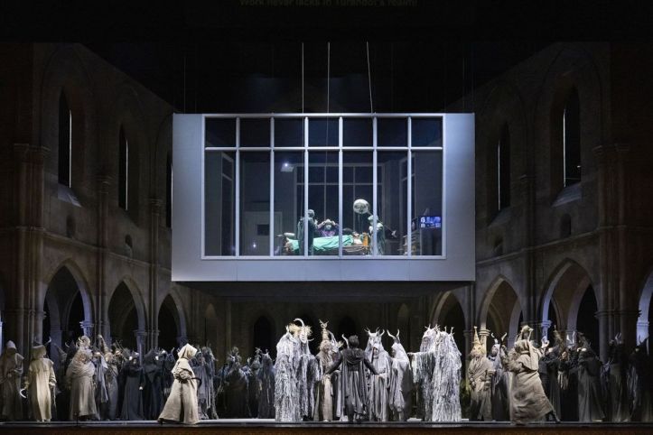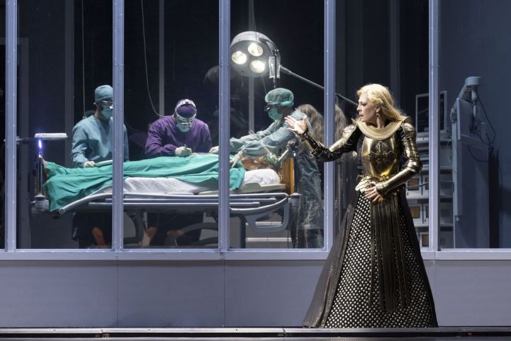 Indeed, not since Bieito’s staging in Nürnberg and Belfast have I been convinced by a Turandot as much as this one. The evening opens with a short movie, illustrating Sondra Radvanovsky’s Turandot and Yusif Eyvazov’s Calaf driving in a car, arguing. Their argument revolves around whether they should get married, about how Turandot feels that Calaf wants to just own her, and how both are living with the trauma of how Liù killed herself following a depressive episode caused by her previous relationship with Calaf. In one fell stroke, Barkhatov immediately humanizes those highly problematic issues in the libretto and makes the story utterly convincing. He does so by giving us three perspectives. Act 1 opens with Calaf being mortally wounded in the accident while Turandot lives; Act 2 opens with Turandot being seriously injured; while Act 3 ends with a happy end in which both are able to continue living. What plays out in front of us is Calaf in Act 1 wondering around in that liminal state, surrounded by the shadowy figures of the chorus, with images of Liù harming herself projected on the back of the stage, while Turandot occupies that state in Act 2. The presence of a hospital room that descends from the flies with either Calaf or Turandot in the bed reinforces that impression. Seeing Turandot’s first silent entrance as her rushing to Calaf’s bedside, while the chorus intones ‘principessa’ seemed utterly logical. Similarly, it felt that Barkhatov fully engaged in Liù’s story and made her presence in the plot also essential and natural.