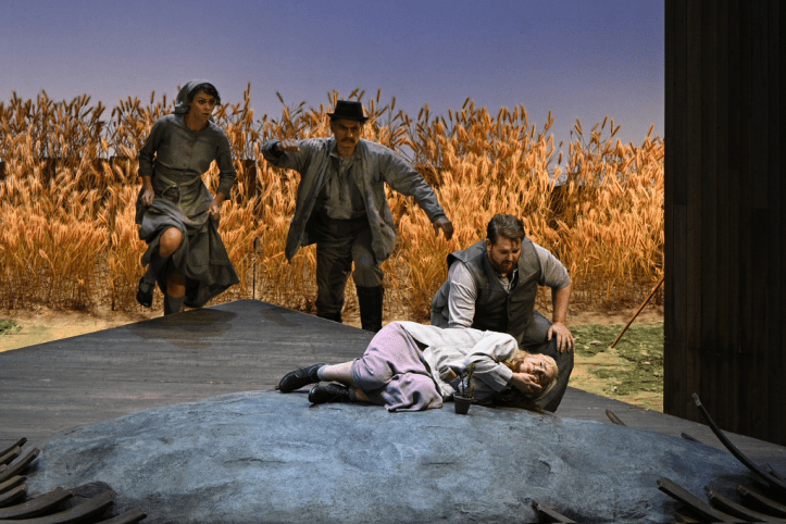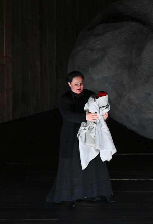 This was my first occasion hearing Clay Hilley and here is another very exciting talent. His tenor is wonderfully beefy, but also bright in tone. The voice is even from top to bottom, but he’s also able to scale back the sound and sing with real delicacy. He also coloured the text, using the words as the starting point for the line. Without doubt a singer to watch. Dovlet Nurgeldiyev coped very well with Števa‘s challenging tessitura, singing with ease on top where so many before him have sounded in pain, and was an appropriately extrovert stage presence. The remaining roles reflected the quality one has come to expect here. Tigran Martirossian’s bass was appropriately warm in tone as the Foreman, while Kim Han was an extrovert Mayor. Yeonjoo Katharina Jang gave us a prettily sung account of Jano’s music. Some of the other soprano and mezzo roles weren’t always audible from my seat in the centre of the Parkett. Eberhard Friedrich’s chorus sang with discipline and focused tone. Above all, it was Janina Baechle’s grandmother who brought humanity to the staging. She sang with warmth and generosity throughout.