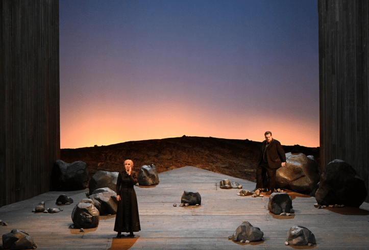 What struck me about Tombosi’s staging this time around is the significance of the stones that appear in the set. In Act 1, a large stone seems to want to penetrate the floor; in Act 2, it dominates the set; while in Act 3, it’s shattered into pieces. In so doing, Tombosi highlights the huge weight of the events of the plot and their implications for the characters involved. Having the set of Act 2 dominated by the huge stone placed centre-stage, seems to portend how monumental both the birth of Jenůfa’s baby and the child-murder committed by the Kostelnička were. And yet, in its symbolism, it seems rather heavy-handed. That said, I did find that the setting for Act 2, with the wooden set closing in at the back seemingly reflecting the wood of the Staatsoper auditorium, to be a visually striking touch. As a revival, tonight directed by Marie-Christine Lüling, one might expect the characterizations to be perhaps not as detailed as in a new production. This I felt was the case with the chorus, who were simply parked on the stage and invited to randomly gyrate in the celebrations of Act 1. There was also a considerable quantity of outstretched hands and singing to the front. Still, it’s an efficient framework for the action, but I did long for the visceral realism of Calixto Bieito’s Stuttgart staging that was revived in Rouen last year.