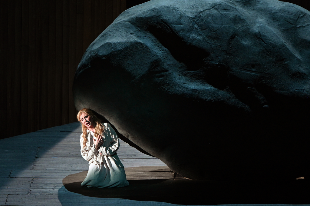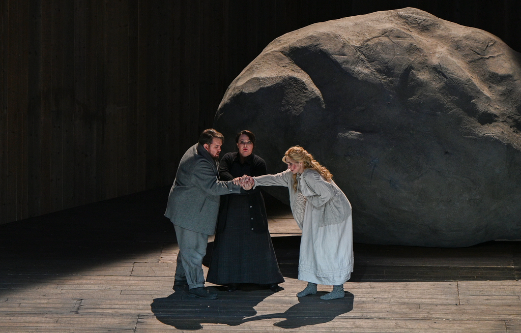 What struck me about Tombosi’s staging this time around is the significance of the stones that appear in the set. In Act 1, a large stone seems to want to penetrate the floor; in Act 2, it dominates the set; while in Act 3, it’s shattered into pieces. In so doing, Tombosi highlights the huge weight of the events of the plot and their implications for the characters involved. Having the set of Act 2 dominated by the huge stone placed centre-stage, seems to portend how monumental both the birth of Jenůfa’s baby and the child-murder committed by the Kostelnička were. And yet, in its symbolism, it seems rather heavy-handed. That said, I did find that the setting for Act 2, with the wooden set closing in at the back seemingly reflecting the wood of the Staatsoper auditorium, to be a visually striking touch. As a revival, tonight directed by Marie-Christine Lüling, one might expect the characterizations to be perhaps not as detailed as in a new production. This I felt was the case with the chorus, who were simply parked on the stage and invited to randomly gyrate in the celebrations of Act 1. There was also a considerable quantity of outstretched hands and singing to the front. Still, it’s an efficient framework for the action, but I did long for the visceral realism of Calixto Bieito’s Stuttgart staging that was revived in Rouen last year.
