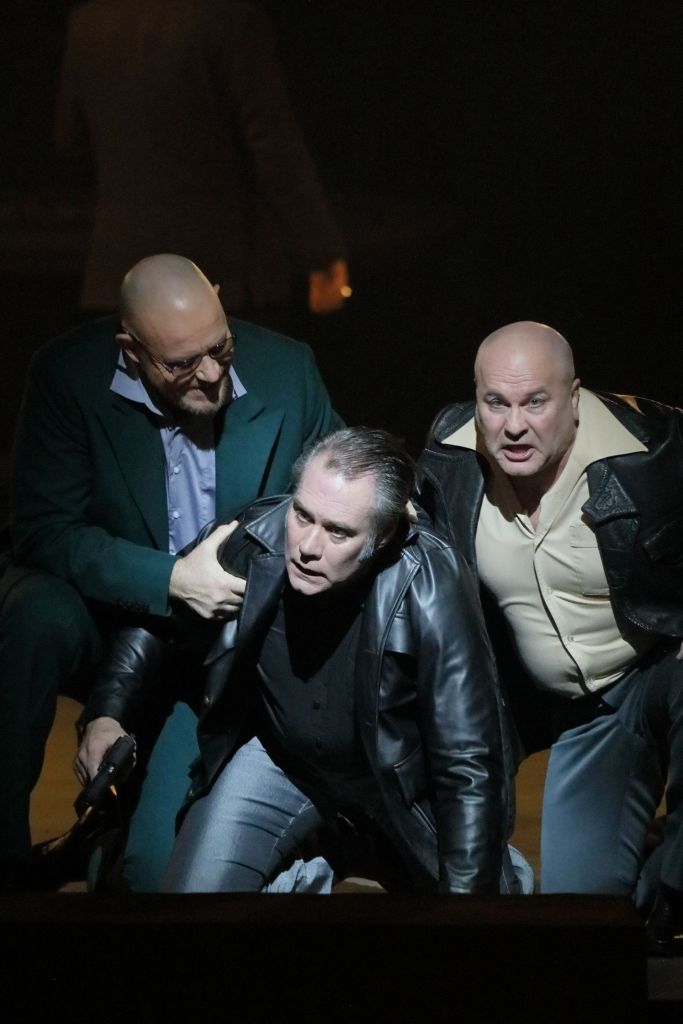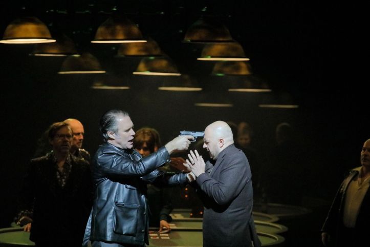 It did feel that losing the intermission between Acts 1 and 2 was an oversight, since Andrews’ staging does give a lot to think about. The main reason for this being that one is constantly wondering what is going on, and what are the implications of what one sees. Andrews’ staging is a succession of images. He seems to have been inspired in his stage pictures by the work of Calixto Bieito, whether in the chorus constantly emerging from the back of the stage, the use of close-up films of the principals on the front curtain between scenes, or the sparkling jumpsuit worn by Polina. Not to mention the girls entering on a convoy of automobiles in Act 1, scene 2, undoubtedly a nod to Bieito’s much-travelled Carmen.