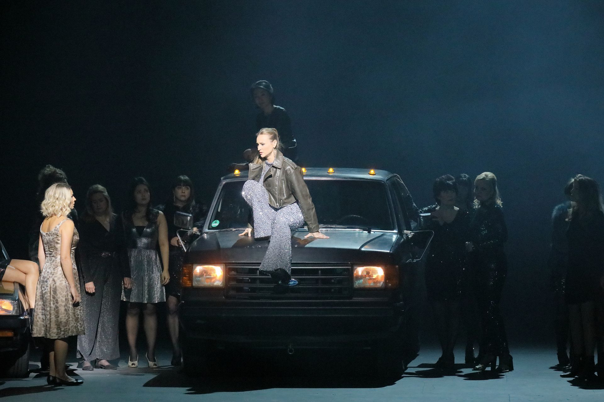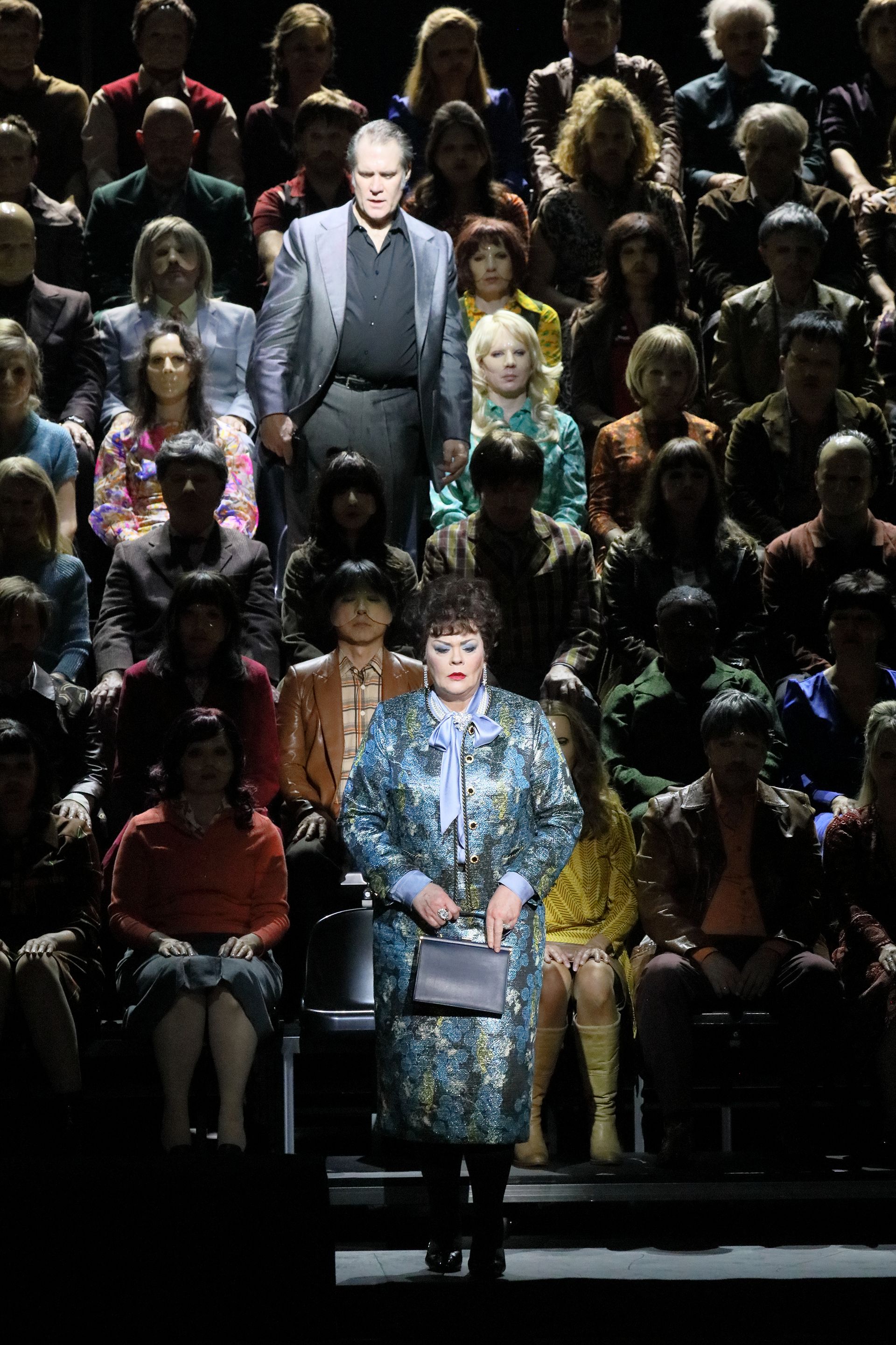 It did feel that losing the intermission between Acts 1 and 2 was an oversight, since Andrews’ staging does give a lot to think about. The main reason for this being that one is constantly wondering what is going on, and what are the implications of what one sees. Andrews’ staging is a succession of images. He seems to have been inspired in his stage pictures by the work of Calixto Bieito, whether in the chorus constantly emerging from the back of the stage, the use of close-up films of the principals on the front curtain between scenes, or the sparkling jumpsuit worn by Polina. Not to mention the girls entering on a convoy of automobiles in Act 1, scene 2, undoubtedly a nod to Bieito’s much-travelled Carmen.