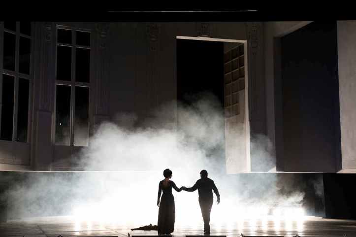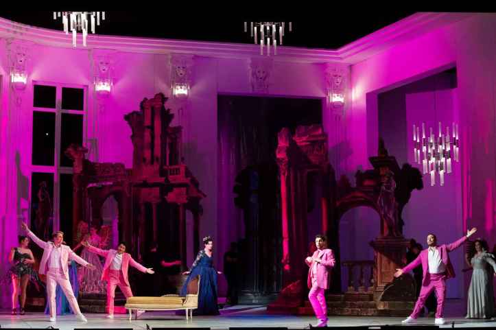 Curran’s staging, here revived by Oscar Cecchi, sets the action in a suitably palatial home.  The staff scurry around in the prologue, using their smartphones to communicate, Curran placing the action very much in the modern day.  The opera proper takes place in the same room, here accessorized with mythological furniture for Ariadne’s initial contributions, with a shiny box rolled out for when Zerbinetta and her troupe show up.  Curran very much sees the opera as a continuation of the prologue, with the Tanzmeister, Musiklehrer and Komponist all present at the start of the opera directing the cast, while the principals seem to be continuing the tensions between the troupes that erupted in the prologue.  Curran isn’t the first director to carry characters who only appear in the prologue through to the opera – Robert Carsen did it in Munich, while Katie Mitchell had the Komponist conduct the opera from one side in her quite dreadful staging at Aix-en-Provence.  But then, after ‘es gibt ein Reich’, the other characters disappear and Zerbinetta sings her aria alone on stage.  I don’t know if Curran is attempting to make the point that an opera, at a certain moment, takes on a life of its own, independent of its creators.  The less charitable interpretation would be that he simply ran out of ideas.  Personally, I quite like the idea of a work of art just taking on a life of its own.