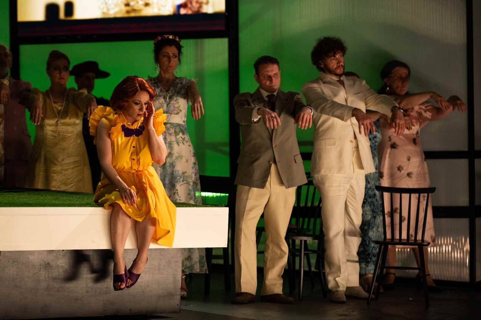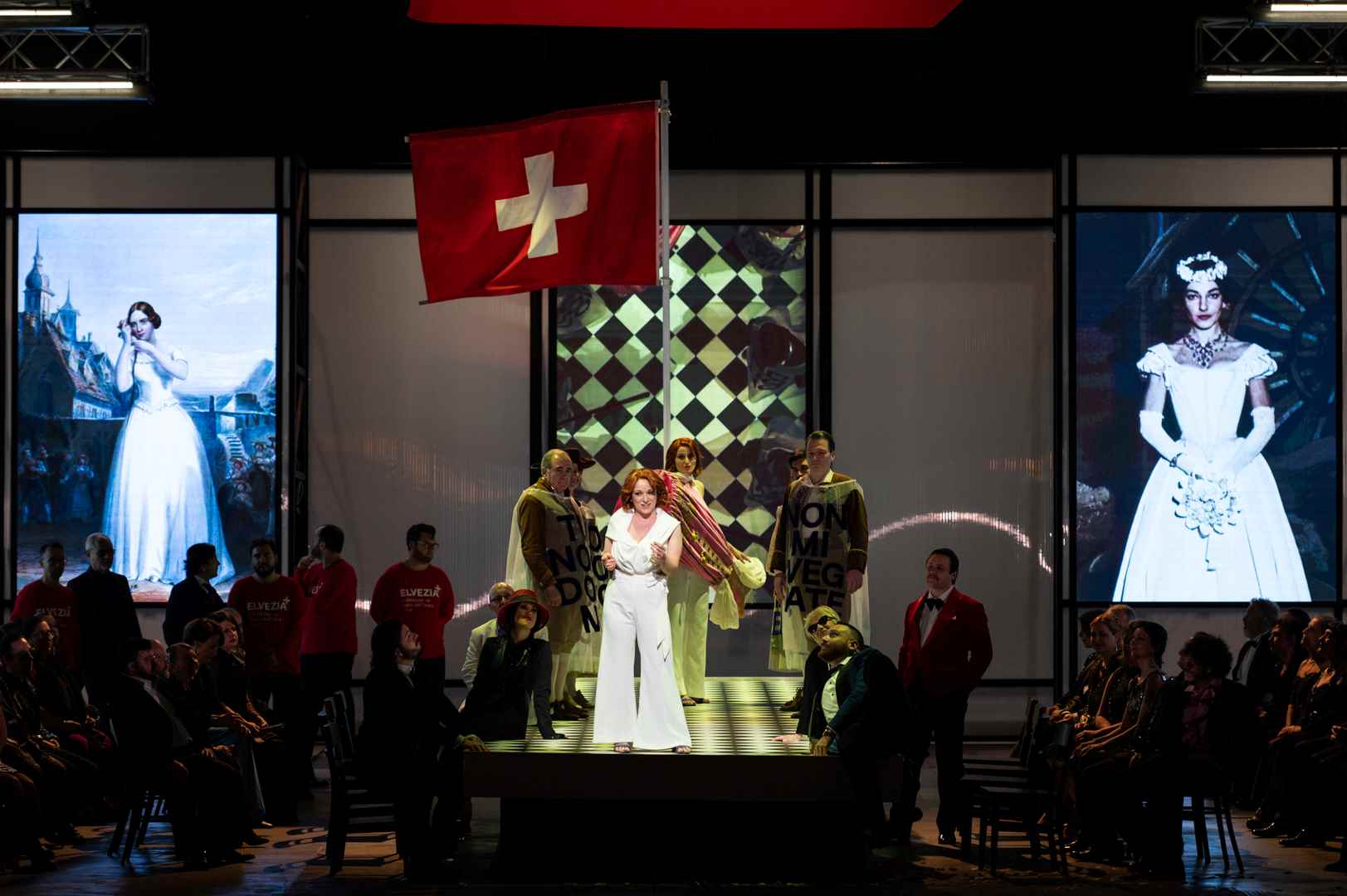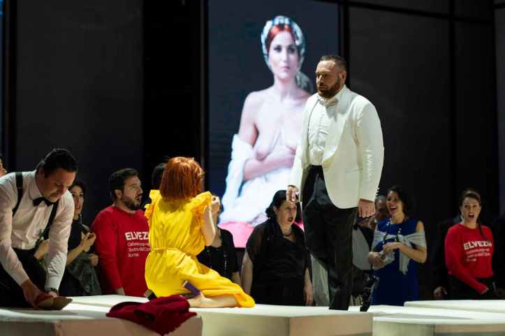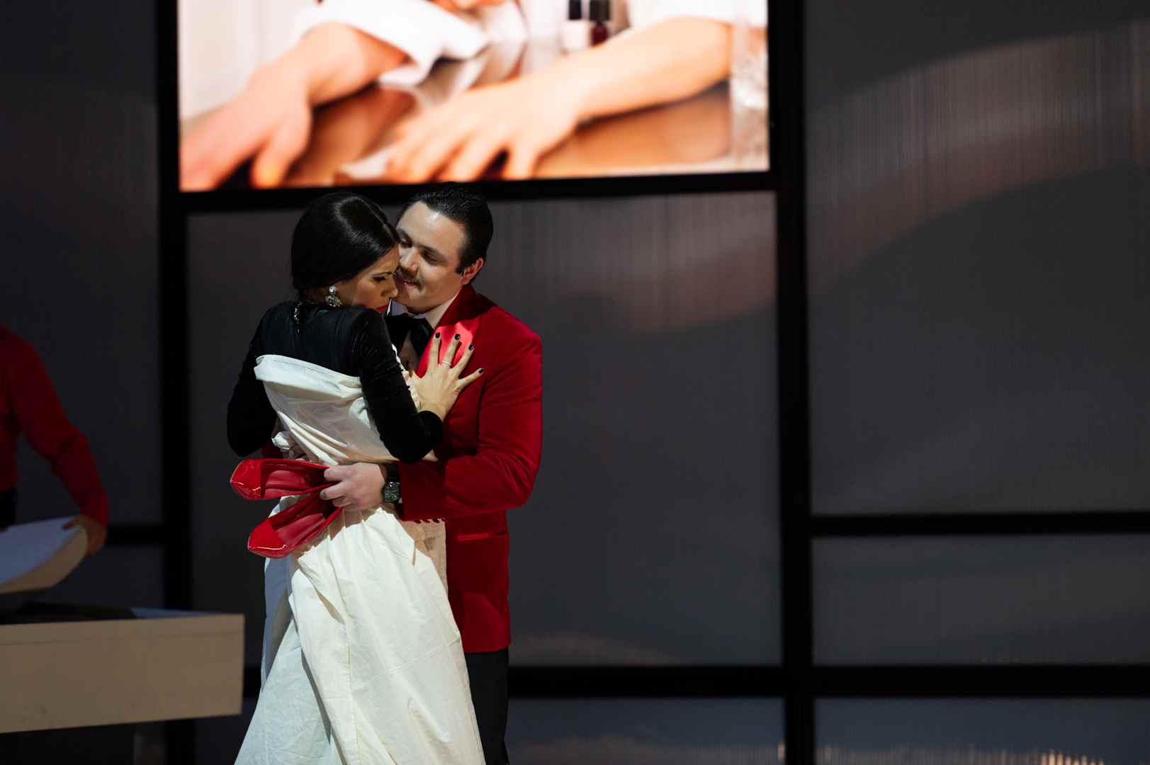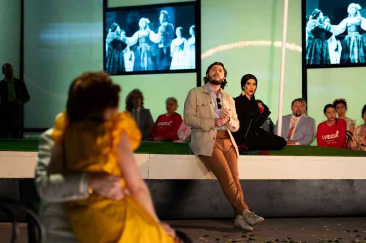 As spectators took their seats at the start of the evening, the front of the stage made reference to a temporary art gallery called ‘Elvezia’. This, it transpires was the setting for the entire evening. Or was it? The performance opened with a short movie, with a woman (who we soon learn is Amina), texting her mother regarding her fears that Elvino will be late for their upcoming nuptials. The short film includes views of the eternal city, complete with its legendary traffic noise, which made it difficult to adjust the ears as the music then began. This art gallery seems to be a place where they also hold fashion shows, with Amina singing her opening number while working it down the runway; while the gallery also seems to form a dormitory with characters sleeping in beds spaced across the stage. LE LAB populate the back of the stage with film showing various bits of imagery, whether images of previous productions of Sonnambula that have taken place here, or classic paintings, in which the modern-day Amina poses side by side with the original. To be frank, I tuned out from these after a while, since they added nothing to what we saw. Nor did, the actress walking down the aisle during ‘Ah! non credea mirarti’, who it transpires was the double who appeared in Amina’s filmed interpolations – including displaying her fried eggs in zoom on the back of the stage.