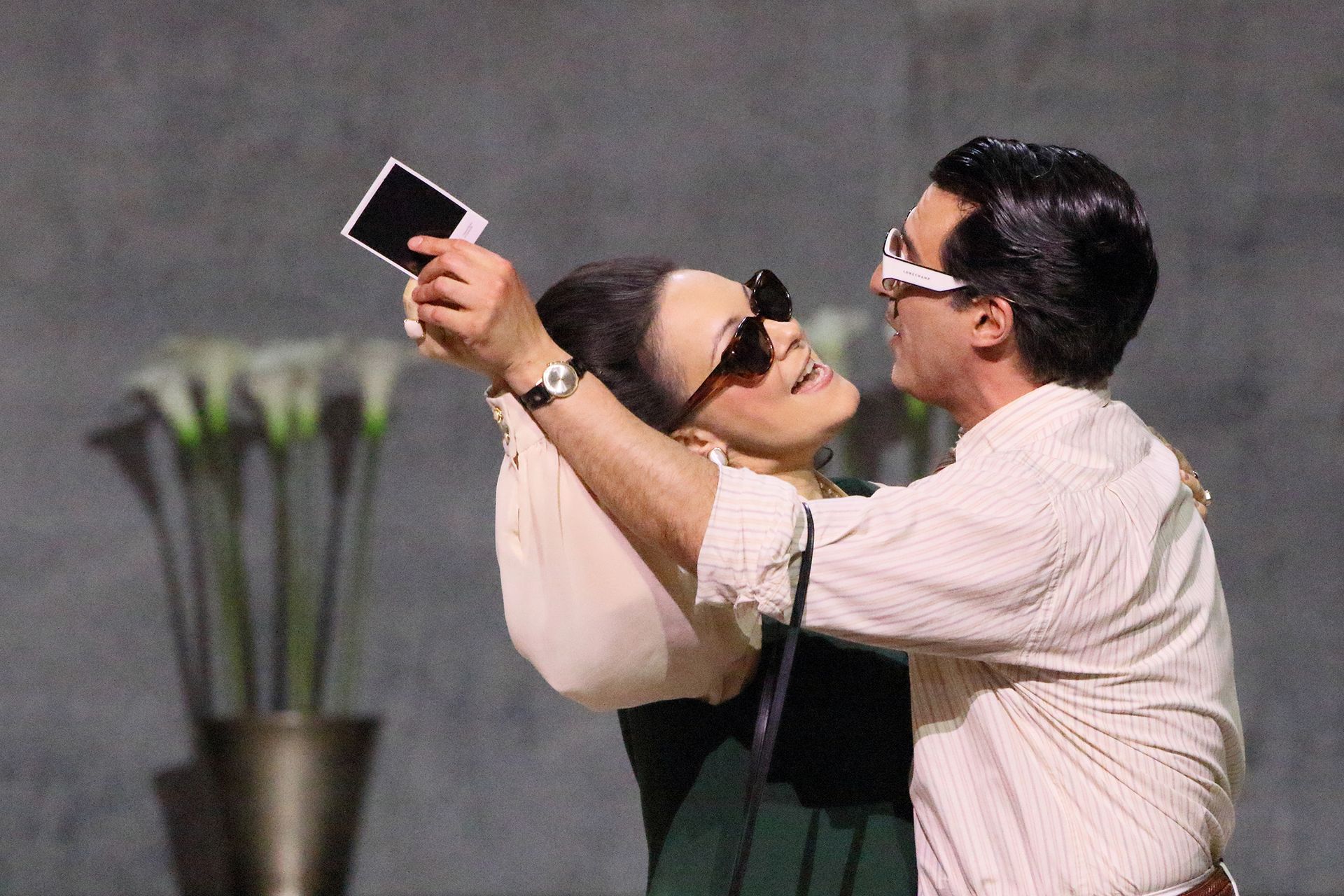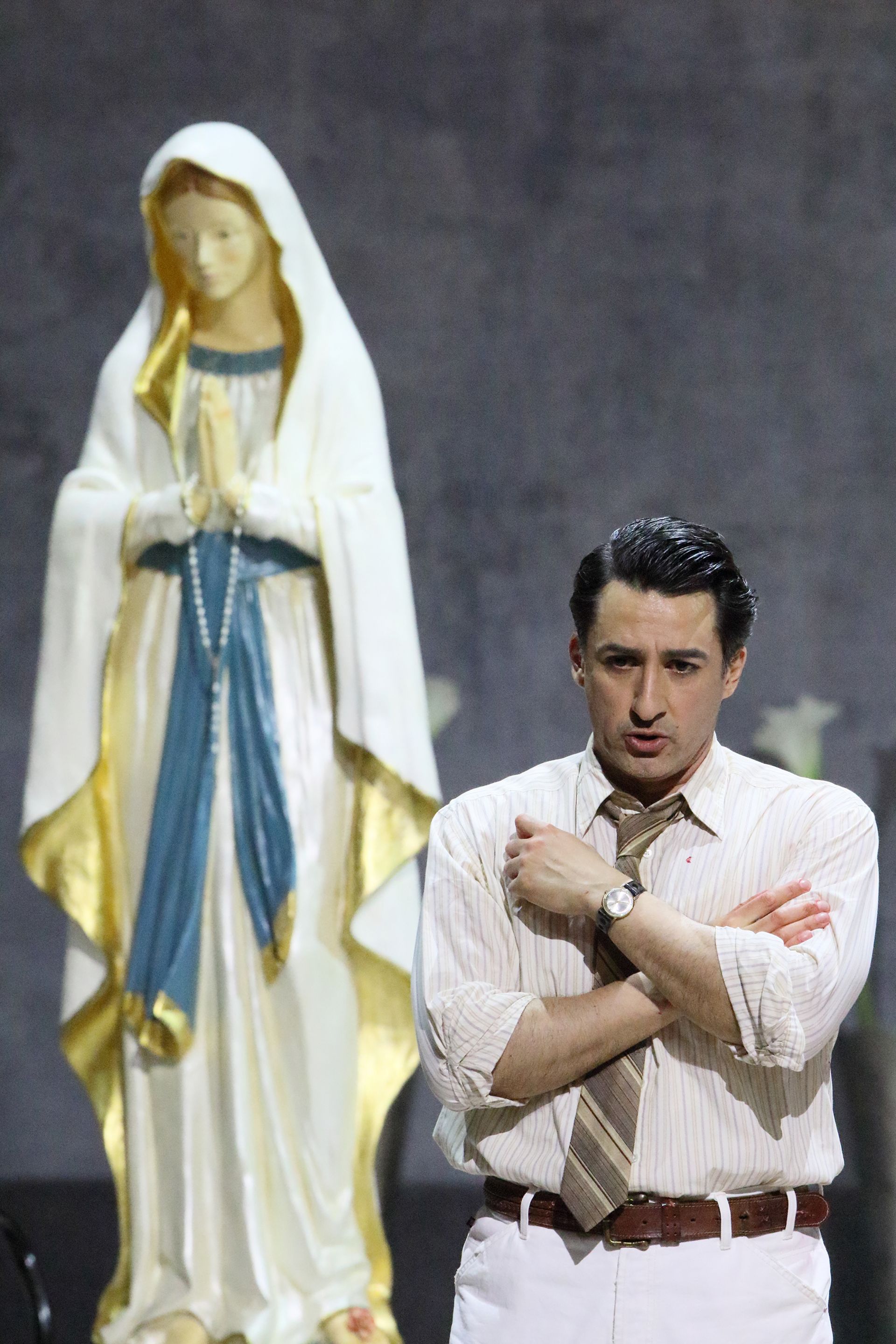 I have to admit to some, what the Germans call, ‘Vorfreude’ when I saw the trailer the house put up online prior to the opening. The 1970s setting, with costumes and sets by Monika Pormale, looked terrific and promised a cogent updating to an era when clerical dictatorships still existed in Europe. Sadly, that initial excitement was somewhat mitigated. Mundruczó’s Act 1 is a mess, frankly. Rather than giving us a logical updating, Mundruczó presents the action as Cavaradossi incarnating Pier Paolo Pasolini in his final days, filming his controversial movie Salò. We see Cavaradossi directing images from the film in front of us, with actors in various states of undress. Making Cavaradossi a filmmaker is quite an intelligent idea. Yet here, it’s rendered illogical since it made no sense that the Sagrestano would be an actor reading his lines, while later celebrating the upcoming concert by Floria Tosca. The act ends with a shocking image, a crowd of revolutionaries being beaten by Scarpia’s police. It was exceptionally powerful to see and in a different context would have been extremely potent. But it made no sense that this would take place under a huge statue of the Madonna that had been brought in by a group of monks showing up at the film set. Does Scarpia walk around with an entourage of Madonna-carrying monks?