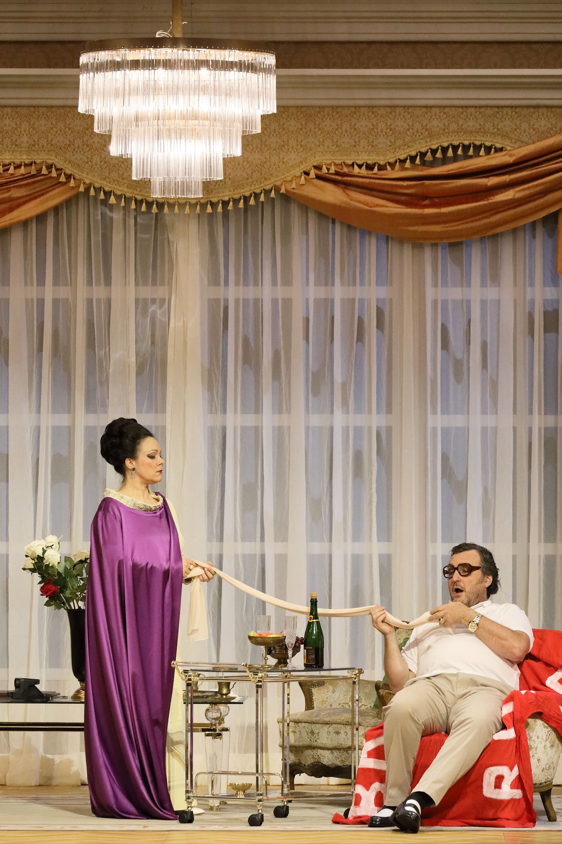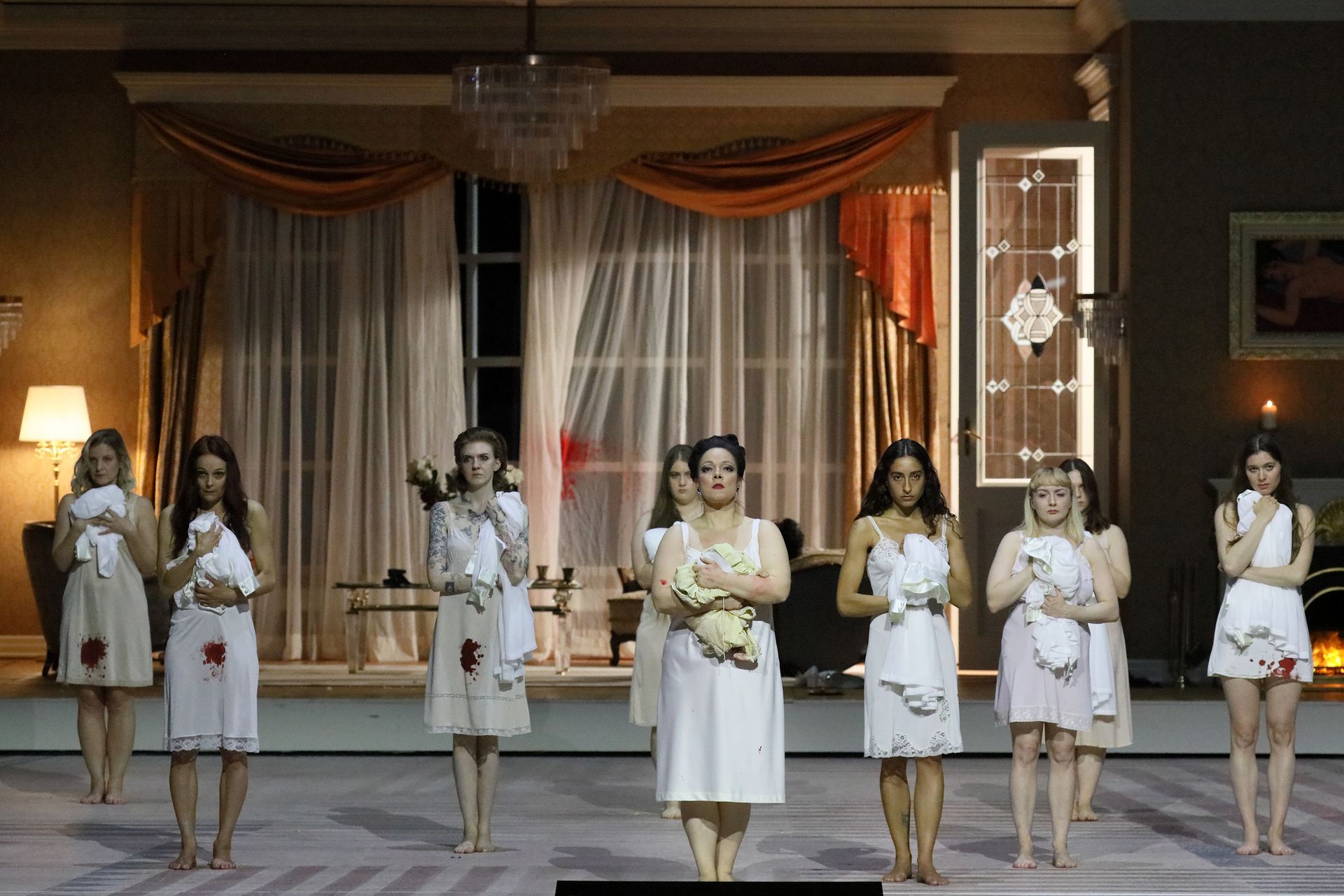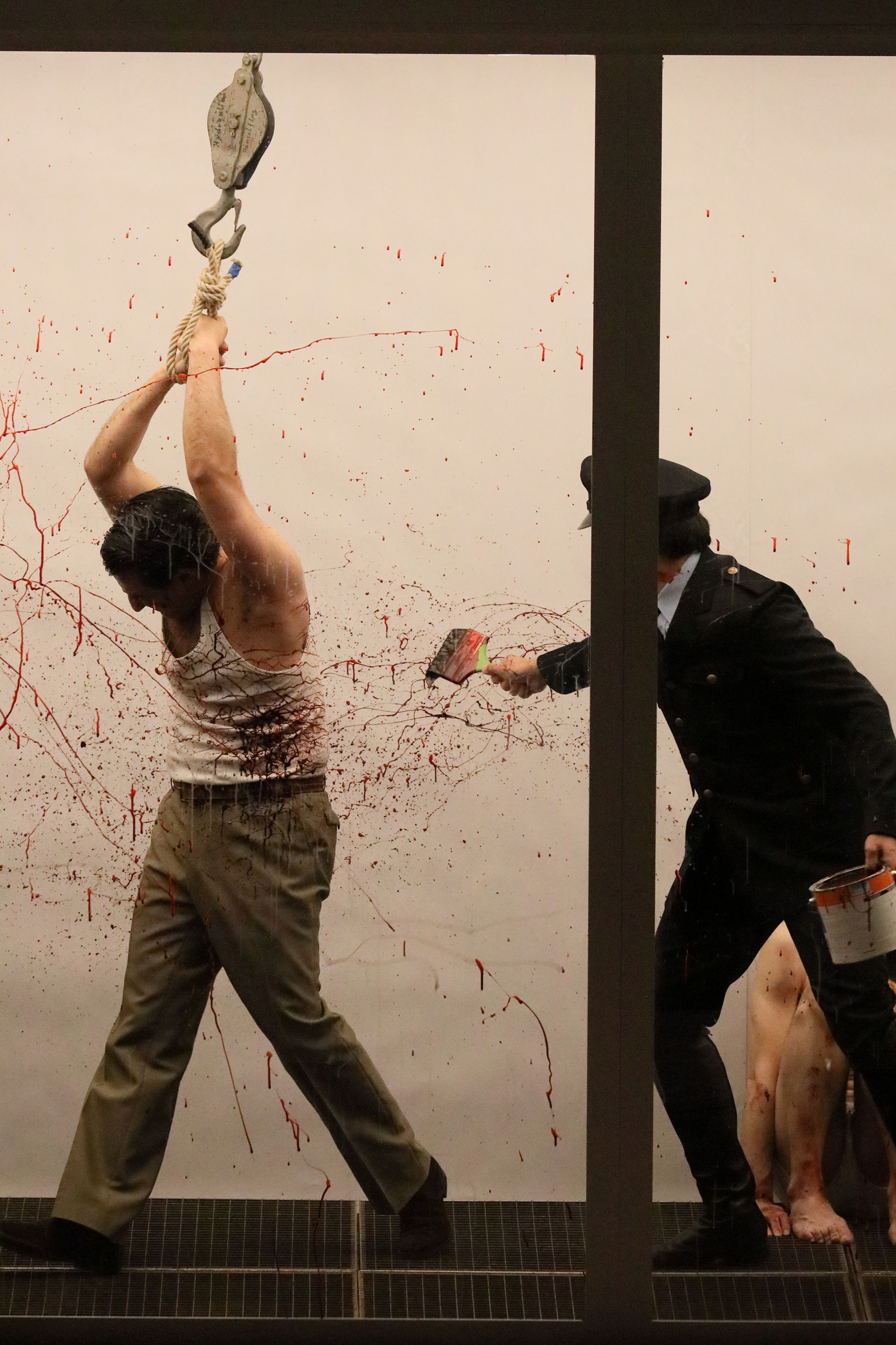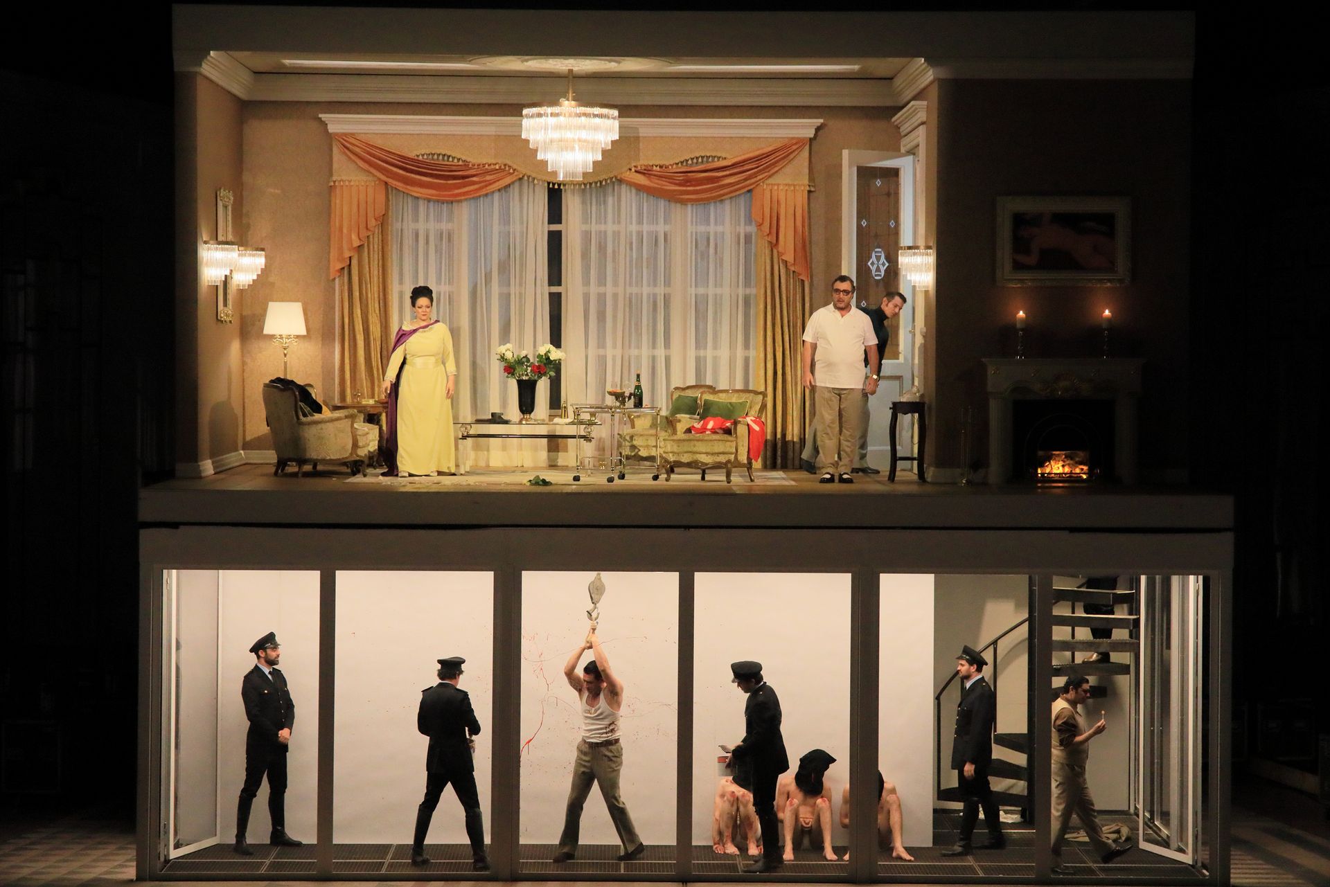 Fortunately, things improved enormously in Acts 2 and 3. The shepherd’s song was accompanied by images of Pasolini’s earlier movies, as was ‘E lucevan le stelle’ and it felt fitting with that introspective and wistful moment. More successful still was Act 2. Taking place in a lavish yet claustrophobic home, with a torture chamber in the basement that the stage rose to reveal, the concentrated claustrophobic violence of the drama was inescapable. The torture of Cavaradossi was horrifyingly brought to life in front of us, Castronovo was physically fearless here, while Tosca’s journey from bejewelled diva, to victim of sexual assault, to self-defence was also played out for us with unbearable intensity. Mundruczó has a group of women join Tosca after the murder. I’m not sure here if he’s saying that Tosca was just one of many, or drawing parallels with Pasolini’s treatment of his actors in Salò. Still, the final moments of Act 3 were appropriately gruesome. At its best, Mundruczó’s staging felt that it stripped away the years of tradition from this oft-performed work and presented us with the shock and horror within as new to us. Which makes it all the more frustrating that Act 1 was such an illogical mess.