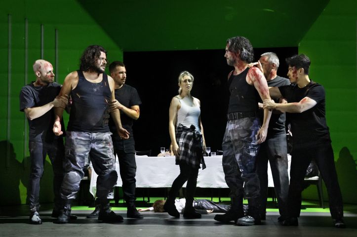 Villalobos gives us a world of violence, where Thoas abused a female chorister, mounting her and ripping off her panties, then subsequently sniffing them. It led me to ask myself whether this helped to enhance the narrative, or whether it was simply voyeuristic. Thoas is described in the libretto as a ‘tyrant’, so this would be in keeping with that character. And yet, it felt that Villalobos set out to give us some gratuitous sexual violence to shock, rather than making us identify with the characters or make us feel for them. It then led me to reflect, at intermission, on Calixto Bieito’s much-travelled Carmen, which I saw again at the Liceu back in January this year. There the violence against women was an integral part of the staging, making us reflect on our complicity and to empathize with the characters and their situations. It works simply because Bieito manages to get his entire cast to create such believable and rounded characters. Villalobos is not yet in that league, and for me this is down to the simple reason that his theatrical vocabulary of personenregie is so perfunctory. Simply moving people around the stage is not the same as using the whole cast to create flesh and blood characters. The principals were frequently left on stage to emote to the front, with arms outstretched, so that they had to work even harder through the text to create meaning.