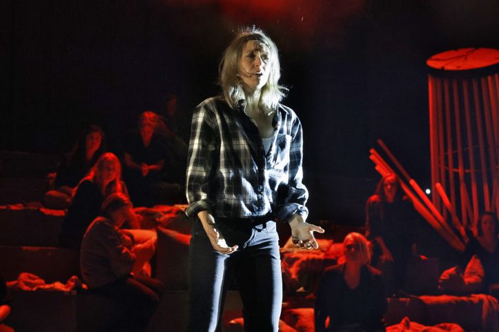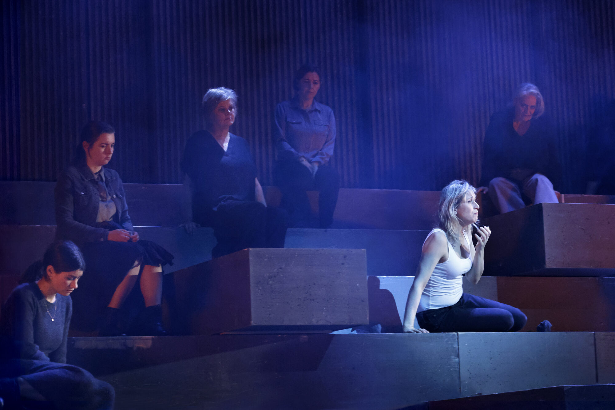 Villalobos sets the action mainly in a space that reflects a theatre. Two actors, Vincent van der Valk and Pleun Van Engelen, representing Agamemnon and Clytemnestre respectively, act out a scene from Euripides, giving something of the backstory that led to the events of the opera through the medium of the Netherlandic tongue. I don’t know if Van Engelen was deliberately overacting, but her bloodthirsty scream at the end of that scene was, at least to me, unintentionally hilarious. This led to the opera proper, which segued from that opening scene being staged as a play, to the audience in the theatre reacting to being bombed in the storm music. I regret to write that the impact of those visceral pages was blunted, due to the chorus randomly screaming while the simulated bombing was taking place, adding a layer of extraneous noise that compromised the impact of the music.