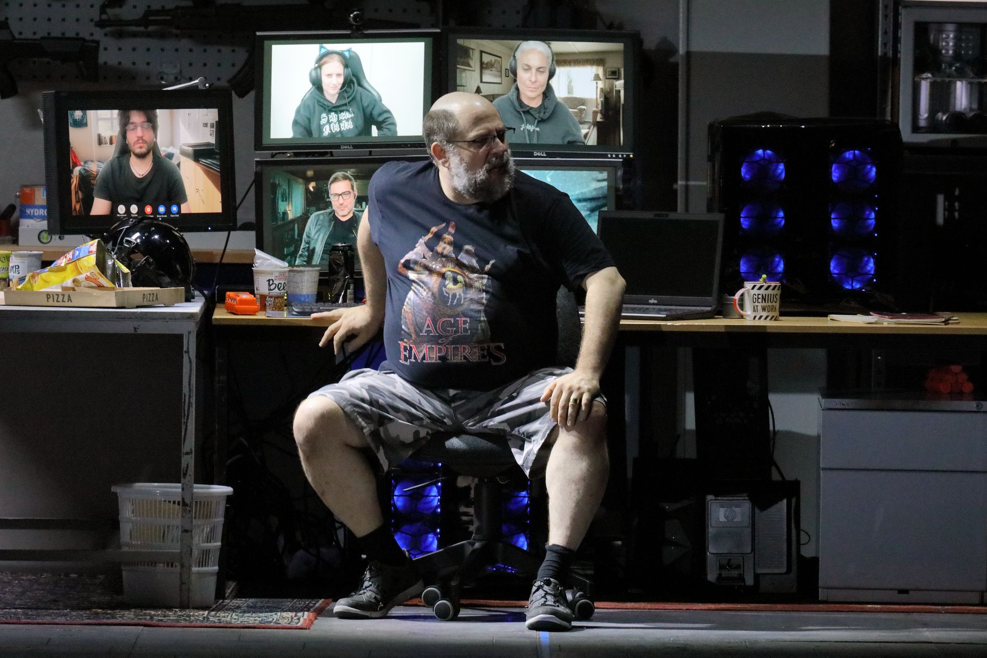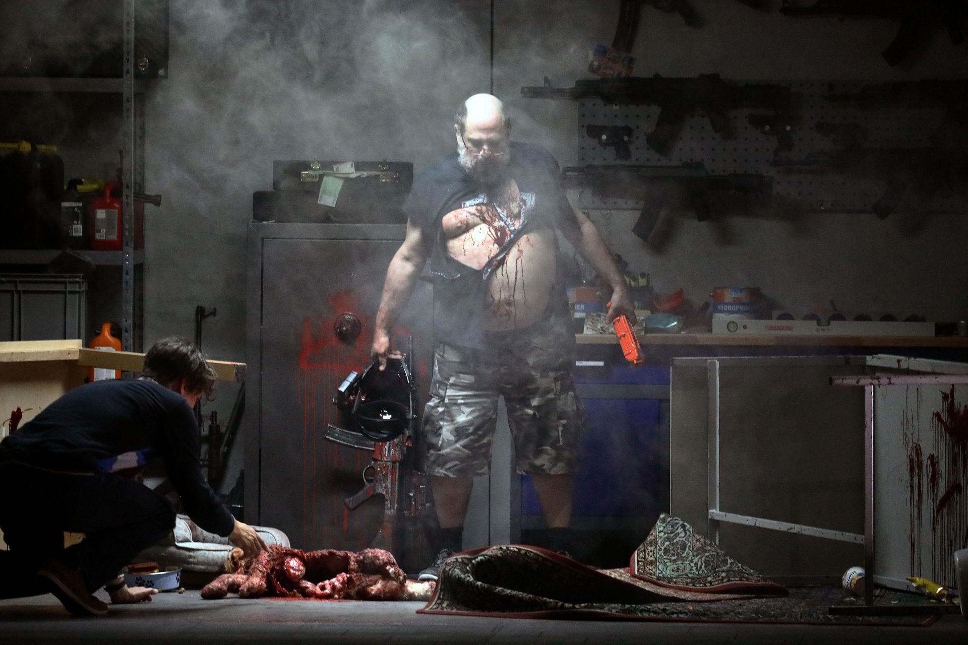 Kratzer has given us a Rheingold for our troubled times.  The Rhinemaidens are seen wearing casual hoodies and taking selfies of their opening interactions with Alberich, and it’s clear that Kratzer sets the action very much in the present day.  The descent into Niebelheim is accompanied with a video of Wotan taking a premium economy flight to New York, while Niebelheim itself is a garage where Alberich works from his computer selling arms.  The return shows a video of Wotan arguing with a customs agent about bringing a frog back into Germany.  Even though the twenty-first century setting might be seen as quotidian, for a work that deals in super-human traits, Kratzer doesn’t make it so.  He brings out the fantasy inherent in the work: whether in the Rhinemaidens being able to make furniture move by waving their hands, or Alberich indeed turning into a serpent or a frog.  The technical audacity of Kratzer’s staging is staggering – be it in the frequent use of pyrotechnics, the film, or the special effects he incorporates, this is very much the work of a creative team operating at the peak of its powers.