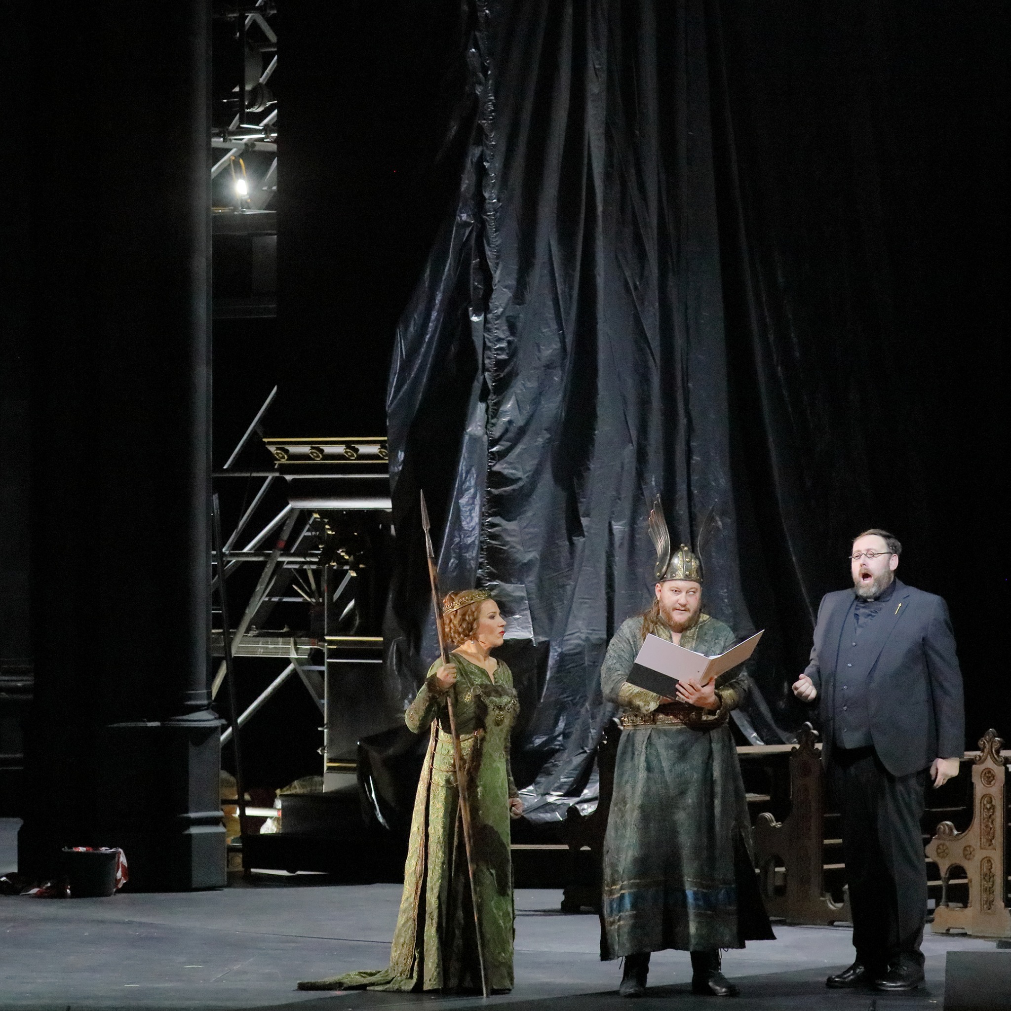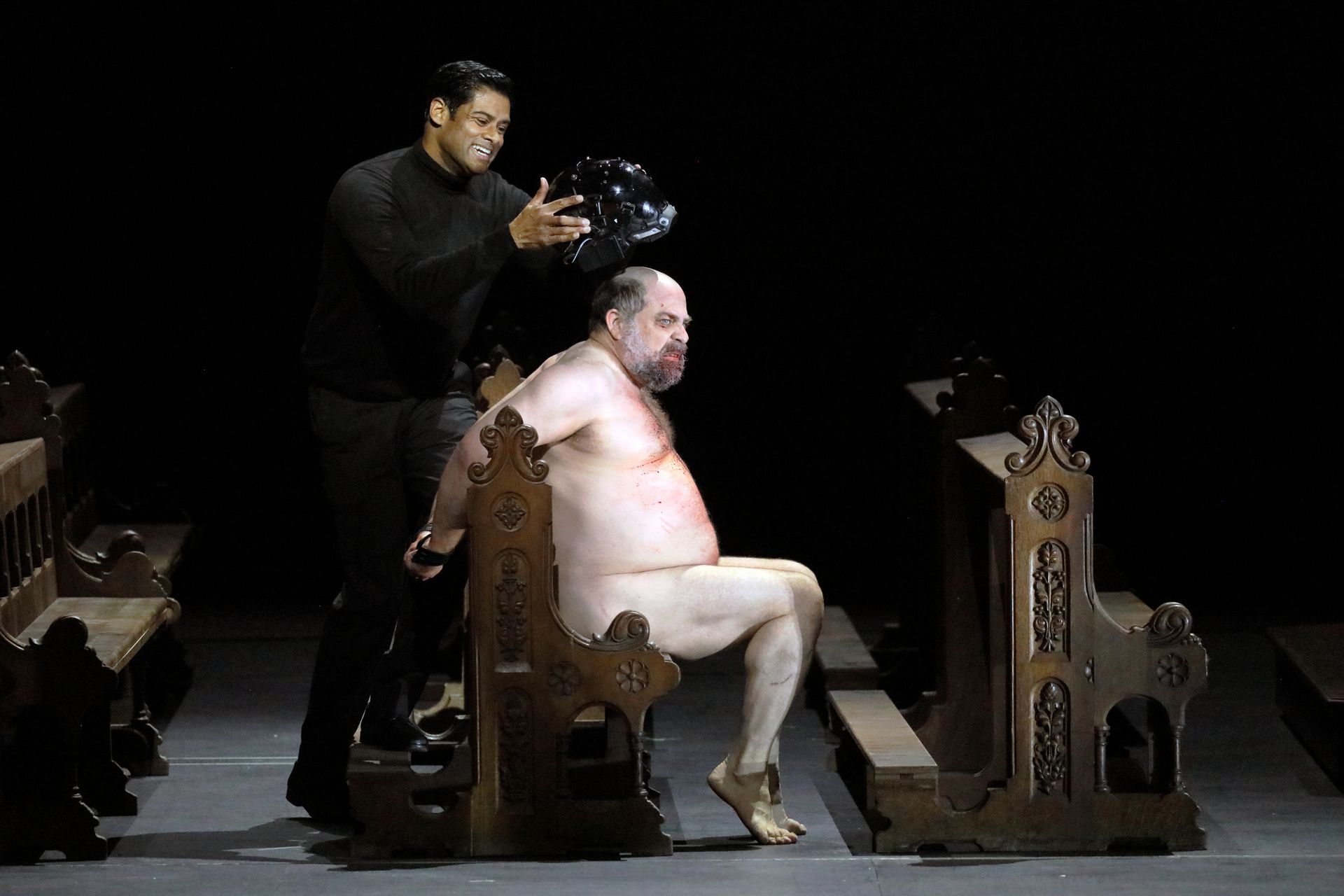 Markus Brück took a few moments to find his best form as Alberich, the voice initially rather grey and colourless.  He then grew into a towering performance of great physical bravery, appearing naked having transformed back from the frog for his confrontation with Wotan and Loge.  He dispatched his music with powerful intensity and generous force, the voice ringing out with ease, and so much communicated through that union of text and physicality.  Similarly, Matthias Klink gave us a textually clear Mime, although he did have a tendency to sacrifice the integrity of the tone in the service of characterization.  Wiebke Lehmkuhl gave us a striking Erda, her warnings intoned in a contralto of rare beauty and fullness of tone.  We also had two imposing giants in the form of Matthew Rose as Fasolt and Timo Riihonen as Fafner, both dressed as priests and prostrating themselves in front of Wotan.  Both Rose and Riihonen sang with big, booming tone and clarity of text.  The Rhinemaidens, Sarah Brady, Verity Wingate and Zhang Yajie were energetic and charming in tone.