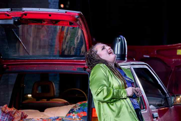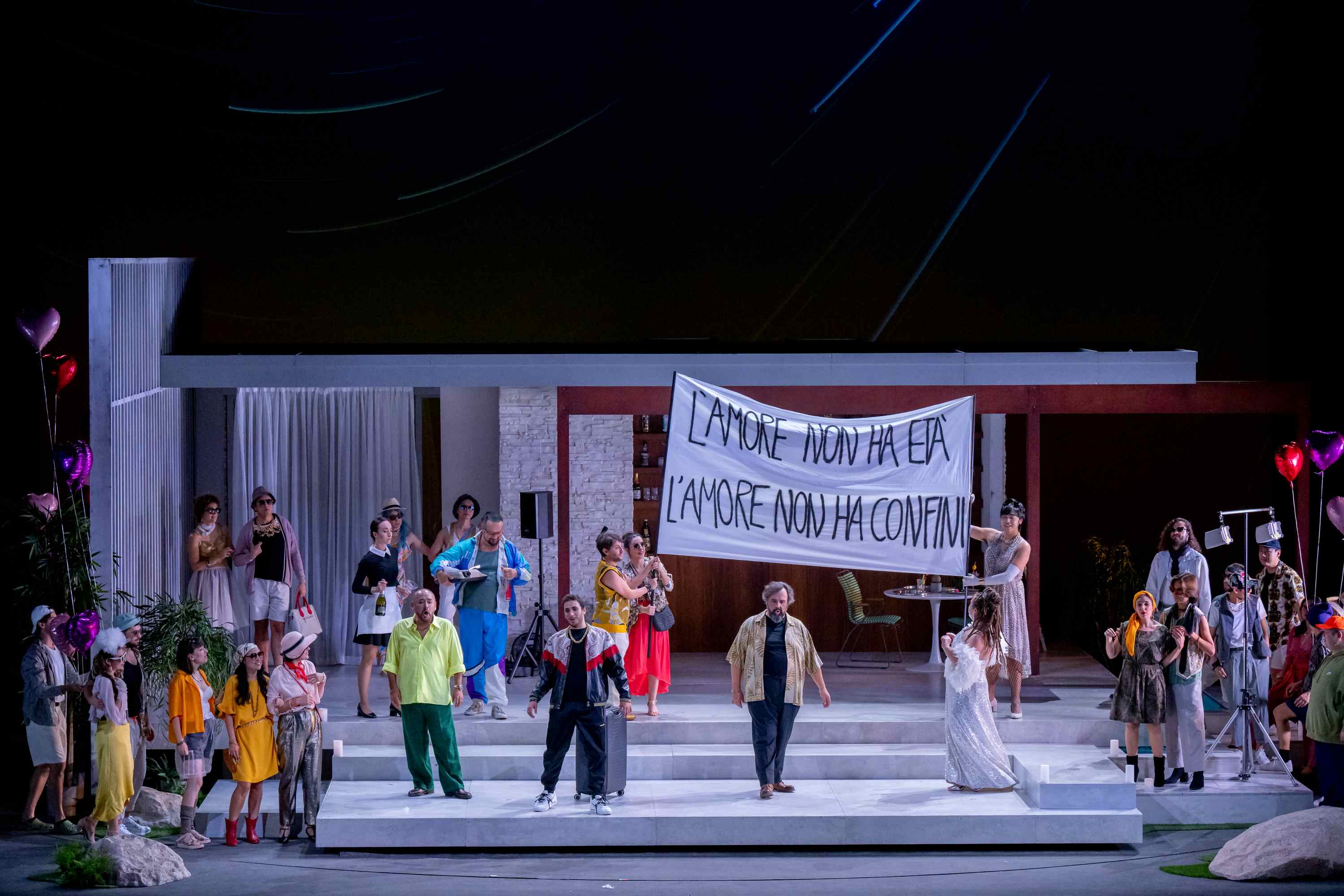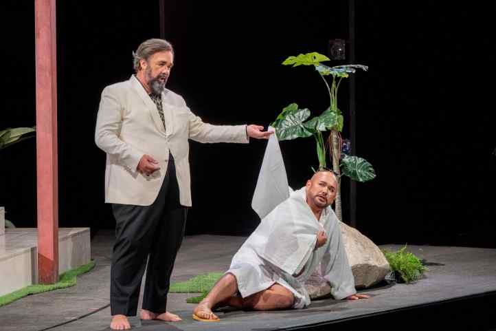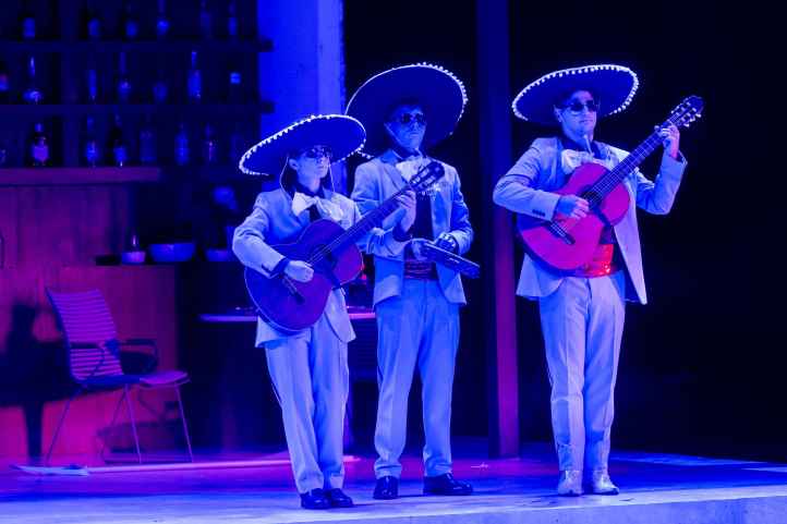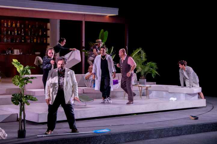 There was an international audience in the house tonight – I heard a lot of Swiss (both German and French) and a fair bit of British English.  Perhaps that explains why laughs were in very short supply, because simply put, this was one of the least funny Don Pasquales I’ve seen.  It seemed that Niermeyer was unsure of whether she wanted to make this a comedy or a tragedy.  Having Don Pasquale and Ernesto as moneyed mature men who hang out around a pool, complete with fake tan for Ernesto, perhaps was Niermeyer’s way of demonstrating how money can lead to a lack of social awareness. And yet, the final scene with Pasquale sitting alone with his plants, while everyone else celebrated, seemed to suggest that this was a tragedy, even if this had been barely explored through the evening.  Niermeyer closed the evening with Norina getting into her car and driving off, leaving Ernesto behind.  It felt both cynical and a non sequitur all that had gone before.  Was Niermeyer attempting to say that Norina was a gold-digger who took advantage of vulnerable men?  It’s hard to say, and this was the biggest issue with Niermeyer’s staging: the sheer lack of narrative cogency and the inability to illustrate whether this is a comedy or a tragedy.  There was, however, one moment where it seemed to come together, and that was when Camarena sang ‘Com’è gentil’.  Suddenly, we had some atmospheric lighting and, accompanied by two guitarists dressed as mariachis, the evening seemed to take to higher plane – albeit as it had almost ended.