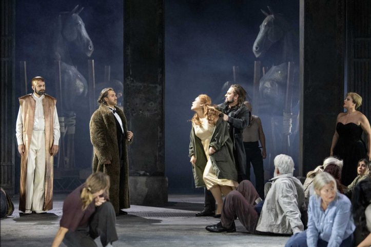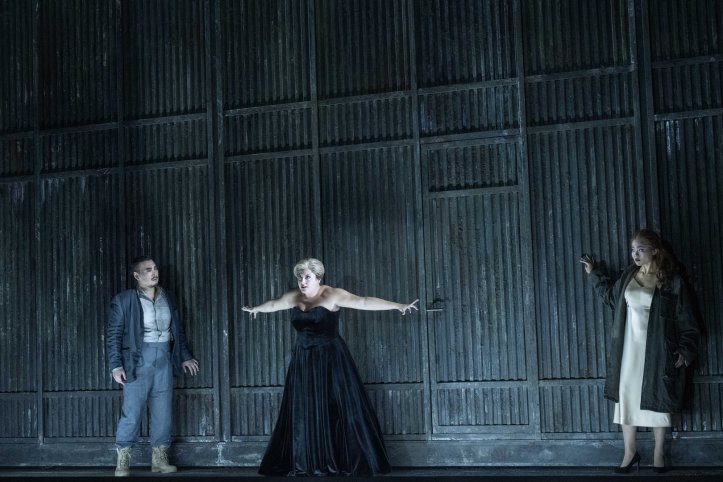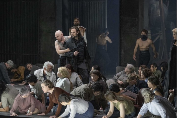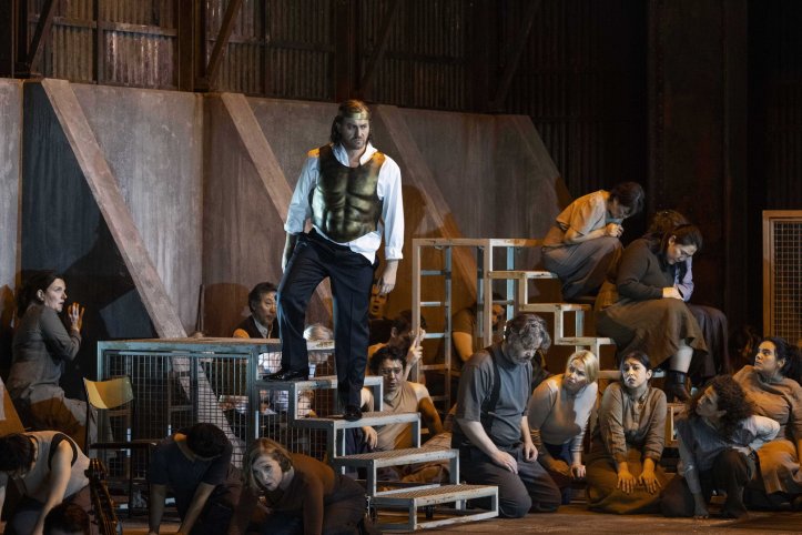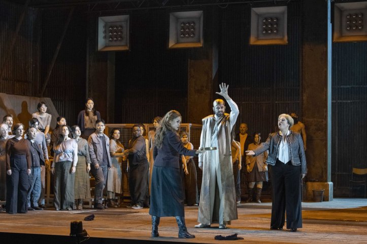 One might have suspected that having an experienced set designer directing a production, might lead to a privileging of the visuals over the personenregie. The good news, is that in Baur’s production, this is most definitely not the case. In this most choral of operas, he moves the cast around the stage with confidence, making every single person on stage a recognizable and vivid individual. He sets the action within a single, industrial set, very much in the modern day. There’s nothing recognizably Jewish in Baur’s staging; instead he attempts to universalize the narrative making it more about the actions of a group of people in a claustrophobic setting. That said, despite the confidence with which he moved the forces around the stage, it did leave me questioning who these people were and what their motivations were. In removing the work’s Jewishness, I’m not convinced that Baur replaces it with anything that illuminates the narrative and brings it to life. It made me reflect on Calixito Bieito’s staging of La Juive in Munich that I saw back in 2016. There, Bieito removed the visible Jewishness, but managed to universalize it by making the personal relationships so strong, reminding us that there’s more that unites us than divides us. Here, it felt much more abstract.