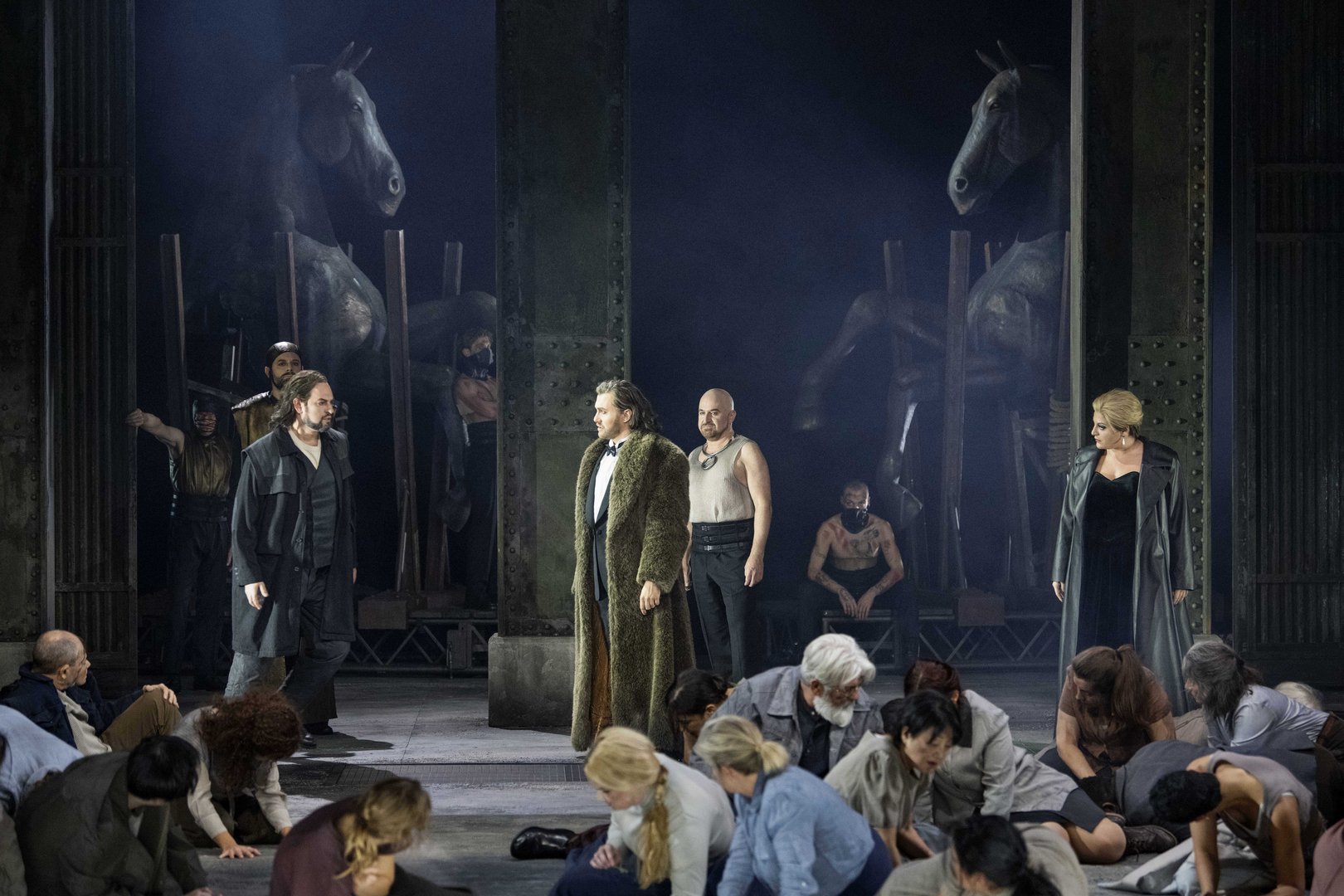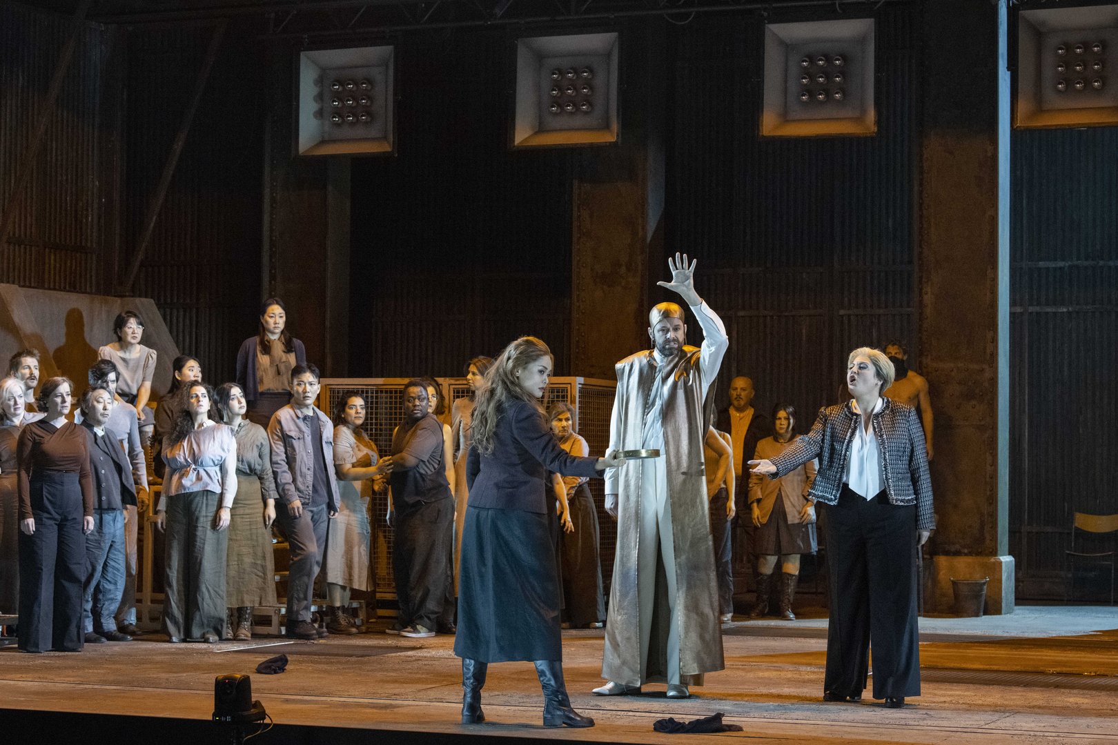 One might have suspected that having an experienced set designer directing a production, might lead to a privileging of the visuals over the personenregie. The good news, is that in Baur’s production, this is most definitely not the case. In this most choral of operas, he moves the cast around the stage with confidence, making every single person on stage a recognizable and vivid individual. He sets the action within a single, industrial set, very much in the modern day. There’s nothing recognizably Jewish in Baur’s staging; instead he attempts to universalize the narrative making it more about the actions of a group of people in a claustrophobic setting. That said, despite the confidence with which he moved the forces around the stage, it did leave me questioning who these people were and what their motivations were. In removing the work’s Jewishness, I’m not convinced that Baur replaces it with anything that illuminates the narrative and brings it to life. It made me reflect on Calixito Bieito’s staging of La Juive in Munich that I saw back in 2016. There, Bieito removed the visible Jewishness, but managed to universalize it by making the personal relationships so strong, reminding us that there’s more that unites us than divides us. Here, it felt much more abstract.