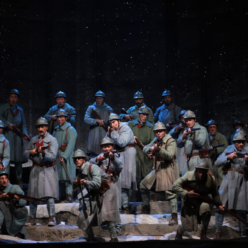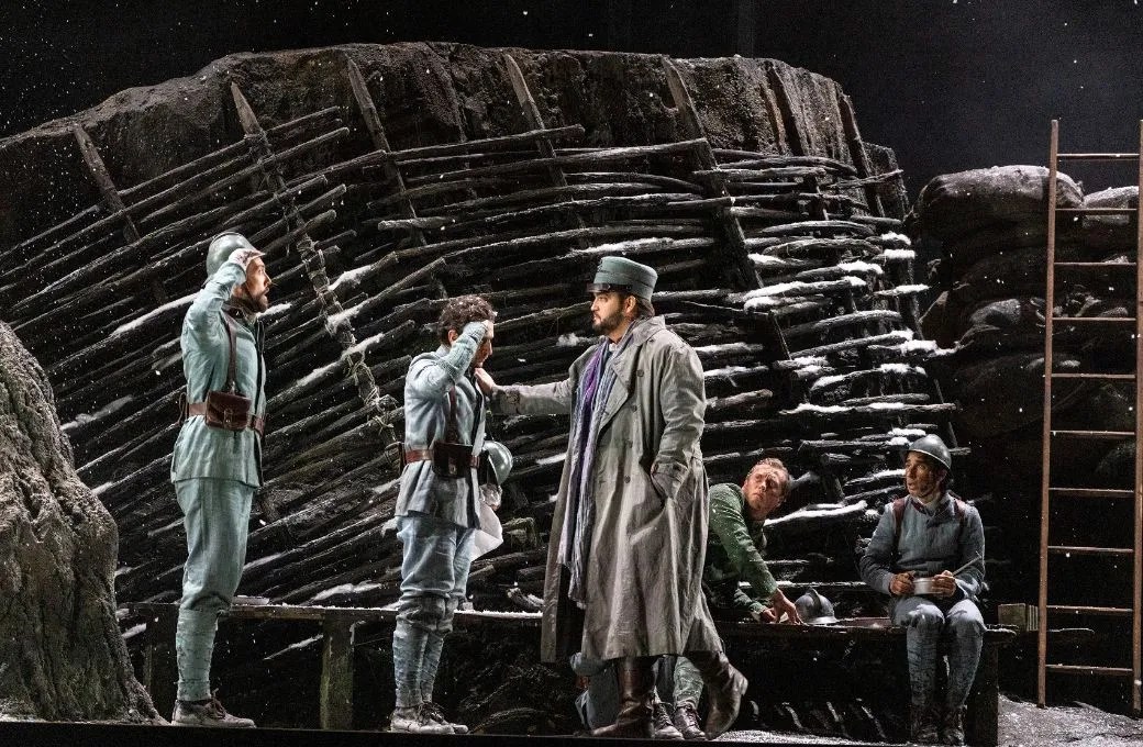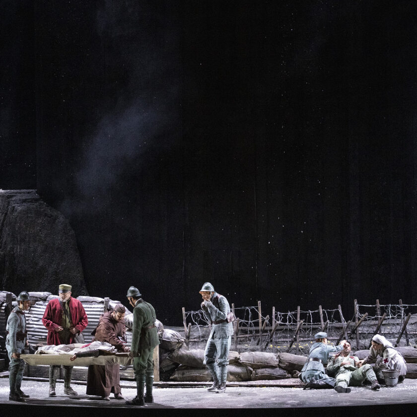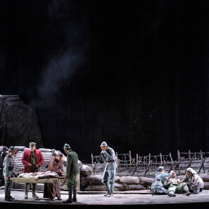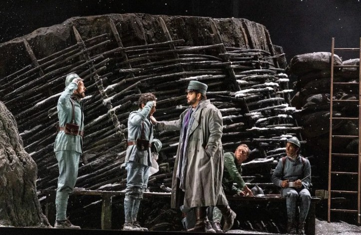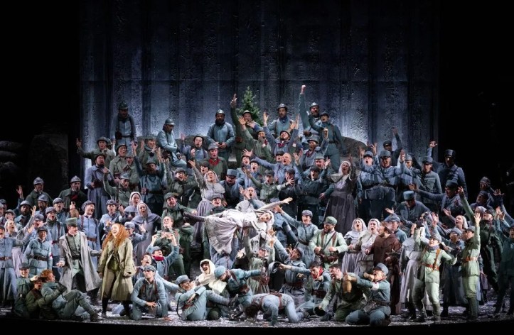 Muscato gives us an intriguing staging.  On surface level, in the earlier acts, one might think it rather picturesque.  The costumes, by Silvia Aymonino, were initially historical in nature.  Yet it became instantly clear that Moscato had something deeper in mind.  As Donna Leonora ruminated in her opening aria, we saw her leaving her bedroom to walk through a field of soldiers standing still.  The revolving set, by Federica Parolini, kept moving, suggesting that Leonora had no opportunity to control her fate.  Indeed, this idea of unchangeable destiny was a consistent figure of Moscato’s staging.  For each act, the action developed through a different historical period – Act 3 appeared, from the costumes, to be taking place during World War 1, while Act 4 saw a modern-day population begging for water.  I found this a compelling idea, that of a story that transcended time, reinforced by the revolving stage adding a circular nature to what we saw, reminding us that vendettas go around in circles until they find resolution.  That resolution, of course, could only be found in the closing pages with the demise of two of the main characters.