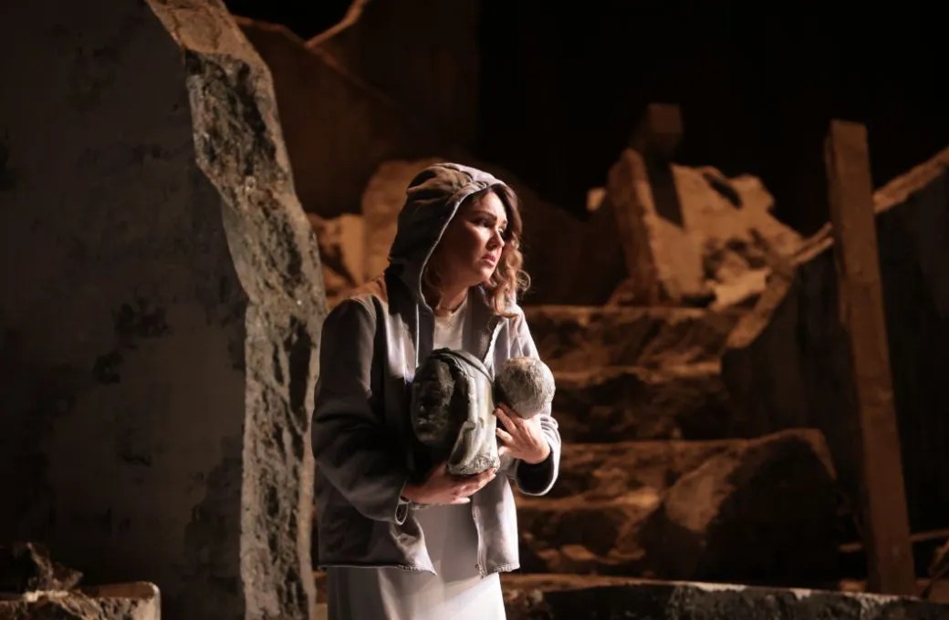 Personenregie was fairly conventional.  The revolving stage meant that there was continuous action for the principals, even if they were only parked on stage to emote to the front.  The chorus was also generally parked on stage, although they were invited to gyrate on occasion.  Moscato does give us some very striking stage pictures.  The way that Leonora entered a crypt under an altar at the end of Act 2, the stage covered in threatening-looking monks, was particularly memorable.  As indeed, was the way that she emerged out of the ruins of a building in a simple white dress to intone ‘pace, pace’ hieratically.  Moscato’s staging may initially feel quite conventional, but it does what it needs to do and provides a cogent framework for the action.  It might not give us any particularly new insights, or make us consider the deeper implications of the work, but Moscato tells the story clearly and it looks good.