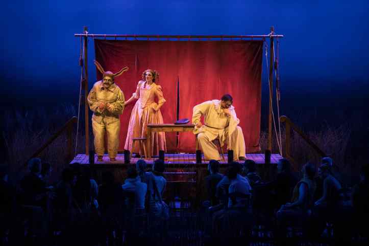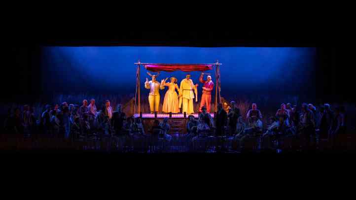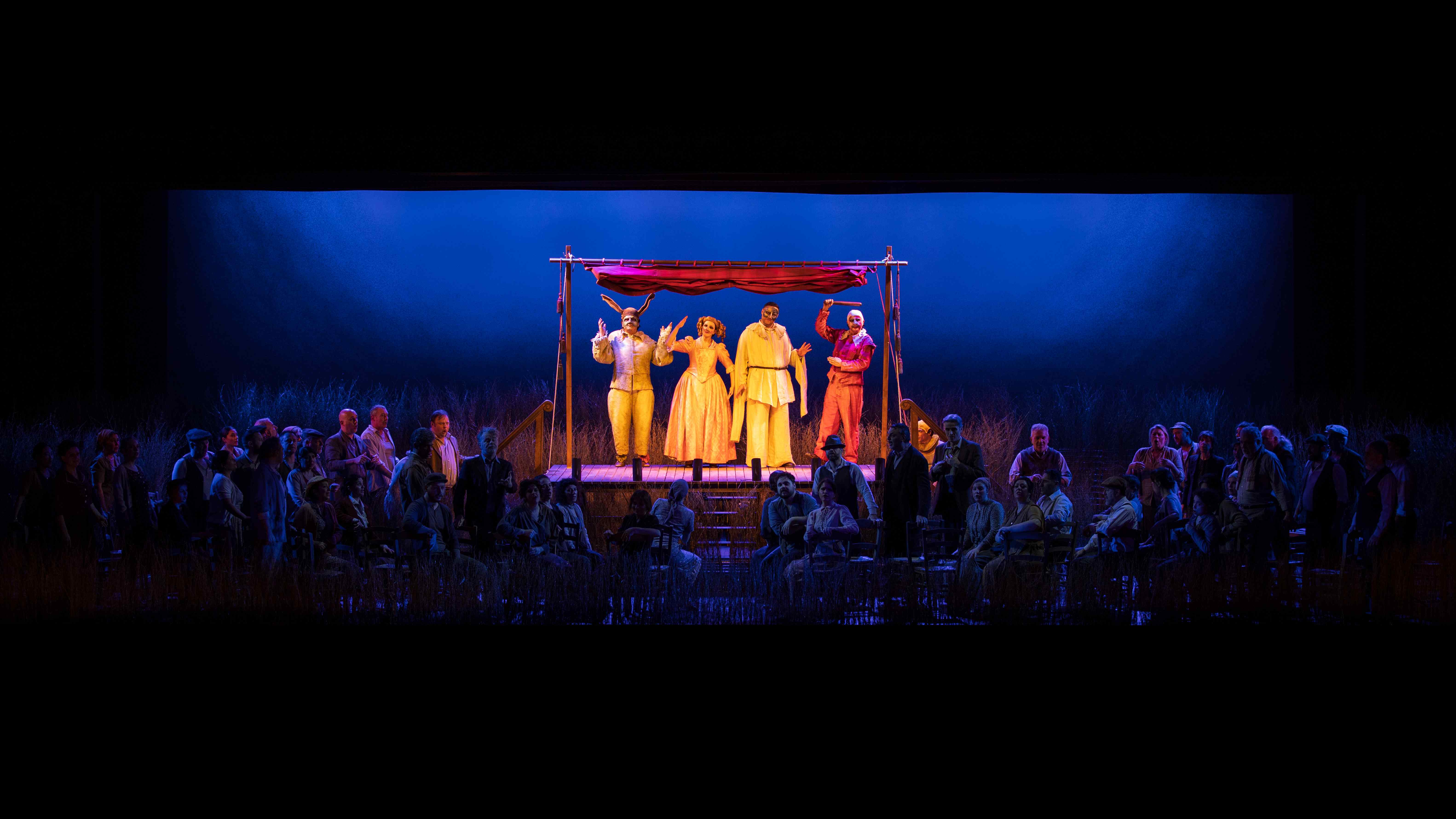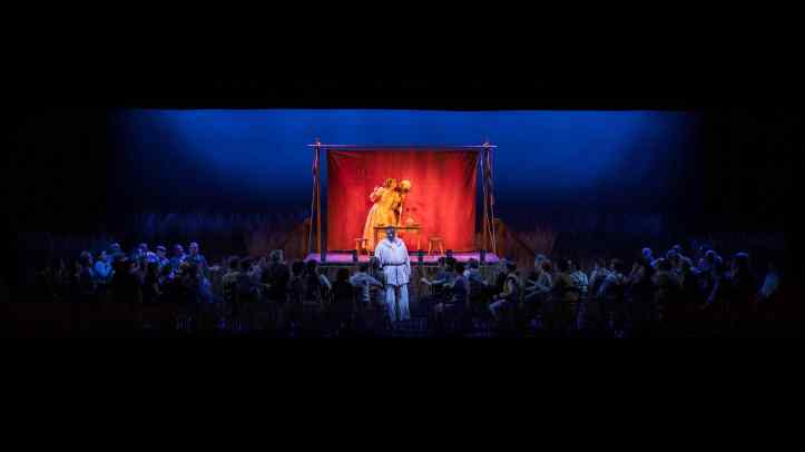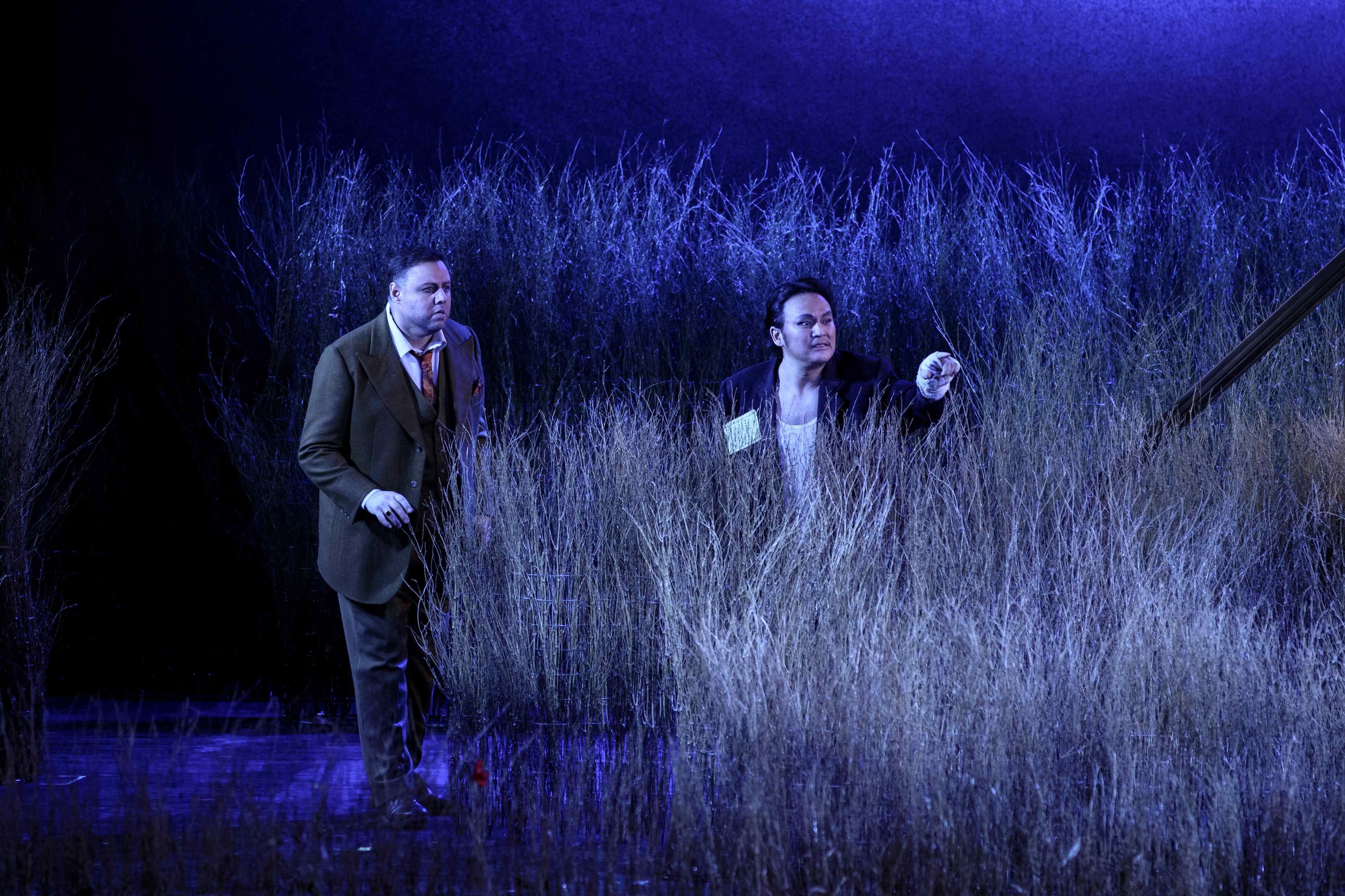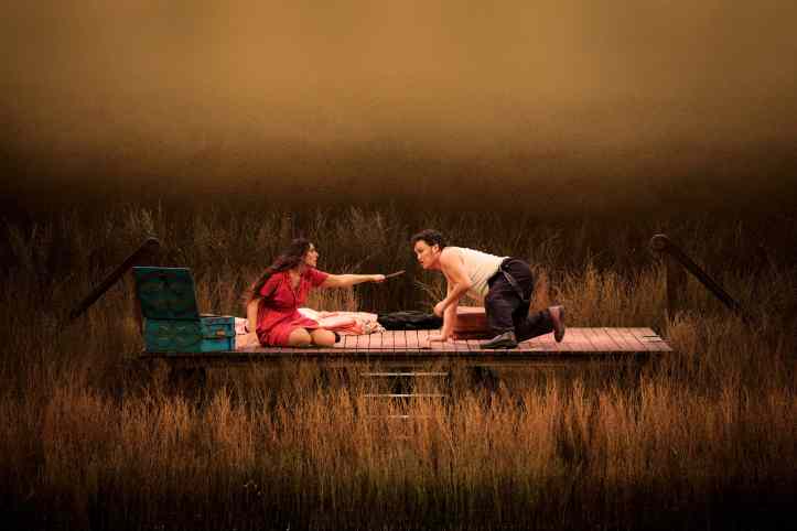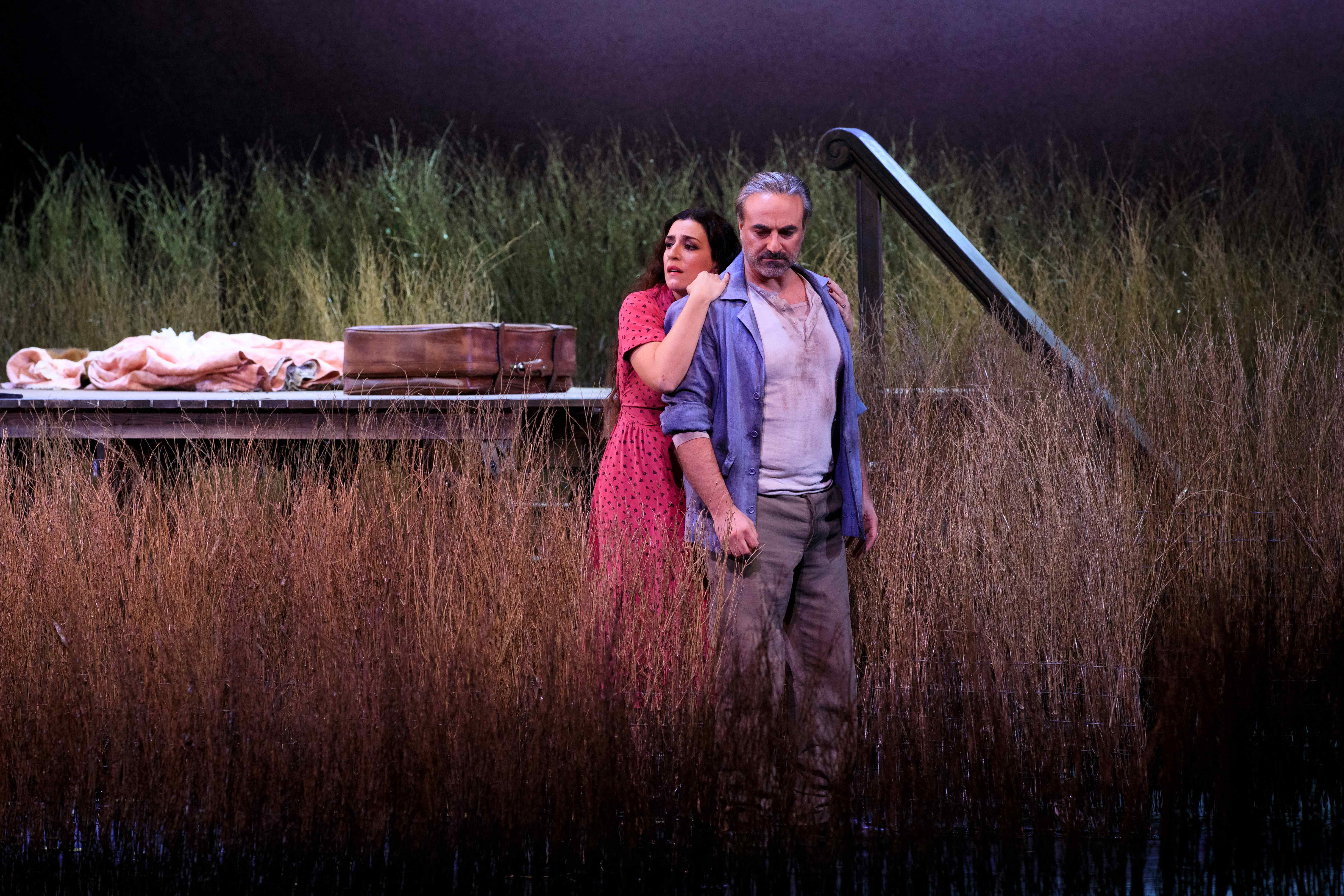 On entering the auditorium, the audience was confronted with an empty stage, with only a raised platform in the centre.  As the prelude started, the stage crew set about creating a pastoral scene on stage, creating fields of wheat in which the action took place.  This reminded us that this is very much a piece of small-town Italy, the excitement of the visiting troupe brought to life.  As a framework for that action, it was effective enough.  Although, unfortunately for Sinigaglia, her staging did not allow one to forget Damiano Michieletto’s outstanding production of this work, his love letter to small-town Italy, that I saw in Brussels.  Indeed, it felt that Sinigaglia’s handling of the chorus was a bit too self-consciously ‘stagey’, with lots of parking accompanied by emphatic hand gestures.  I do also wonder why she had a group of farmers accompany ‘vesti la giubba’ by waving scythes in the air, looking at the audience.  Was it to suggest that Canio was doomed to murder?  Was it that his suffering was known to him only, while the population went around its business?  It’s hard to know, but really did feel unnecessary and indeed distracting.  She also had Tonio brutally assault Nedda sexually in their big confrontation.  It was certainly striking, bringing out that Tonio was a powerful, psychopathic danger to her, but at the same time, did feel a bit gratuitous.  Still, on the whole Sinigaglia’s staging did what it needed to do and allowed the musical aspects to be front and centre, even though it didn’t eclipse memories of Michieletto’s much stronger staging.