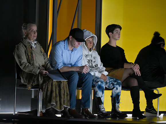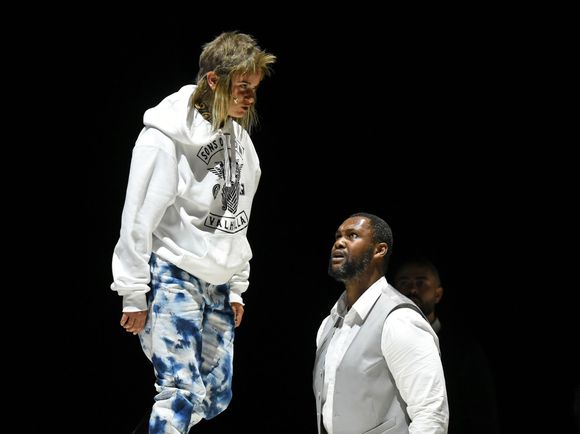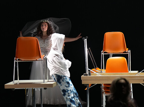 The remaining roles were taken, as at Aix, by actors from outside of the operatic tradition. Pablo Antonio Alvarado Mejía’s delivery of his lines was deeply affecting, finding a pain that struck deep. Sebastian Schiller was unflinching, constantly moving on stage, unable to sit still, while Bele Kumberger moved between speech and song, the words always forward. As the Teacher, Anke Sieloff, intoned her lines in sprechgesang with precision and in impeccable English, while Danai Simantiri was an eloquent stage presence. I found it interesting how Stöppler had Elisa Marcelle Berrod’s Iris initially stalk the stage, making us think she was the perpetrator, bringing an ambiguity to her stage presence that was deeply disturbing. That said, I did find Berrod’s delivery of her lines to lack ideal clarity of diction – perhaps it was the amplification, but her lines lost impact due to the lack of clarity.